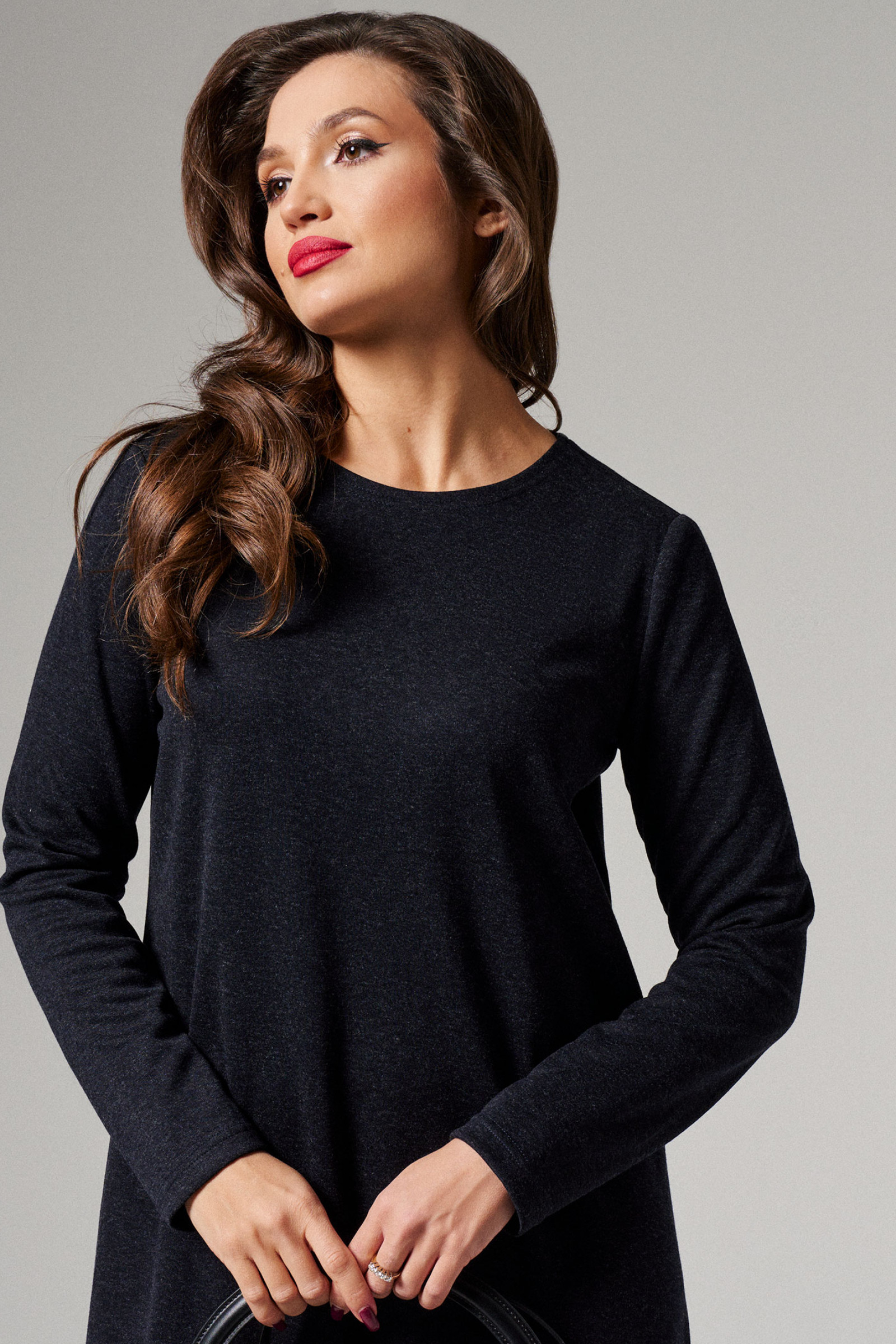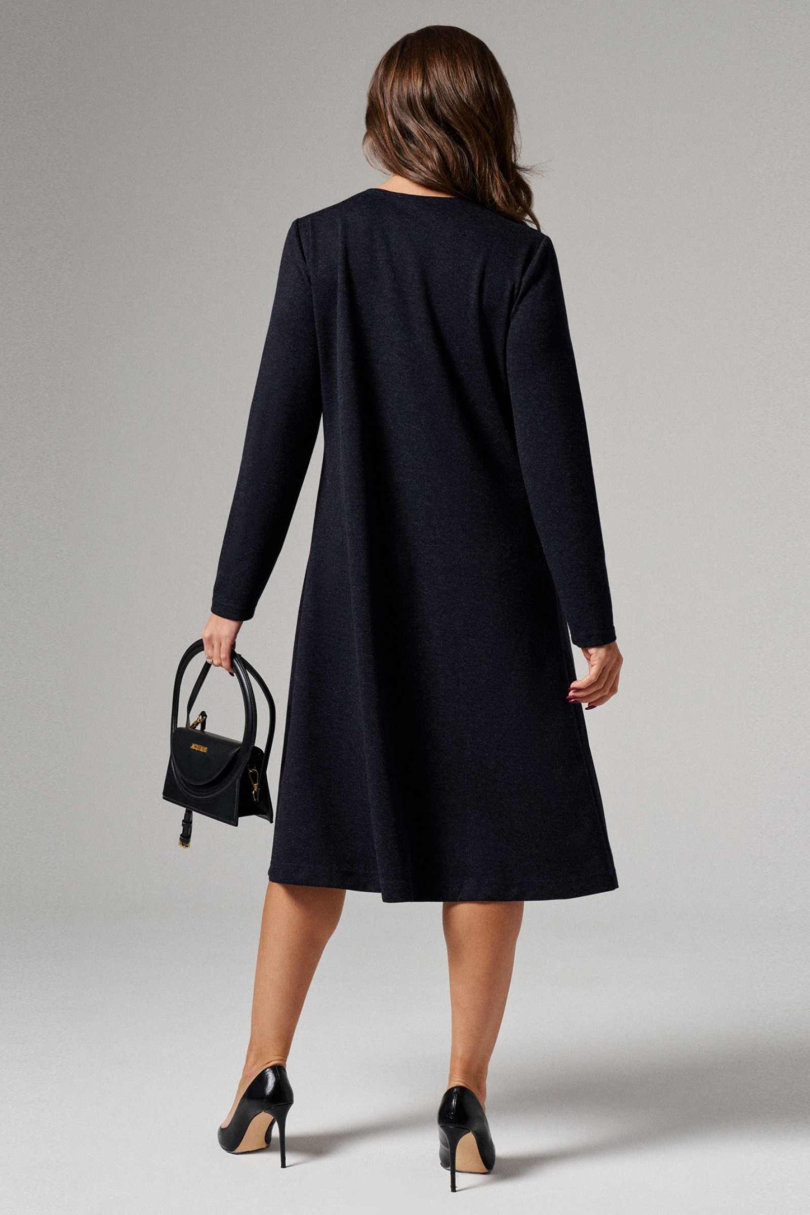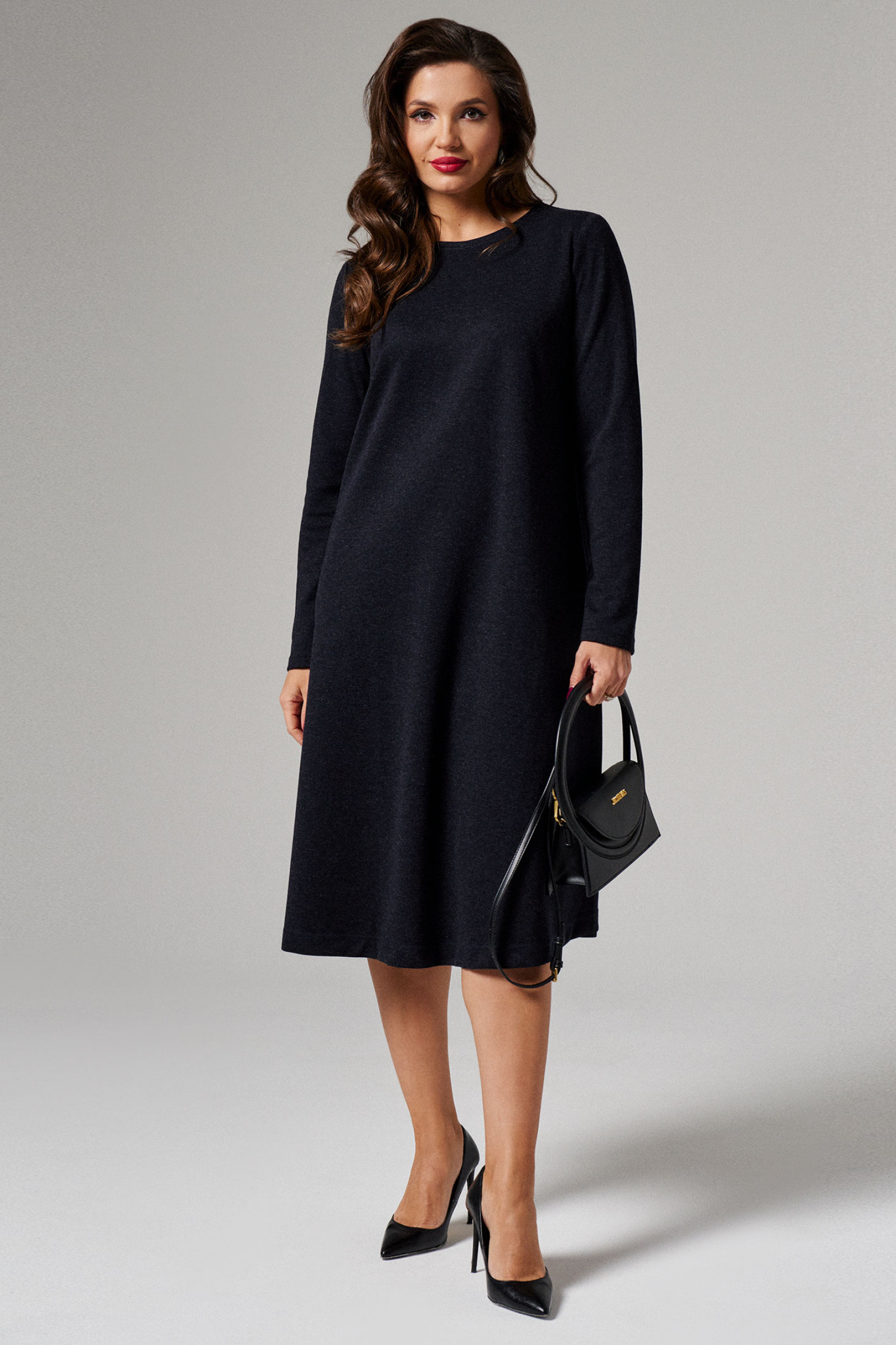 Платье женское из трикотажного полотна для повседневной носки. Без подкладки. Платье длинное, расширяющееся к низу. Горловина круглая, рукав длинный.