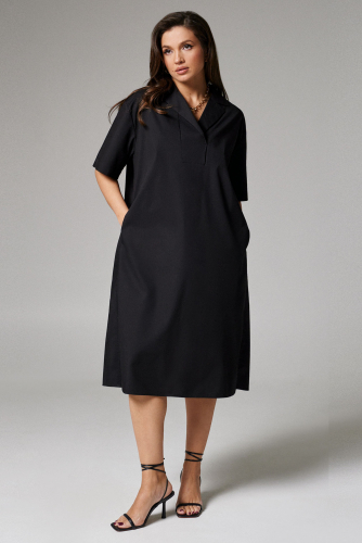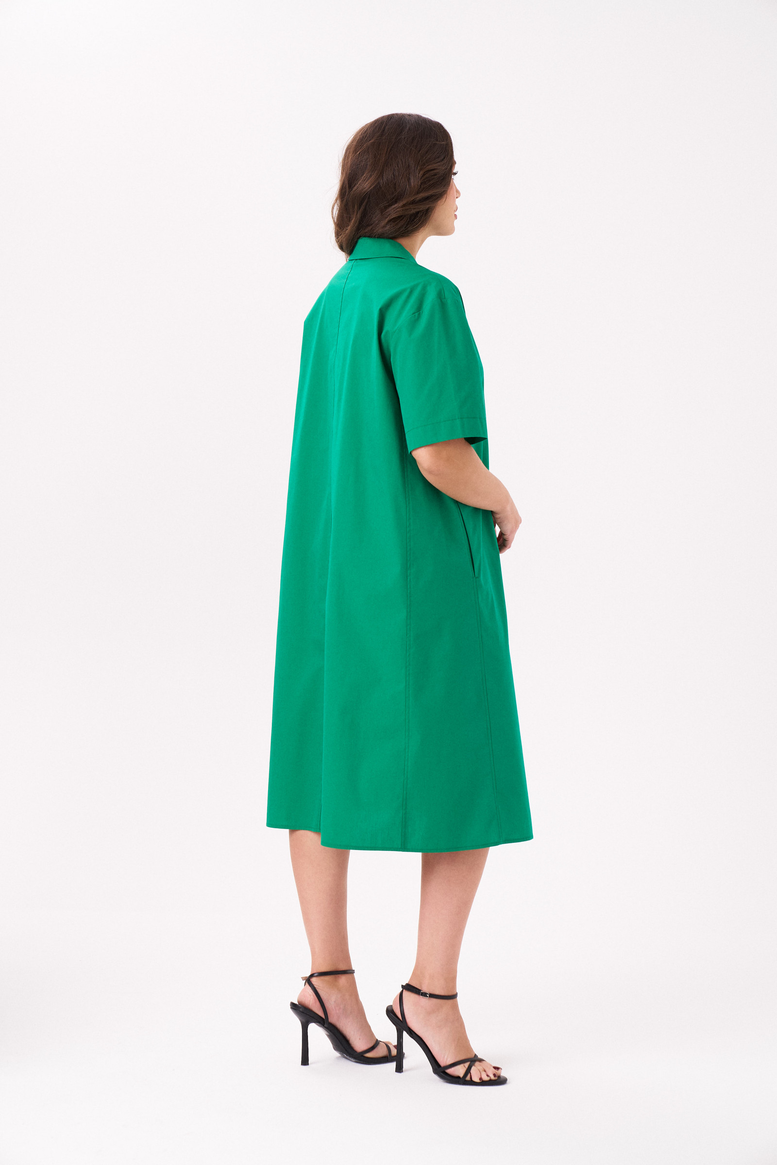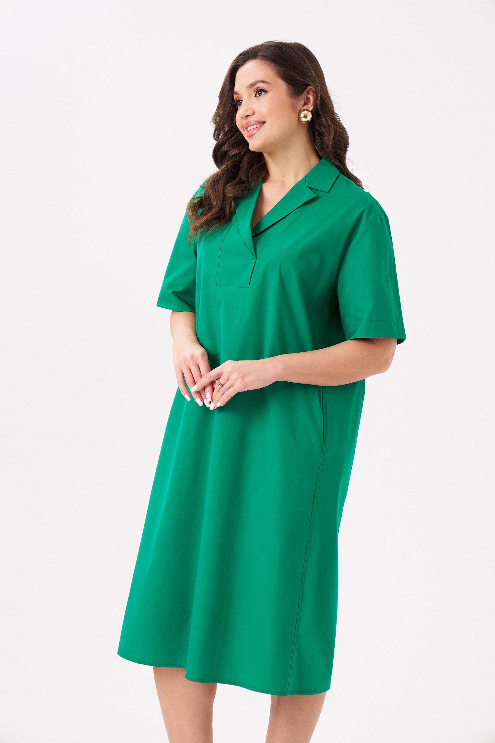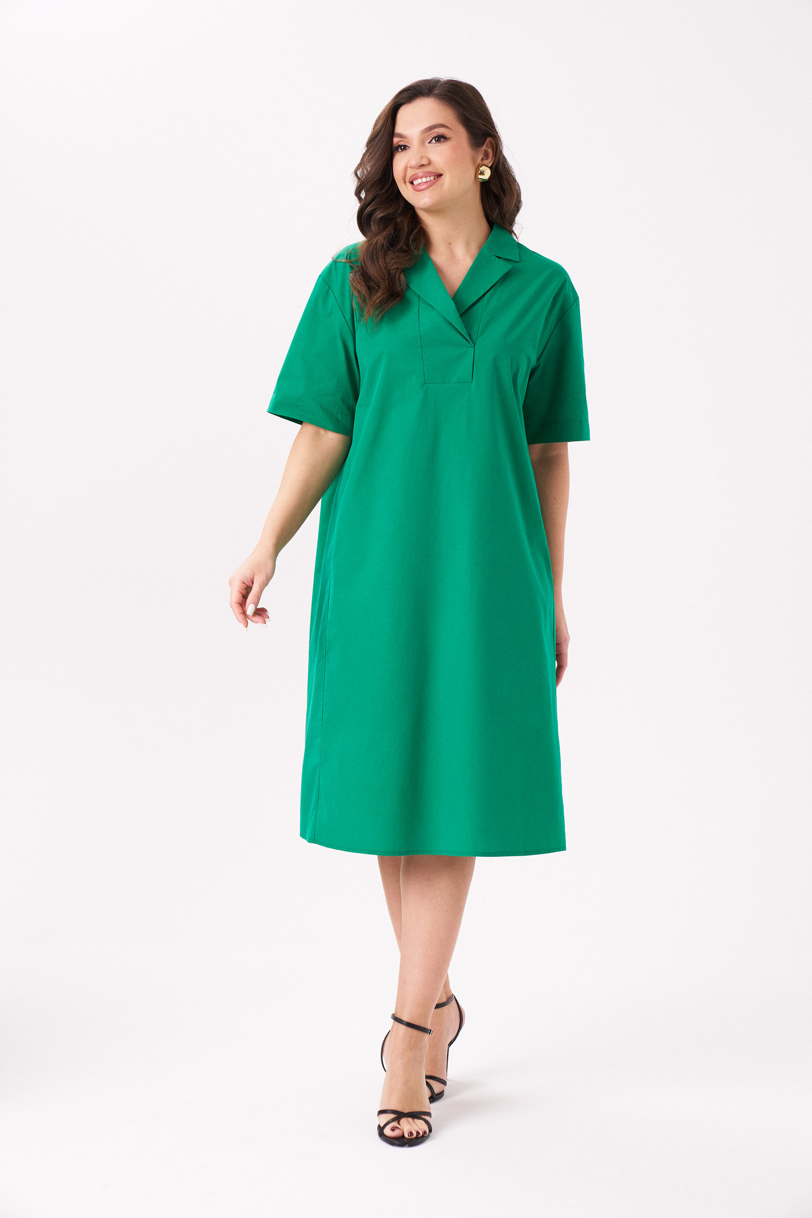 Платье женское хлопковое для повседневной носки. Без подкладки. Платье свободное, расширяющееся к низу, с укороченным рукавом. Воротник с лацканом. На передней части платья прорезные карманы.