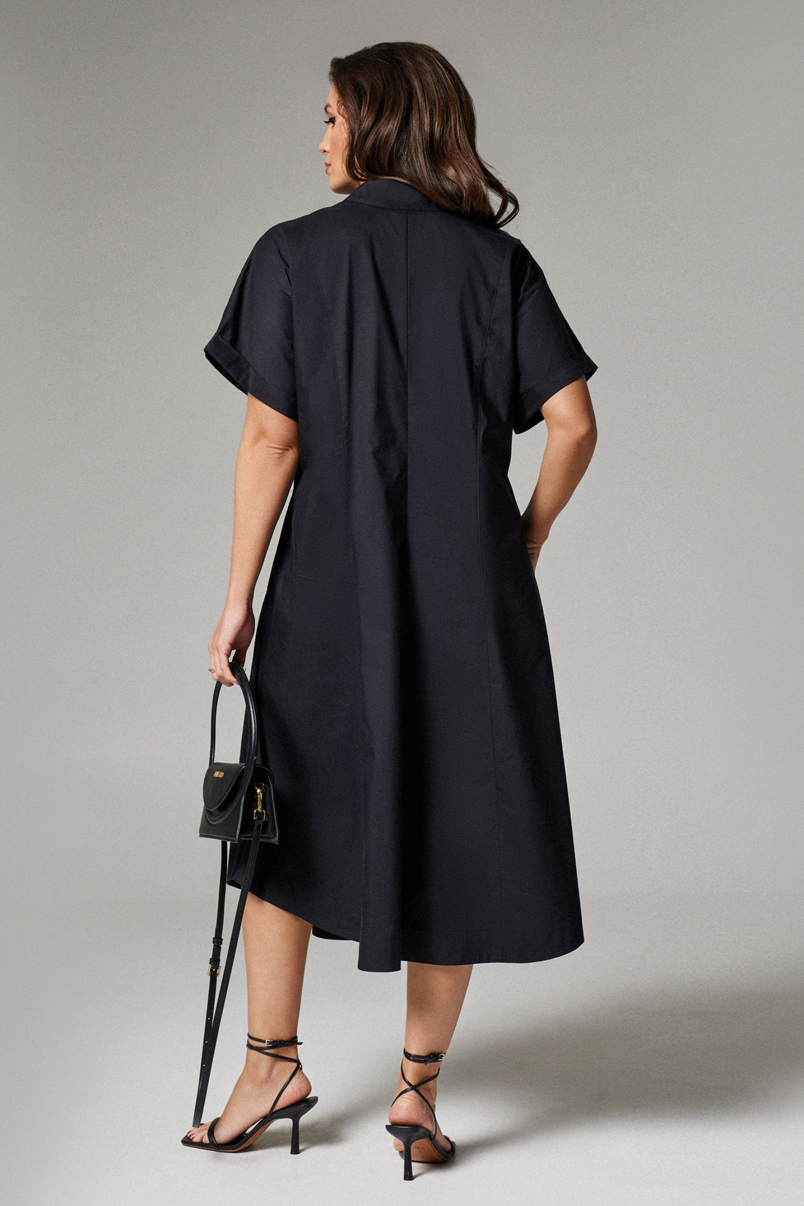 Платье женское из хлопковой ткани для повседневной носки. Силуэт полуприлегающий с укороченным цельнокроеным рукавом. Рукав оформлен отложной манжетой. По переду и спинке рельефные швы. Застежка фронтальная на пуговицы. Платье с прорезными карманами в боковых швах.
