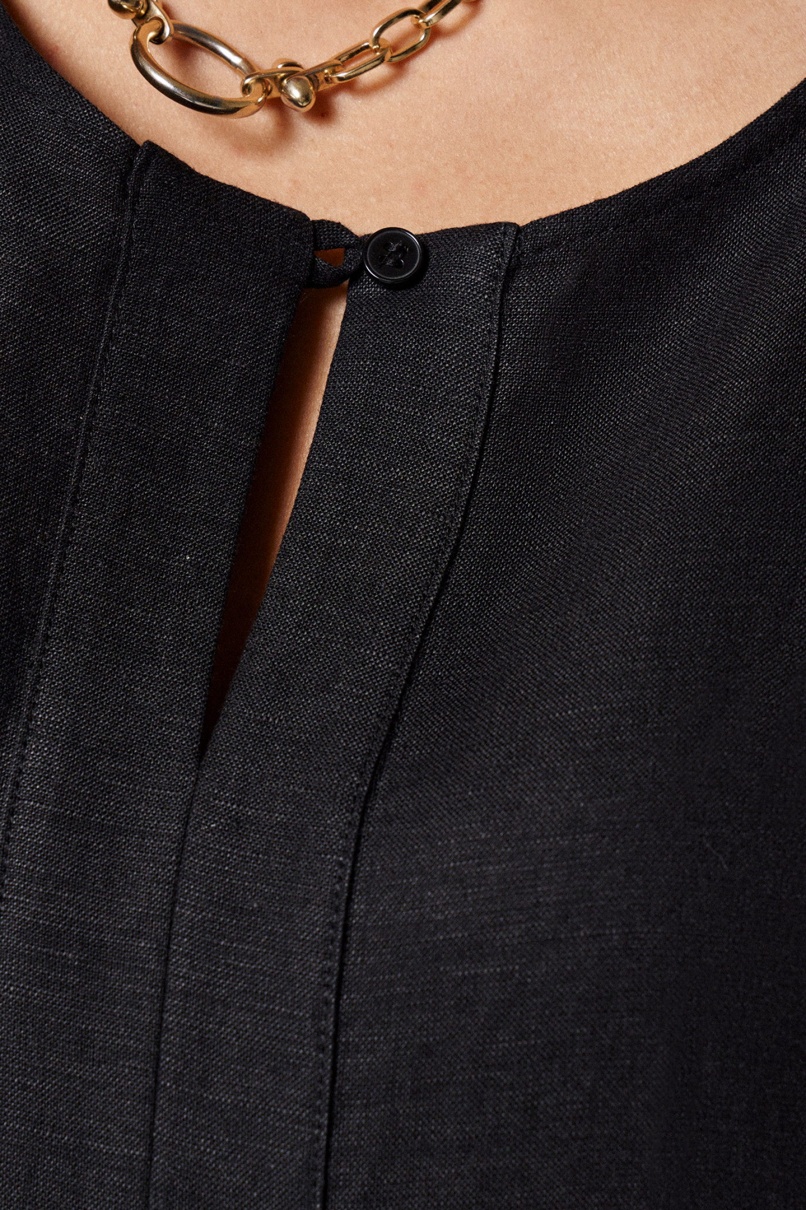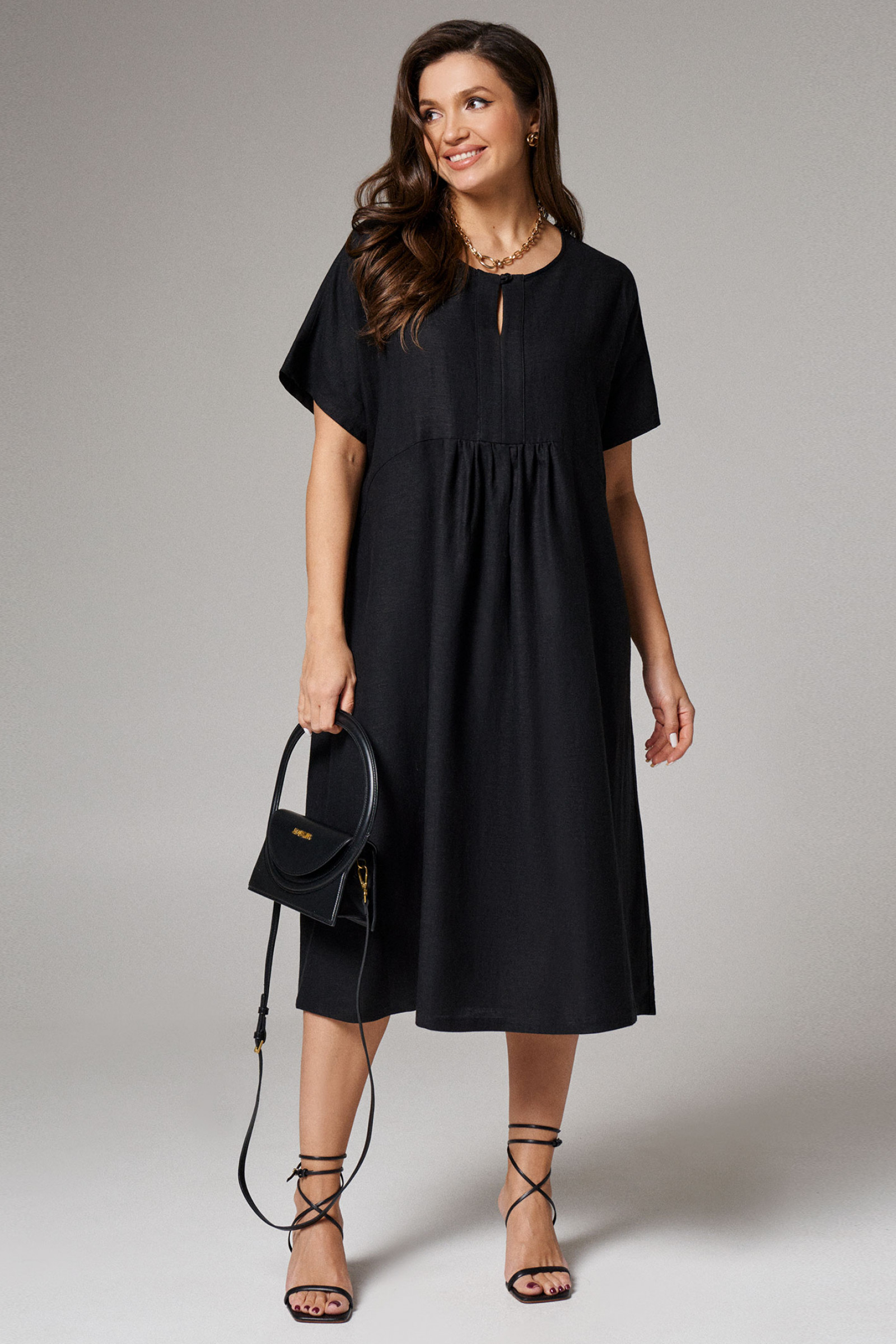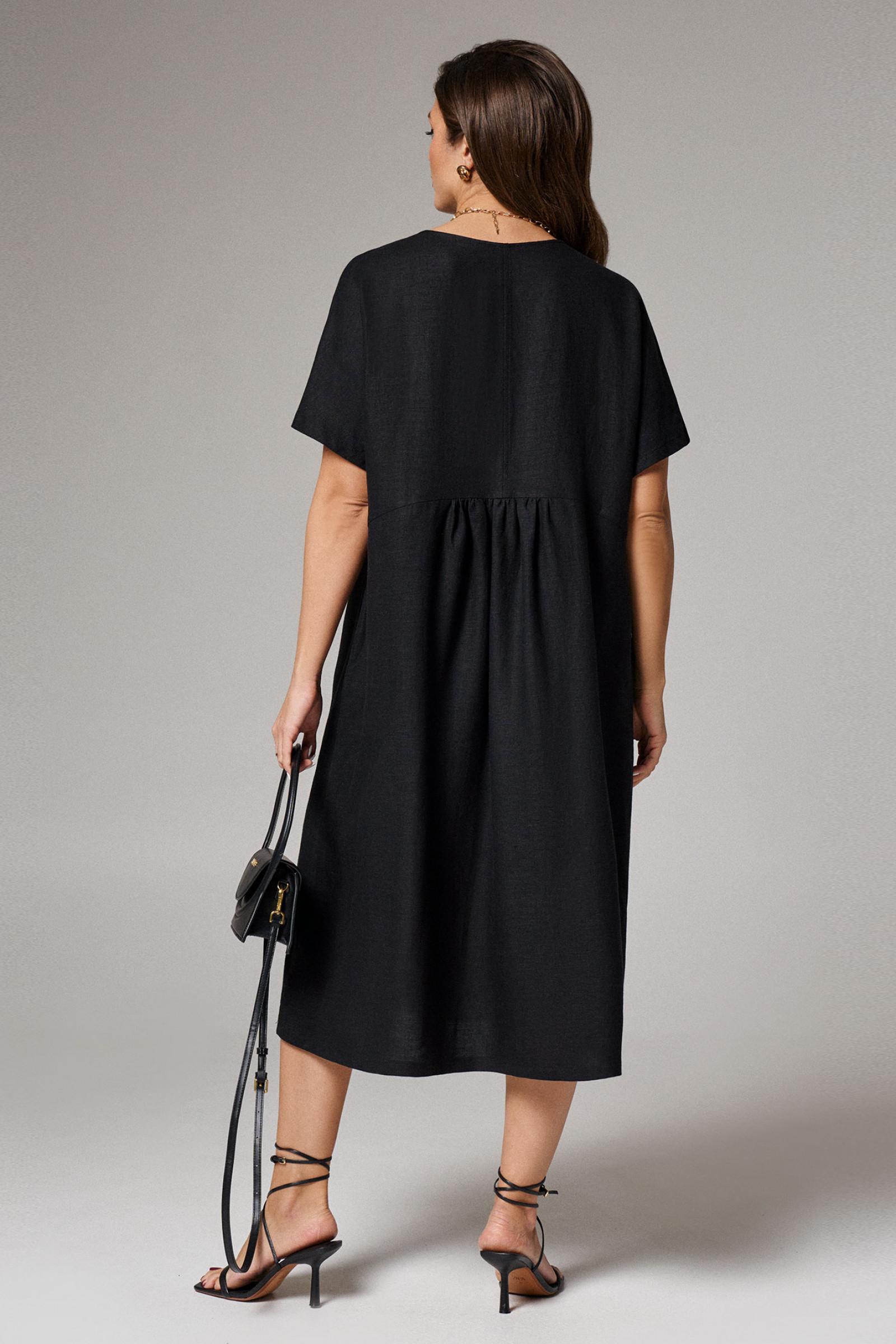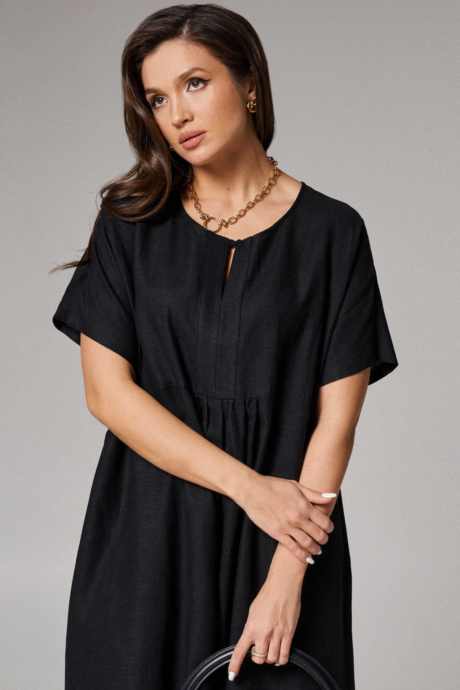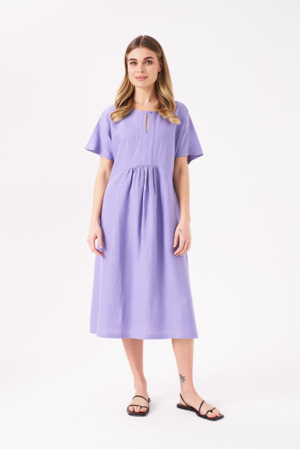 Платье из льняной ткани для повседневной носки. Изделие свободного силуэта с подрезом под груудью. Рукав короткий цельнокроеный. Горловина круглая. Ддина изделия до середины голени.