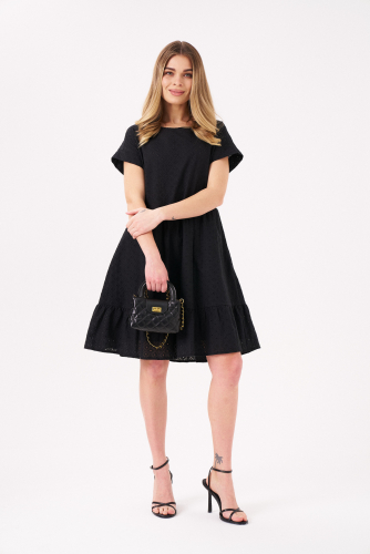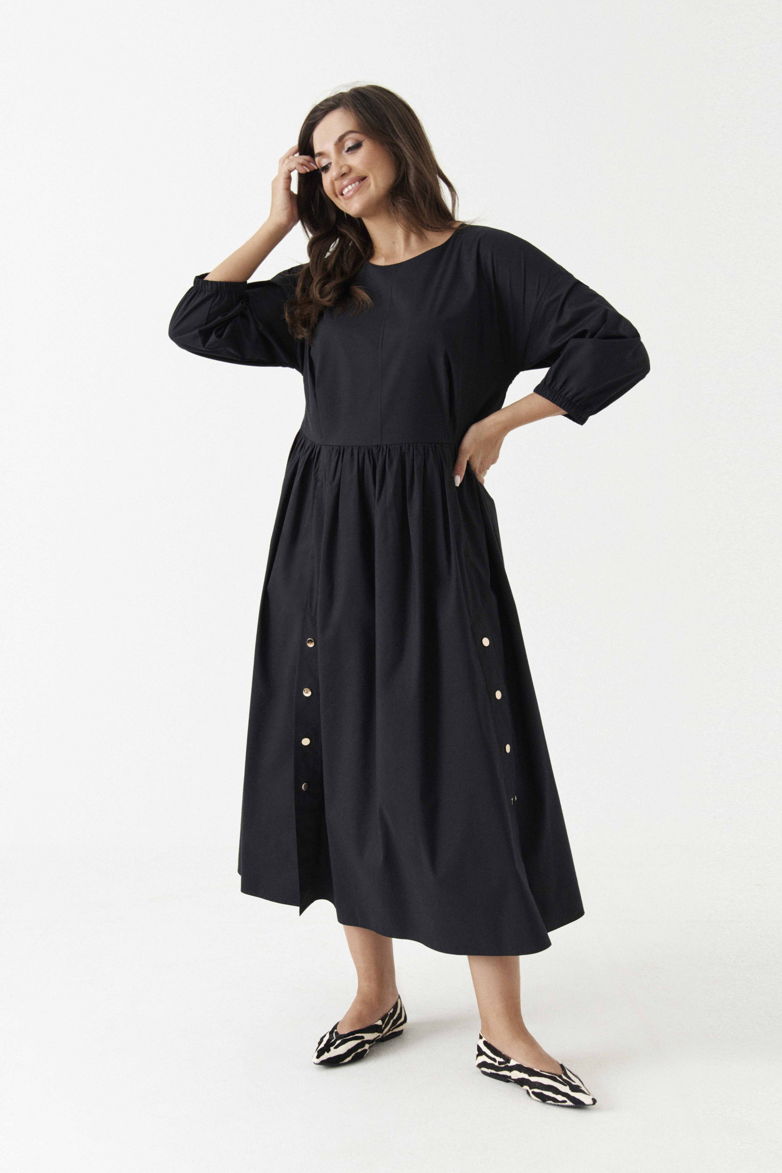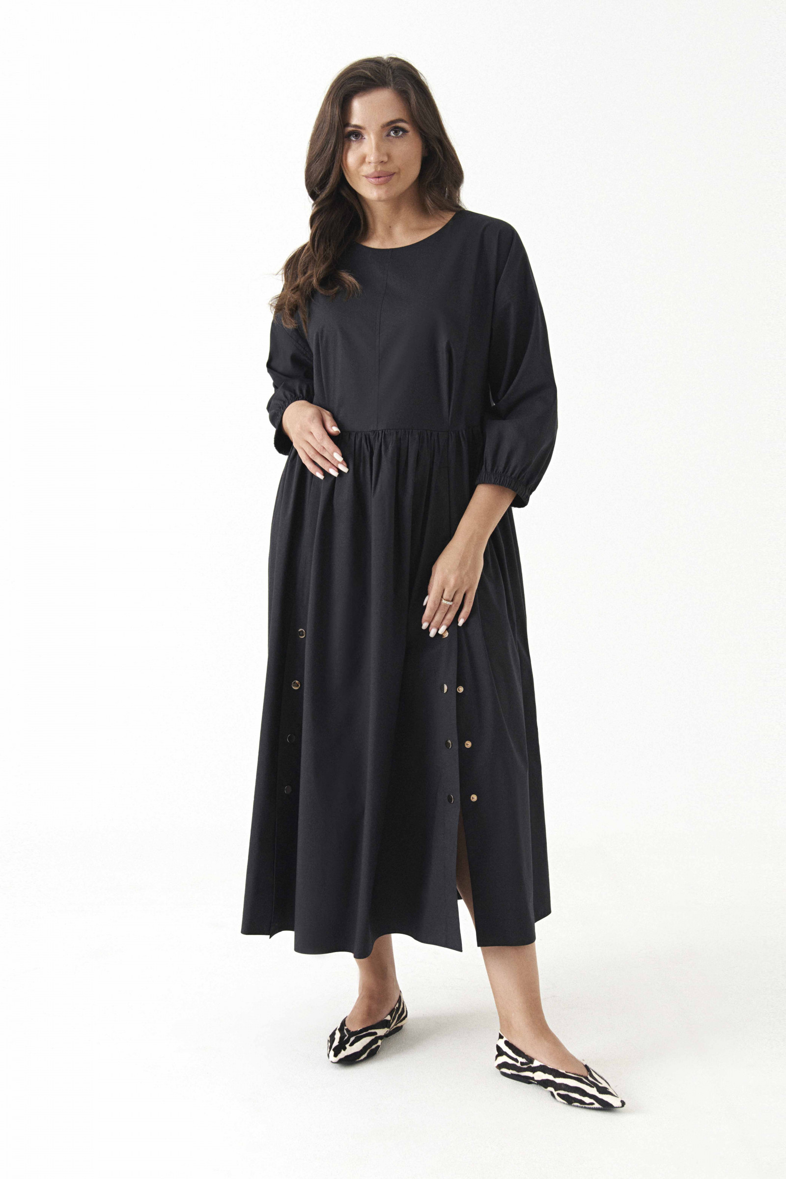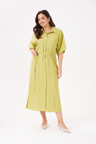 Платье из хлопковой ткани для повседневной носки. Платье А- силуэта с укороченным втачным рукавом оформленным притачной манжетой на резинке. Изделие отрезное по талии. В боковых швах прорезные карманы. Длина изделия до середины голени.