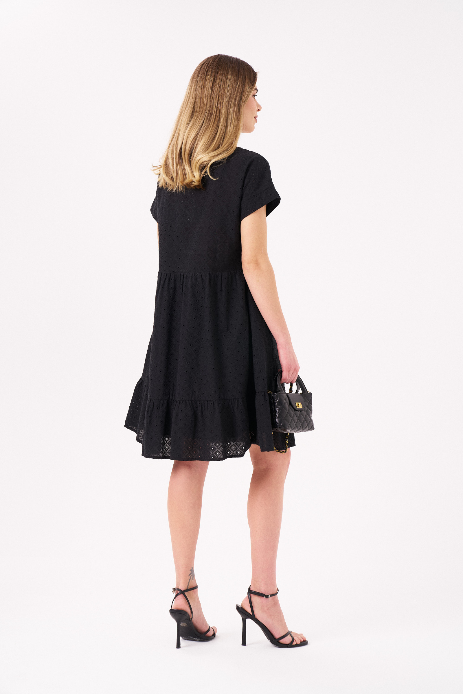 Платье женское из хлопковой ткани для повседневной носки. Изделие А- силуэта на хлопковой подкладке с коротким цельнокроеным рукавом, оформленным притачной манжетой. Платье с двумя отрезными воланами. Длина изделия до колена.
