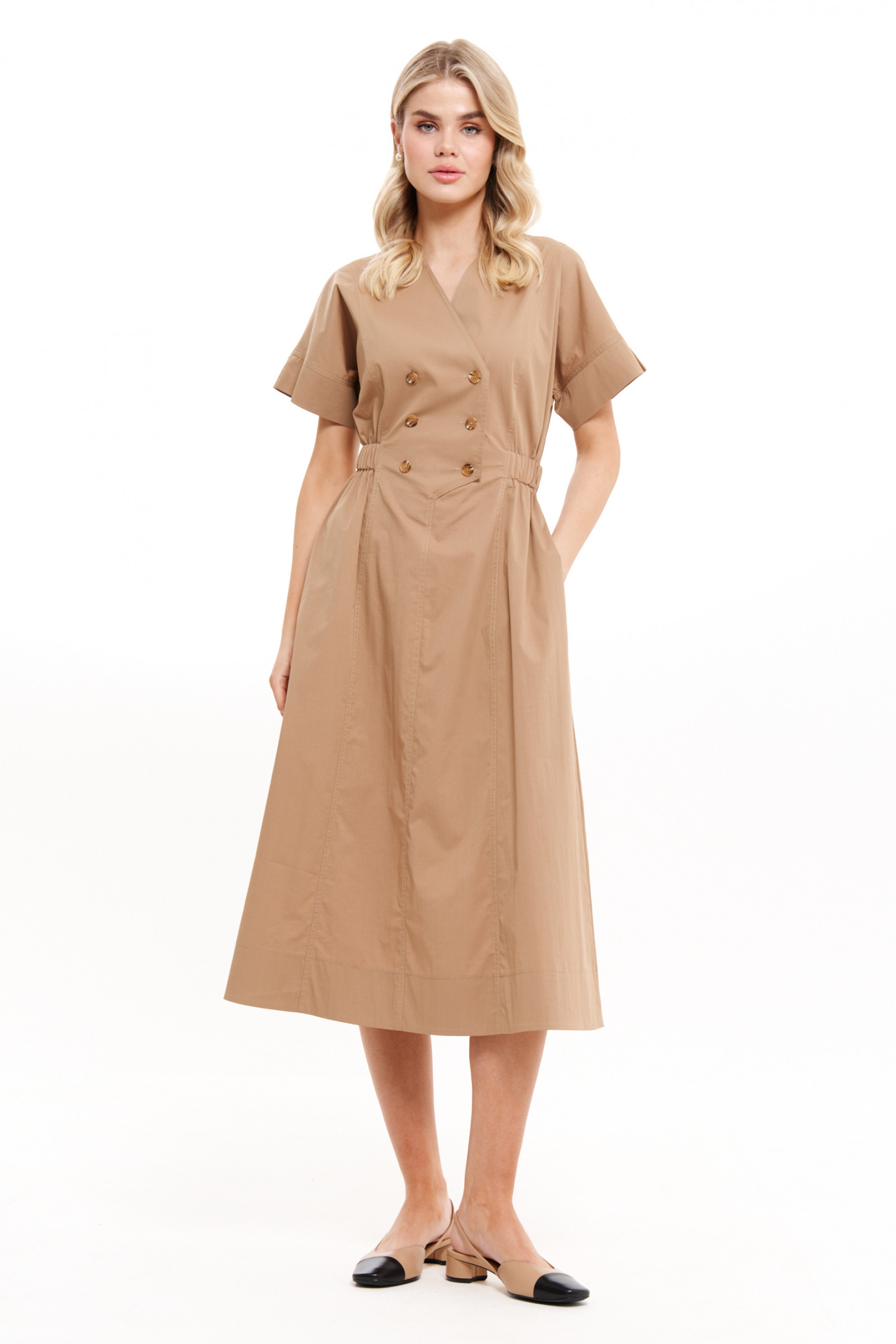 Платье прекрасно садится по фигуре благодаря резинке на талии, повторяя изгибы тела и подчеркивая женственные линии. Вертикальные рельефы на передней части визуально стройнят, а потайные боковые карманы делают модель удобной для повседневного использования. Бежевый оттенок подчеркивает естественную красоту и гармонирует с любыми аксессуарами.