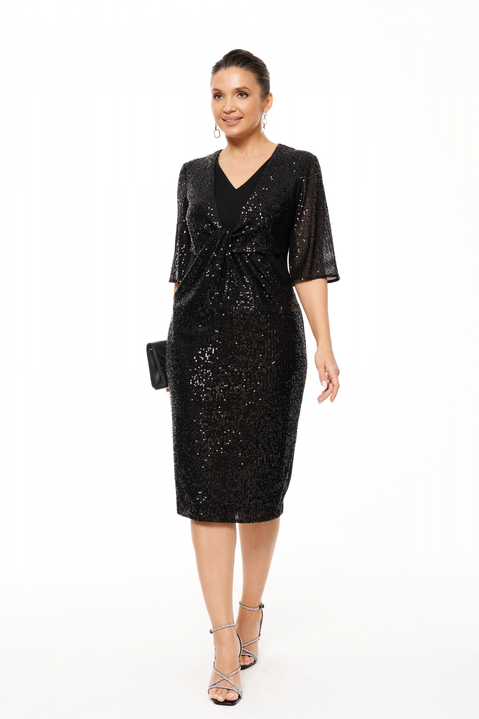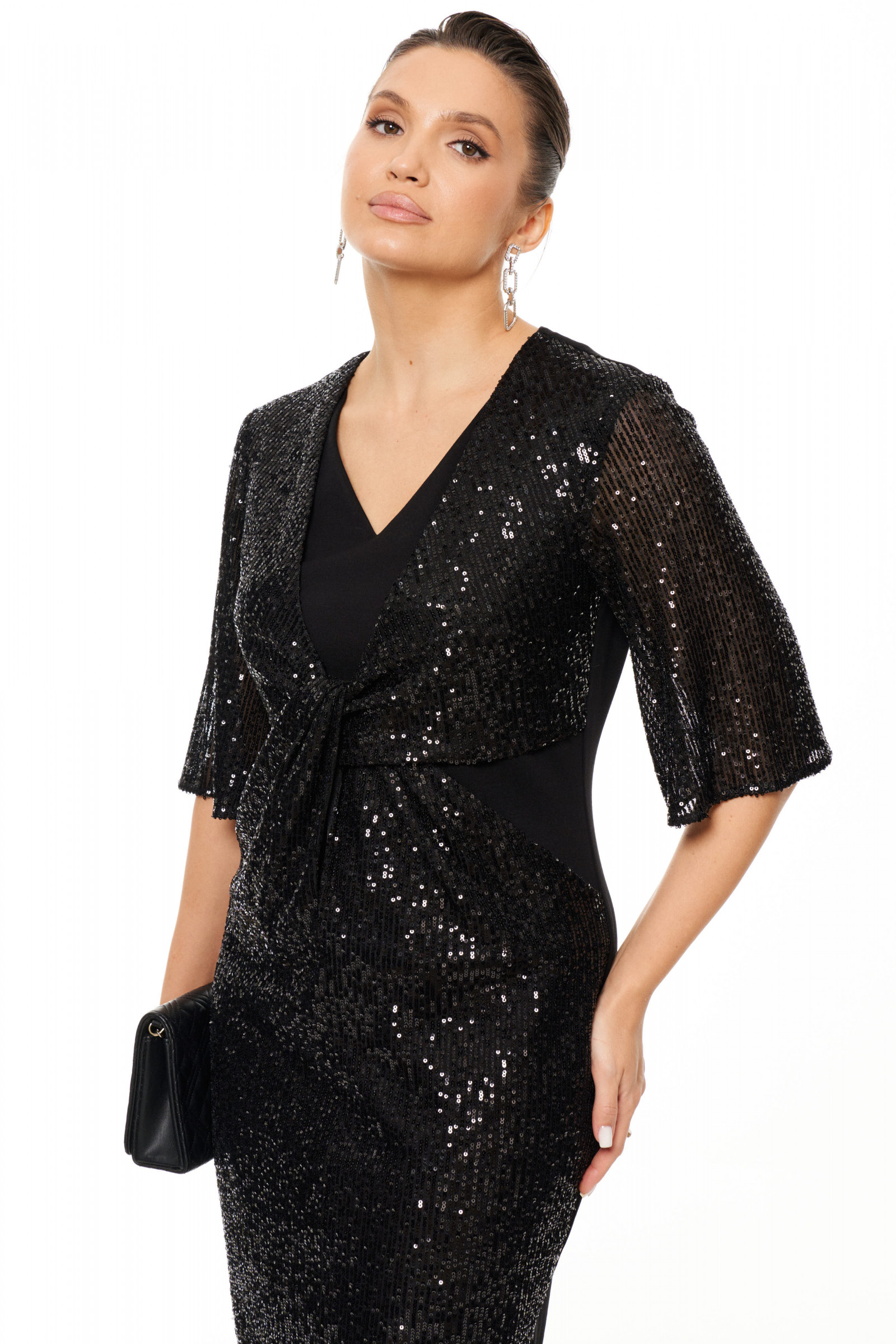 Платье женское полуприлегающего силуэта для торжественных мероприятий. Перед имеет перекрут с отрезной частью переда и низа изделия. В целом платье из трикотажного полотна, а отрезная часть переда и рукава из пайеток. Спинка со средним швом и с двумя талиевыми вытачками, в среднем шве имеется шлица. Горловина V-образная. Рукава длиной до локтя. Платье на подкладке. Очень изящное и элегантное платье, с которым вы всегда будете в центре внимания.