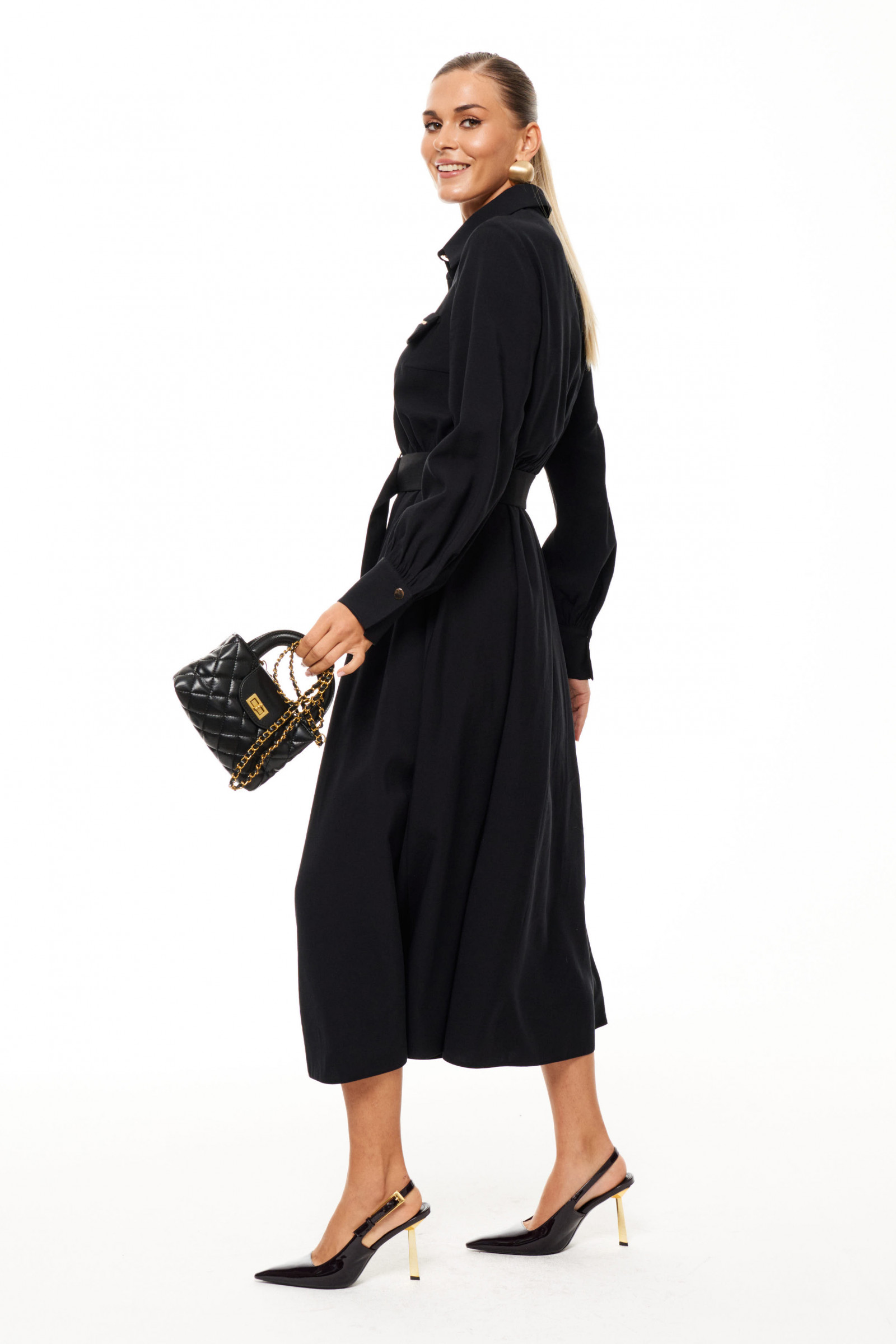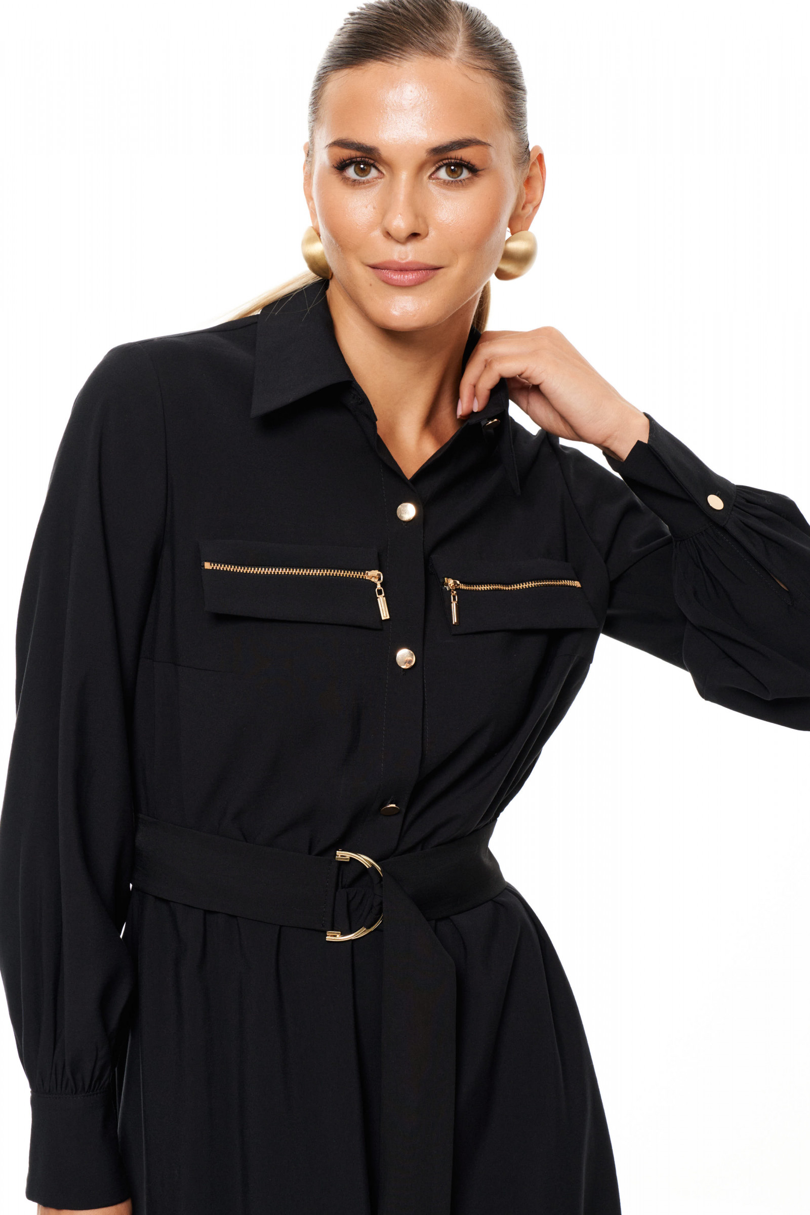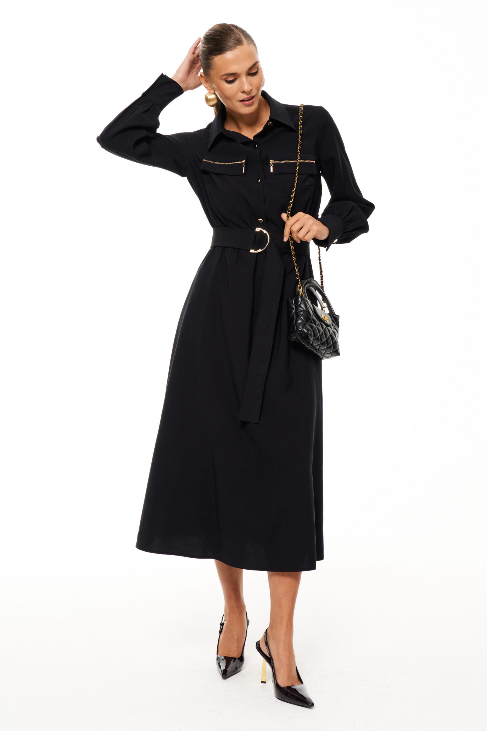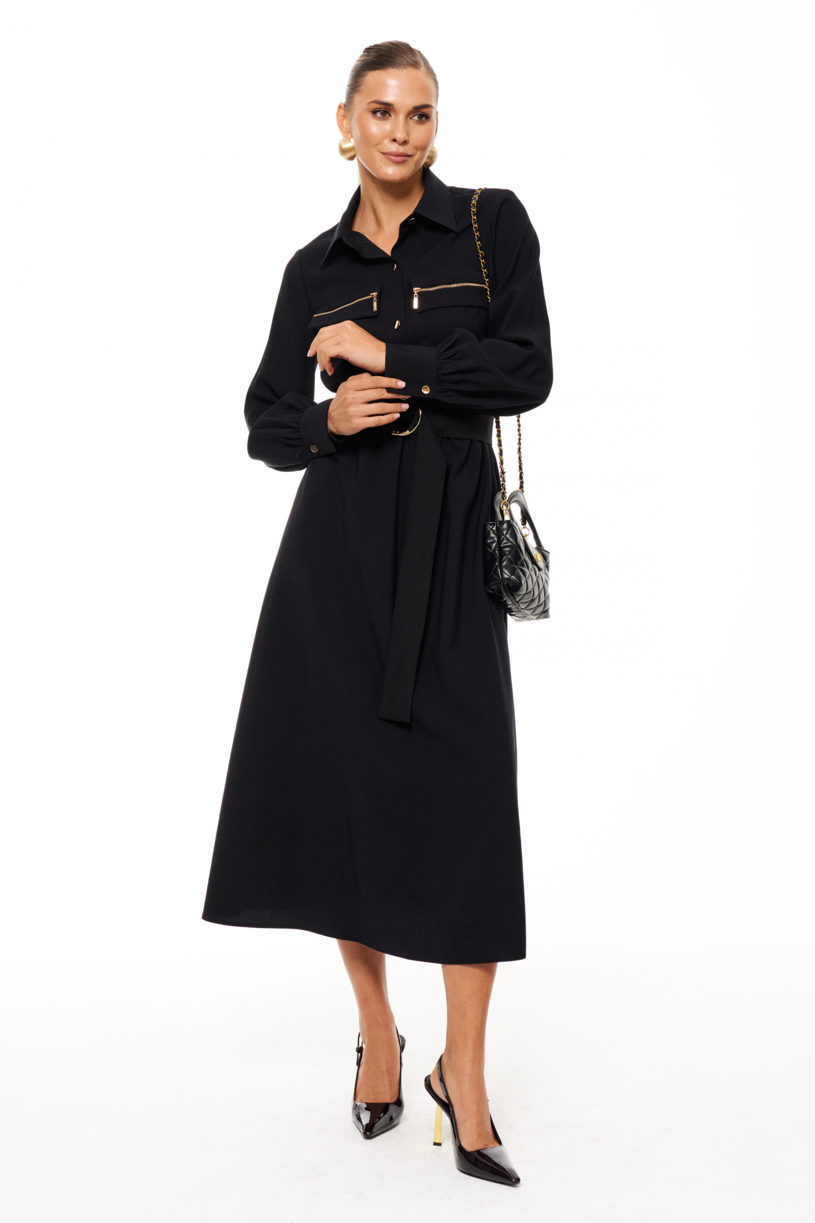 Юбка разведена трапецией, что добавляет изделия нарядный вид и обеспечивает свободу движения. Длина рукава полноценная, что делает платье идеальным для осеннего сезона. Передняя часть платья украшена двумя настрочными клапанами с металлическими молниями, добавляющими современный стильный акцент. Вся фурнитура, включая текстильный ремень на полукольцах, выполнена из металлического материала золотого цвета, что придает изделию дополнительную элегантность.