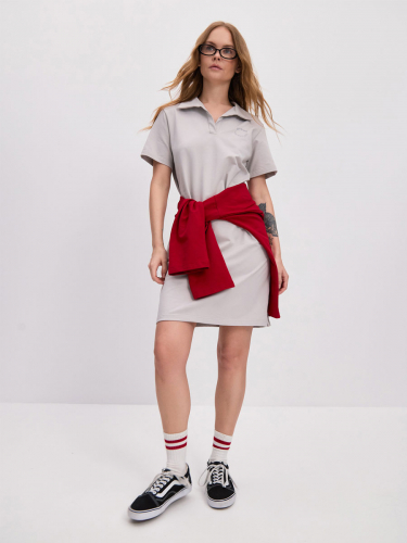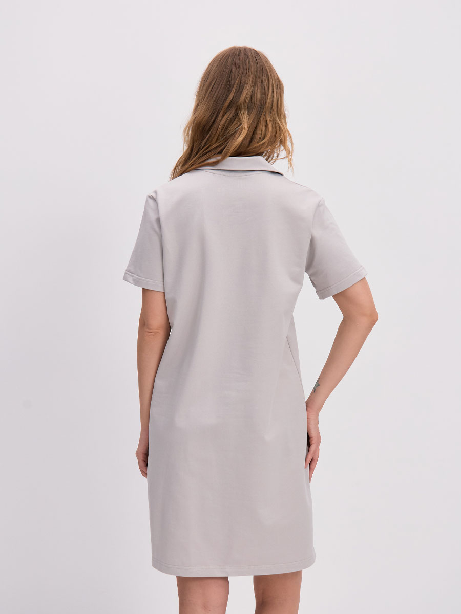 Женское платье с застежкой «поло» из футера 2-х нитка петля, с втачным рукавом и воротником. Горловина по спинке обработана с помощью киперной ленты. Низ платья и низ рукава обработаны на плоскошовной м-не. По боковым швам платья внизу – разрезы.