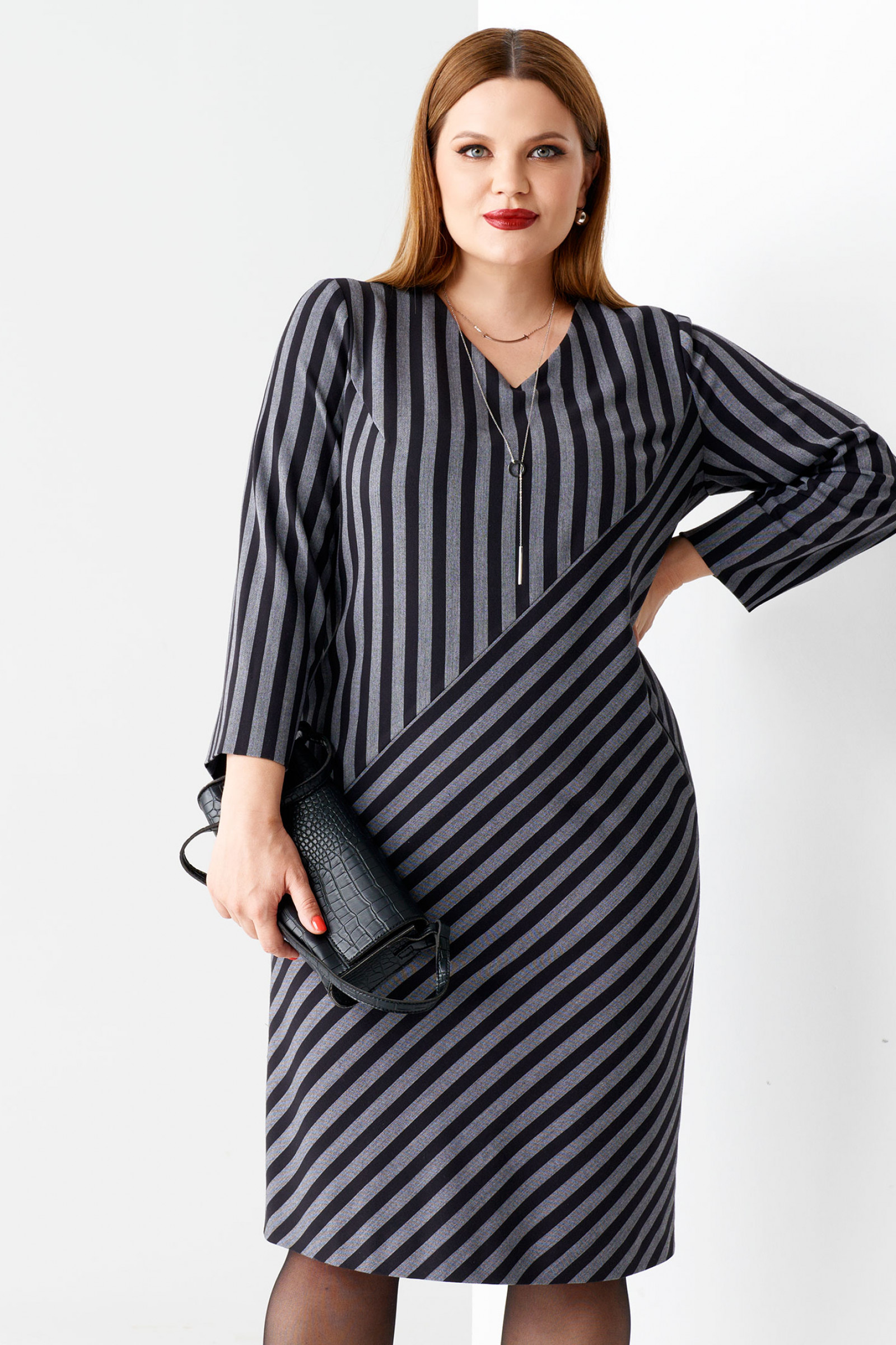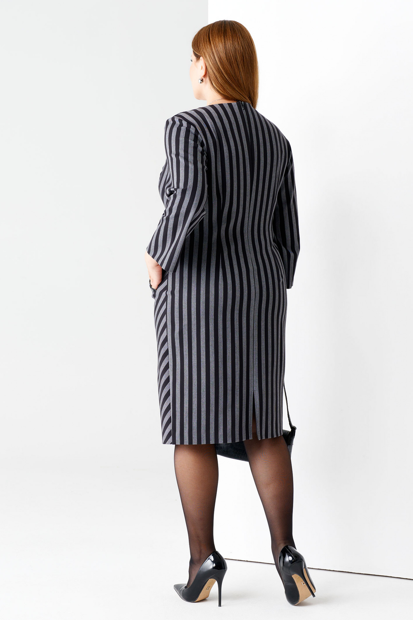 Стильное и лаконичное платье выполнено из мягкой костюмной ткани в полоску. Вырез горловины треугольный,рукав втачной ,3/4,с отложным манжетом по низу. По переду выполнен косой рез.Игра полос стройнит фигуру и придаёт ей динамику . По левому боку выполнен прорезной карман. Сзади платье застёгивается на потайную молнию,расположенную в среднем шве спинки.Такое платье прекрасно подойдёт стильной девушке для работы в офисе .