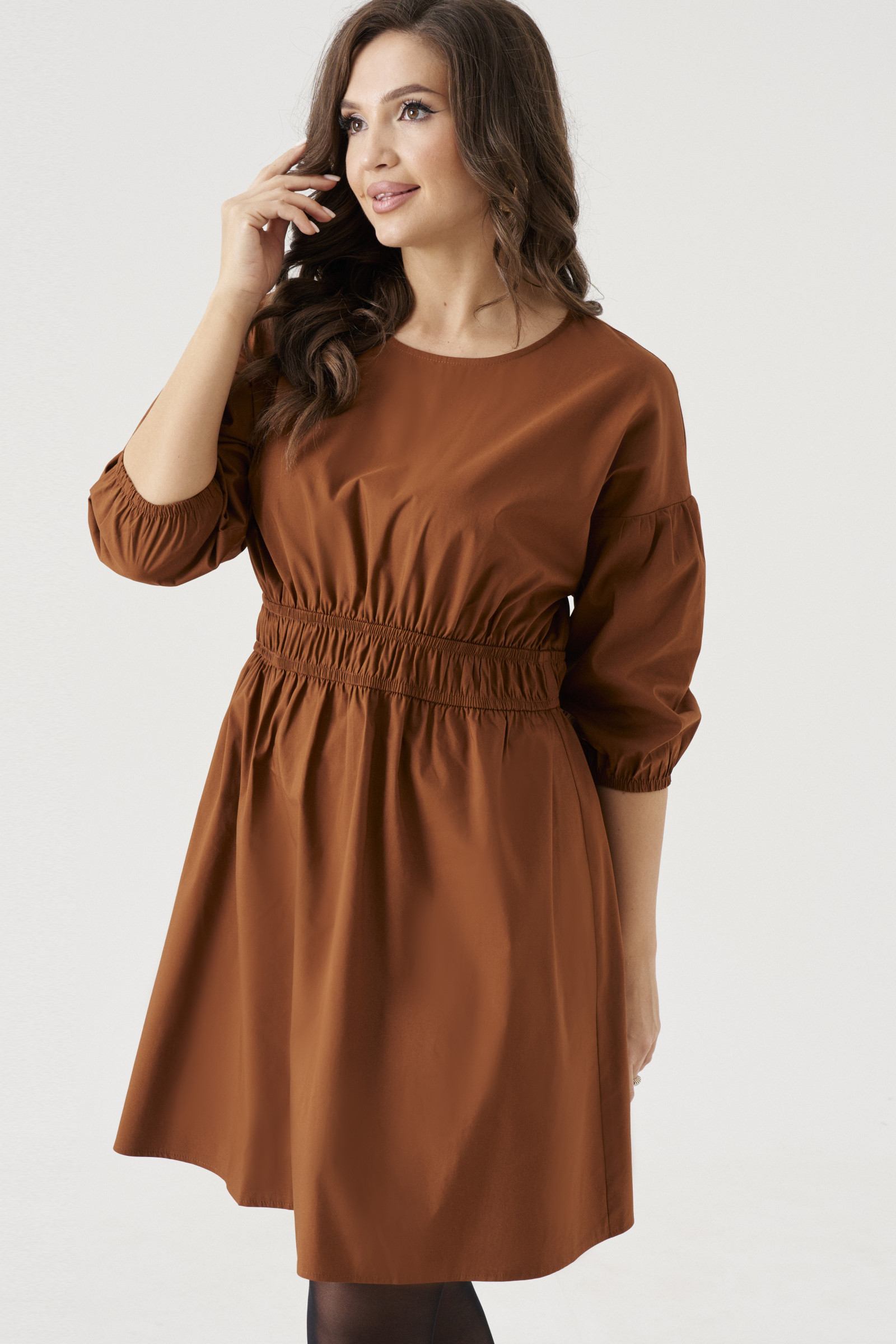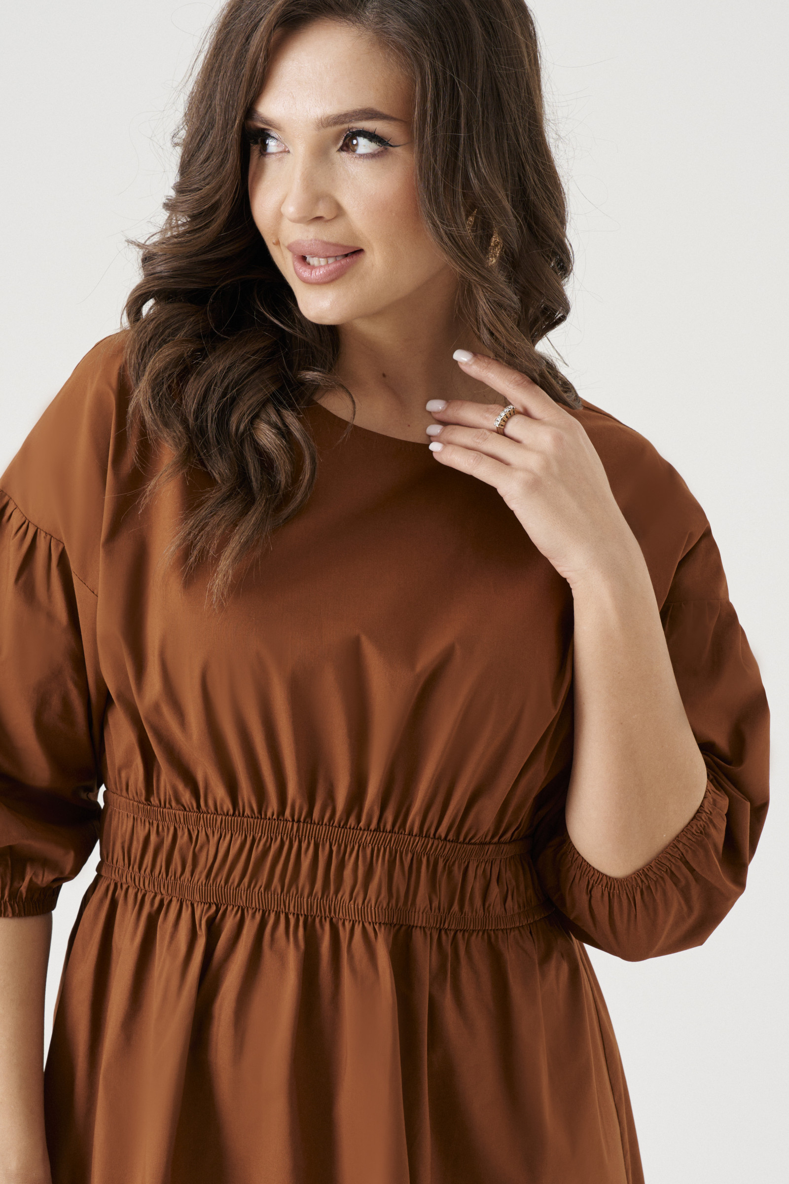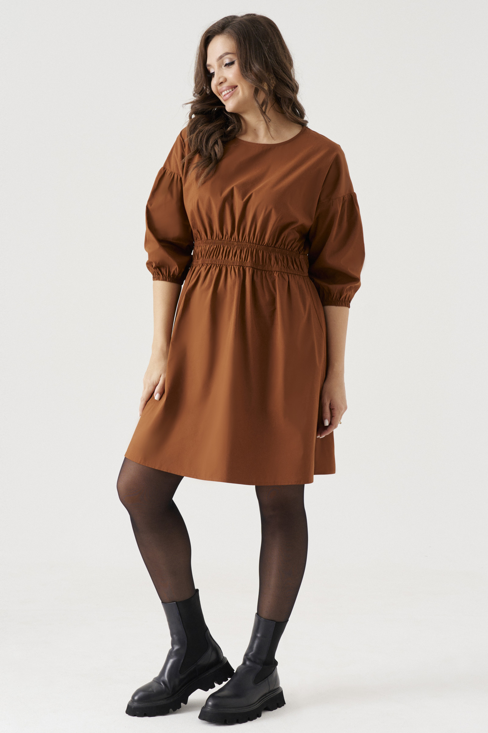 Платье на осень создано в длине выше колена. Расширяющаяся книзу юбка скрывает лишние сантиметры на бедрах. Внимание привлекают свободные рукава 3/4, собранные по нижнему срезу. Платье женское повседневное застегивается на петлю пуговицы, расположенную в разрезе от горловины на спинке.