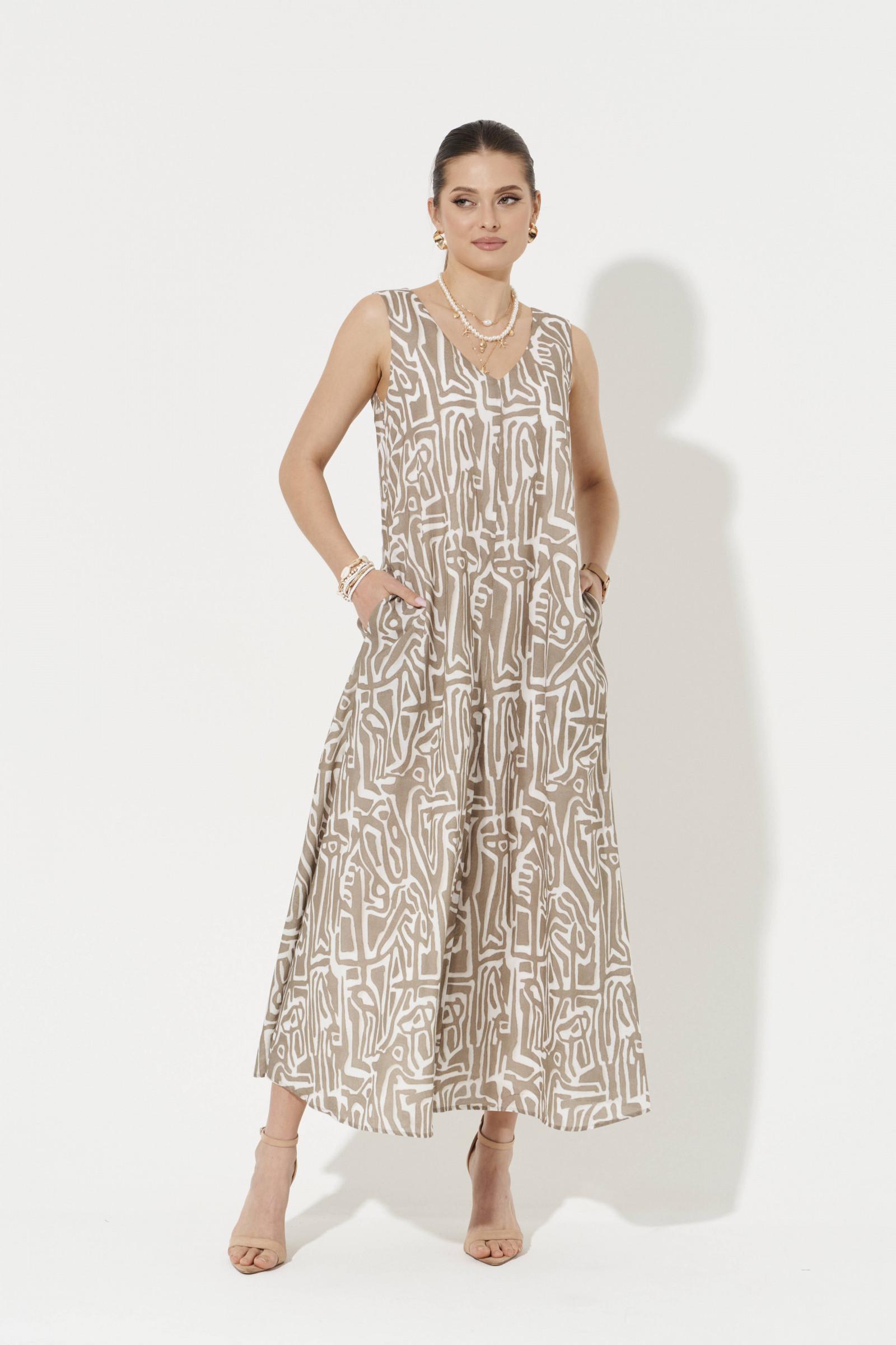 Платье женское свободное из лёгкой хлопчатобумажной ткани для повседневной носки. Платье расширено к низу. Перед и спинка со средним швом. В боковом шве имеется потайной прорезной карман. Горловина по переду и по спинке V-образная. Платье без рукавов. Для придания формы в области талии имеется пояс из основной ткани. Платье на натуральной вискозной подкладке. Длина изделия макси. Красивое и стильное платье, которое будет отлично смотреться на любой фигуре., а главное будет радовать вас своим изящным видом.