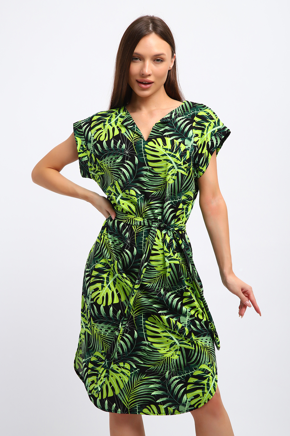 Платье-туника летнее выполнено из трикотажного полотна, кулирка 100% хлопок. Платье полуприлегающего силуэта умеренного объёма с коротким цельнокроеным рукавом. Спинка и полочка цельнокроеные, вырез горловины круглый спереди разрез. Срез горловины спинки и полочки обработан подкроенной обтачкой из основной ткани. Срез проймы обработан манжетой. Длина платья до линии колена, по боковым швам округленные разрезы. Платье имеет пояс. Большой размерный ряд поможет подобрать платье на любую фигуру, для стройных и для полных. Платье подчеркнёт достоинства и скроет недостатки фигуры, подарит комфорт и удобство в жаркий летний день, в отпуске, на пляже.