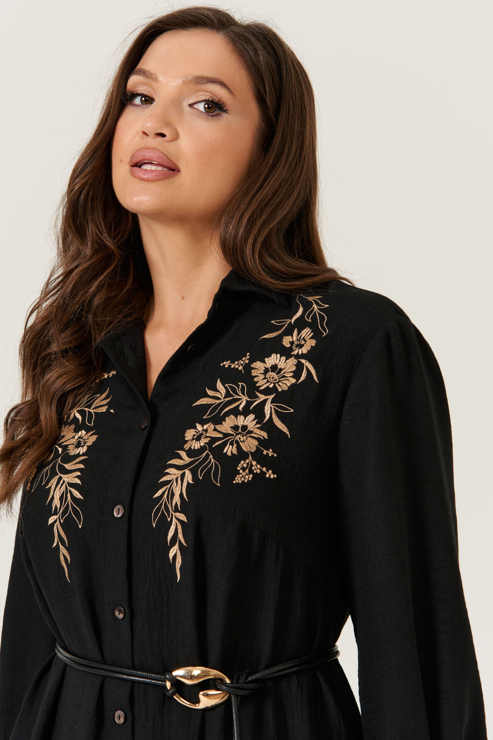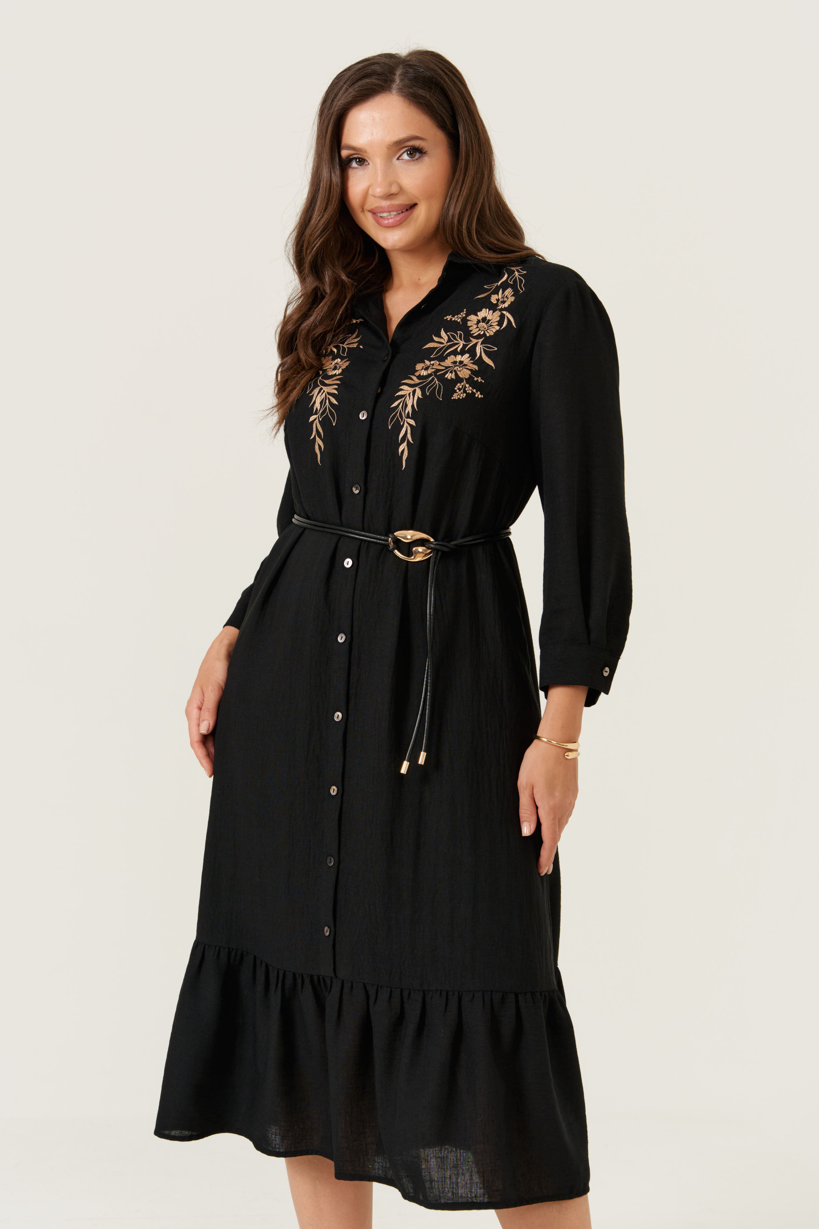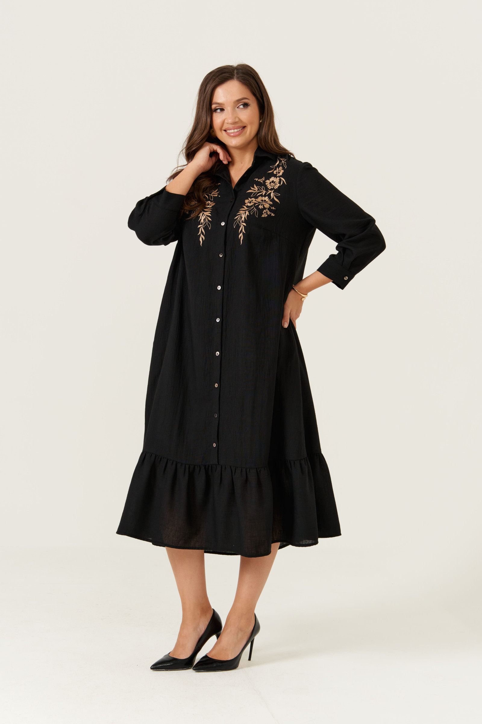 Платье женское из лёгкой ткани для повседневной носки. Платье расширенного силуэта. Горловина оформлена воротником стойкой. Рукав 3/4, низ рукава оформлен манжетой, застёгивающаяся на петлю-пуговицу. На передней части изделия дизайнерская вышивка в виде цветов. Спинка с отрезной кокеткой, по шву сборка. Изделие с фронтальной застежкой на петли- пуговицы. По низу платья отрезной ярус на сборке. Платье на вискозной подкладке.