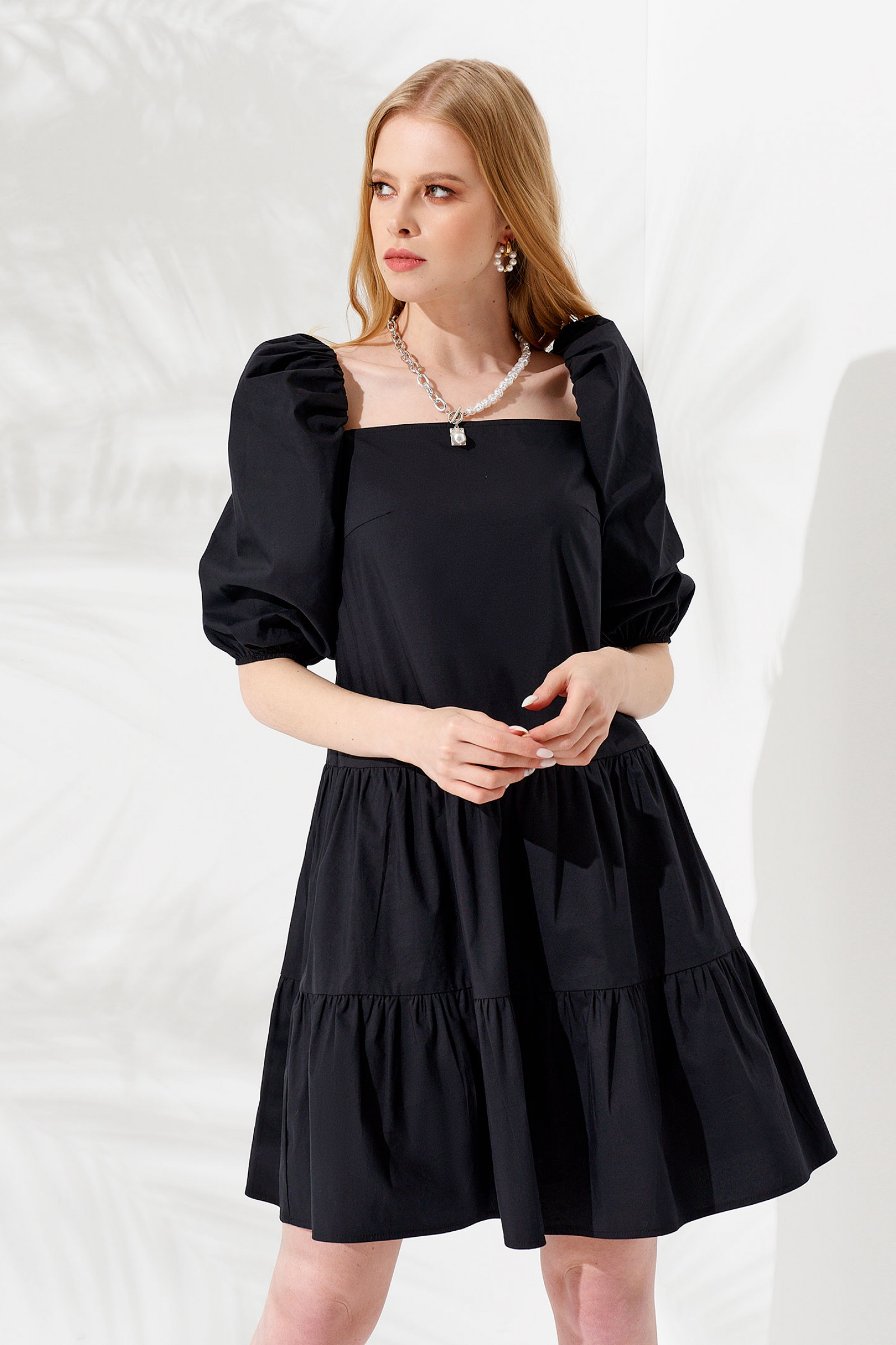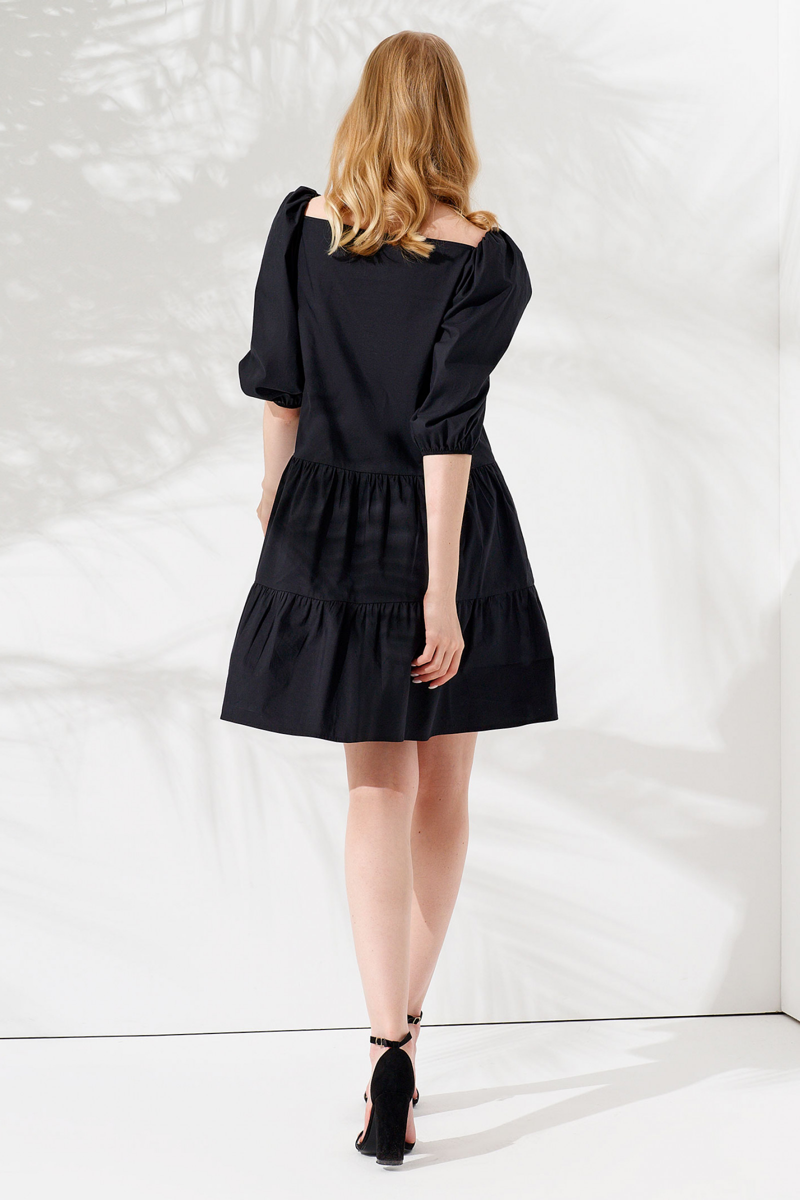 Платье с рукавом три четверти выполнено в свободном силуэте, поэтому идеально подойдет вам, независимо от типа фигуры. Большой прямоугольный вырез открывает красивую шею и ключицы. Рукава вверху скреплены мелкими складками, а внизу – собраны на резинку. Платье женское короткое отрезное, шов проходит ниже талии и по линии бедер. Визуально создается двухъярусный эффект.