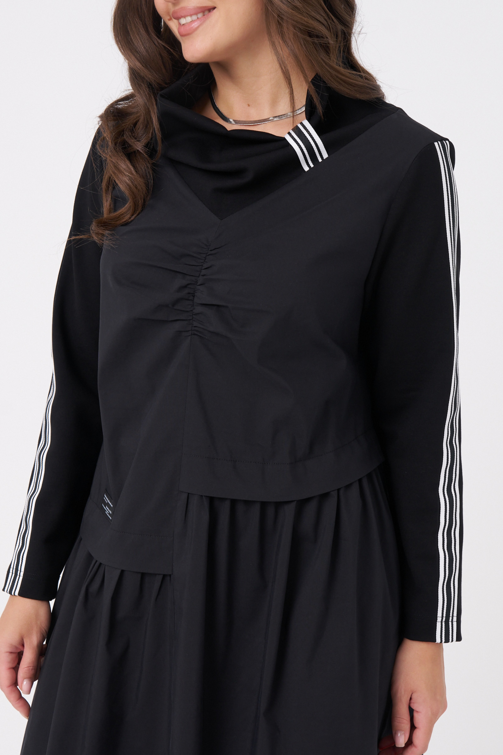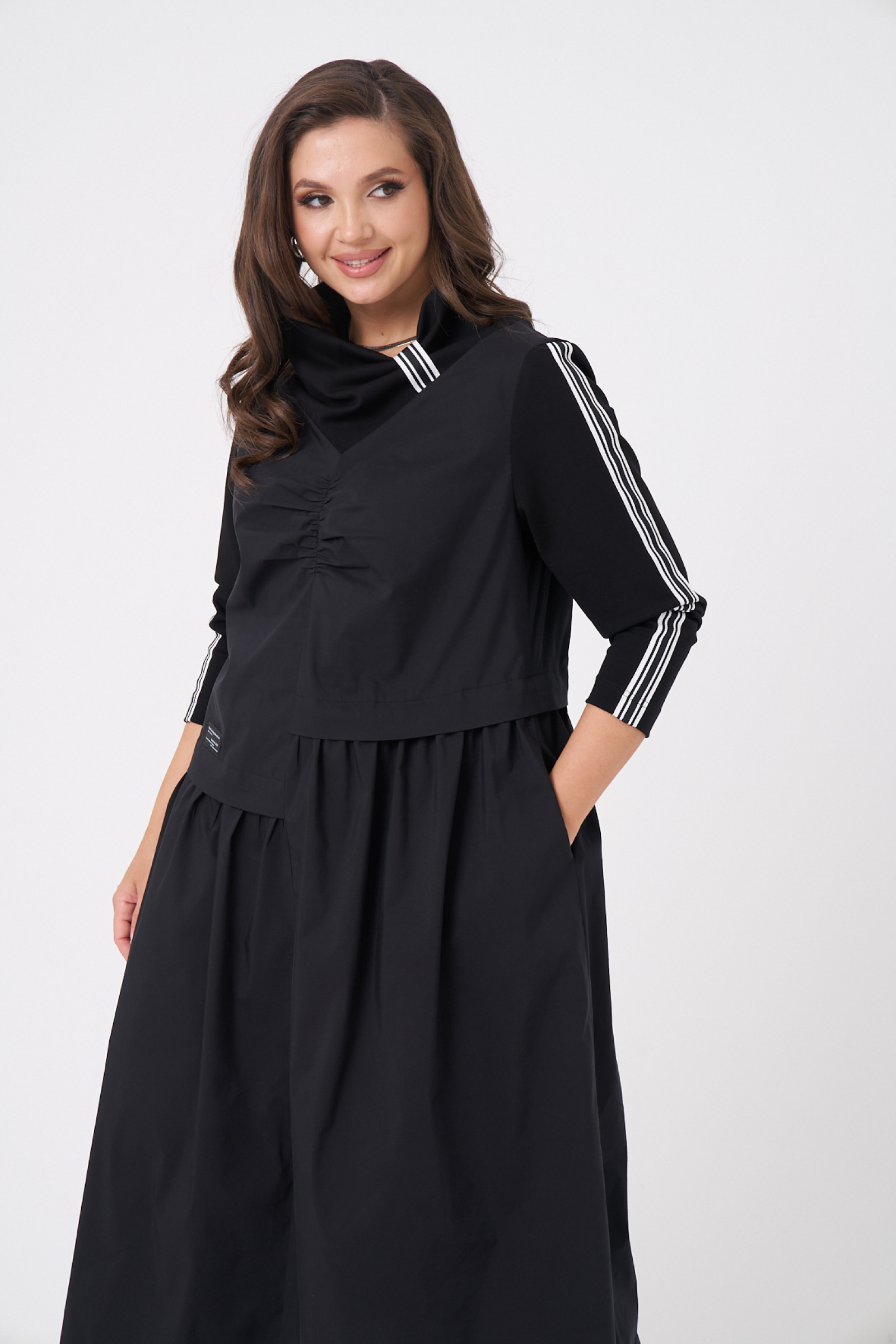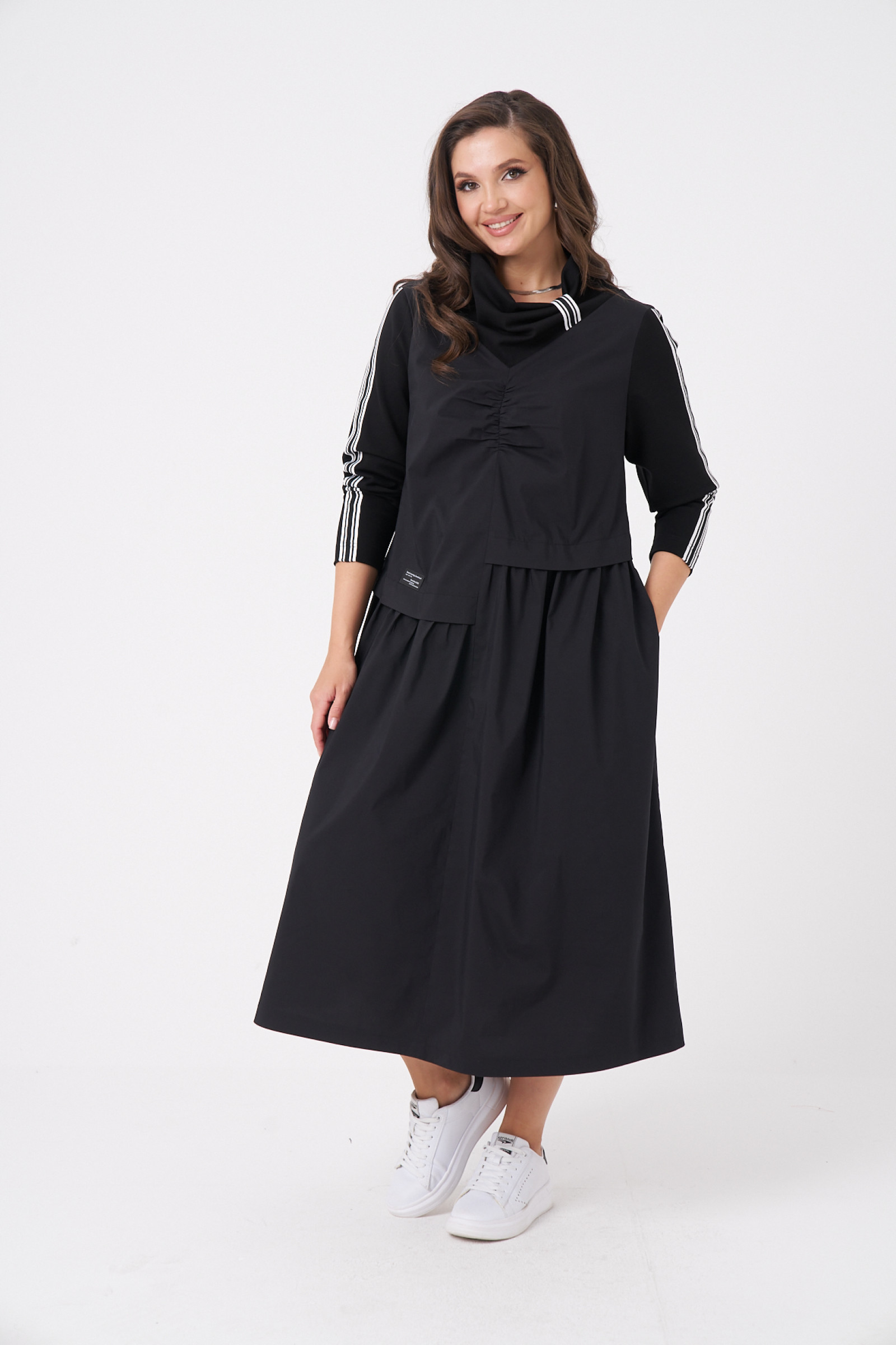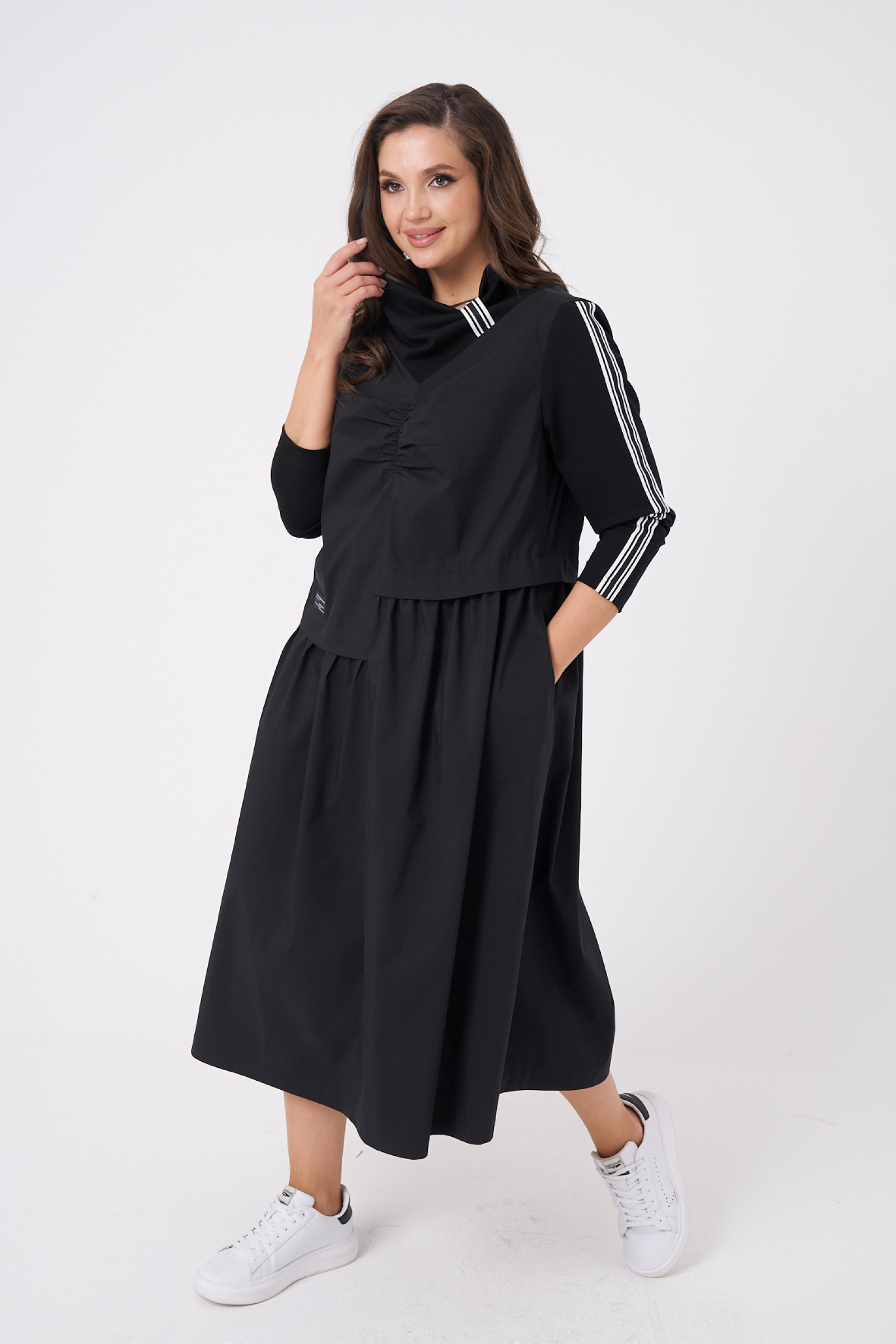 Женское платье из хлопковой ткани черного оттенка для повседневной носки выполнено в прямом силуэте и имеет длину миди. Модель расширена к низу, что обеспечивает комфортную посадку и свободный стиль. Передняя часть отрезная, с ассиметричной отрезанной частью лифа, стянутой в небольшие складки вдоль груди, а также украшена сборкой, создающей интересный визуальный эффект. Спинка также имеет неравномерную отрезную часть лифа, средний шов и сборку, что добавляет оригинальности дизайну. Горловина обработана объемным трикотажным воротником с декоративной черно-белой деталью, придающей образу выразительность. Втачные рукава из трикотажного полотна с черно-белыми нашивками дополняют стильный и модный образ. Это очень интересное платье, которое привлечет внимание своей оригинальностью и современным дизайном — идеально для тех, кто любит выделяться и быть в тренде.