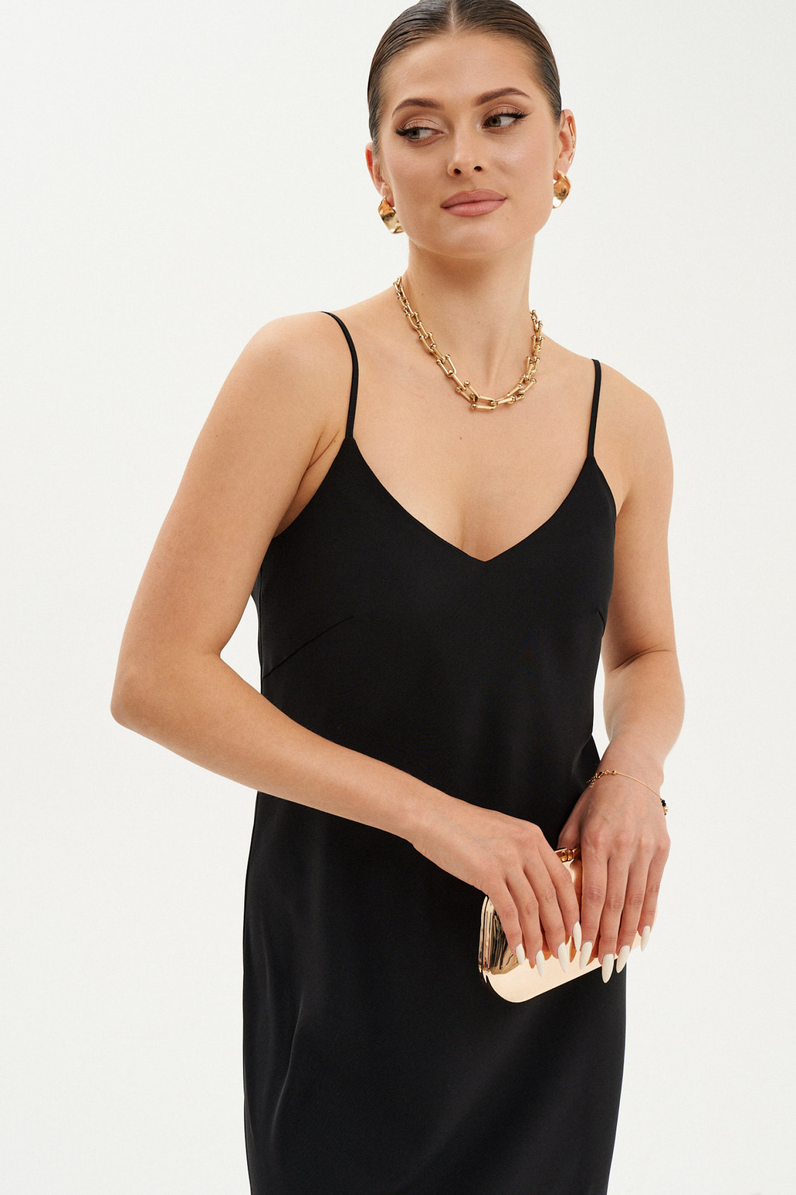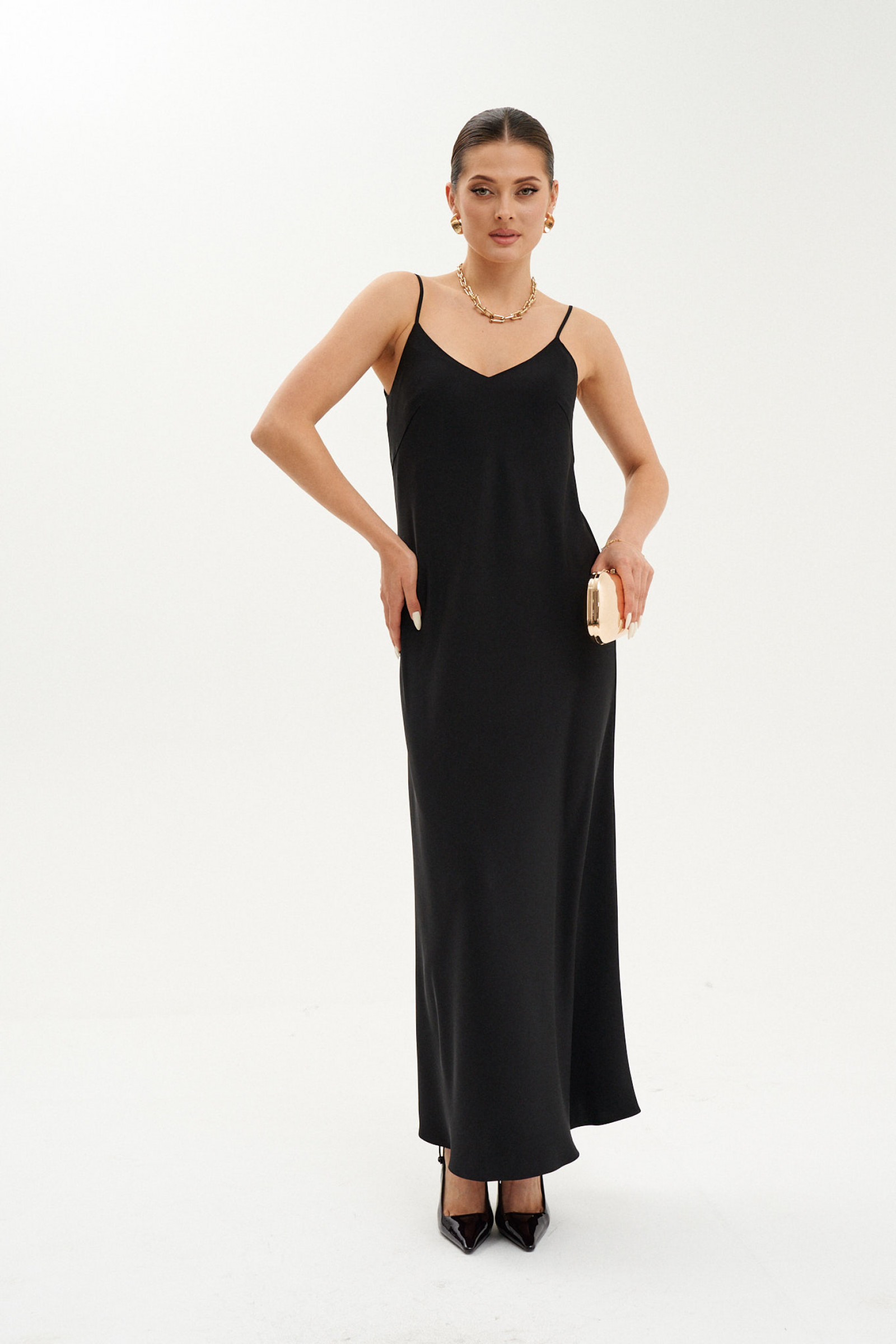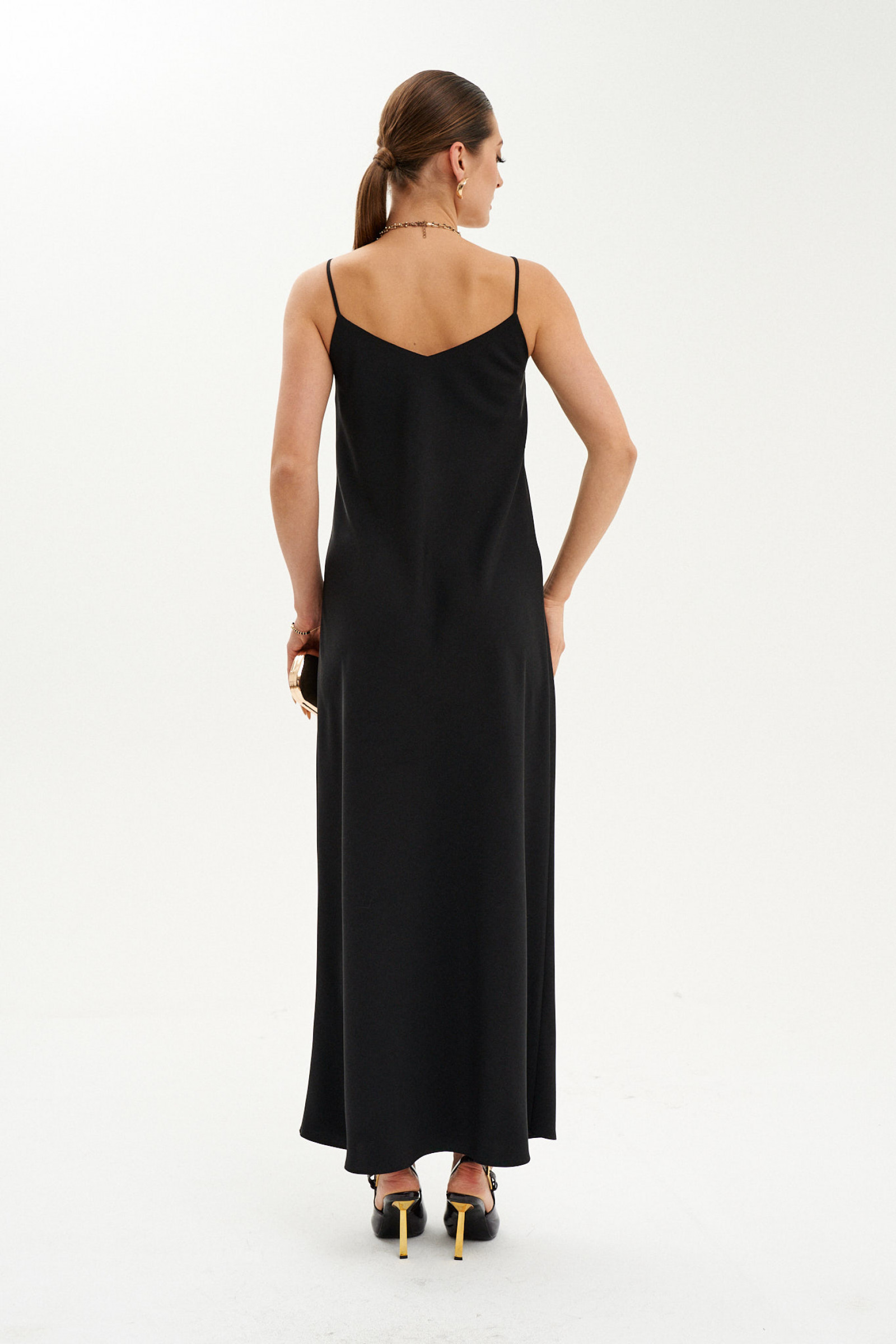 Это элегантное платье свободного кроя с плавным, струящимся силуэтом, чуть расширяющимся к низу. Модель выполнена из легкой ткани с нарядным блеском, что придает ей особую изысканность. Передняя часть украшена двумя нагрудными вытачками, создающими аккуратный и женственный силуэт. Вырезы по переду и спинке выполнены в V-образной форме и обработаны обтачками, что добавляет модели утонченности. Тонкие бретели делают образ легким и воздушным. Длина изделия — макси, что делает модель универсальной для различных случаев — как для повседневной носки, так и для торжественных мероприятий. Эта модель чёрного оттенка идеально подойдет любой фигуре благодаря своему свободному фасону и элегантному стилю.