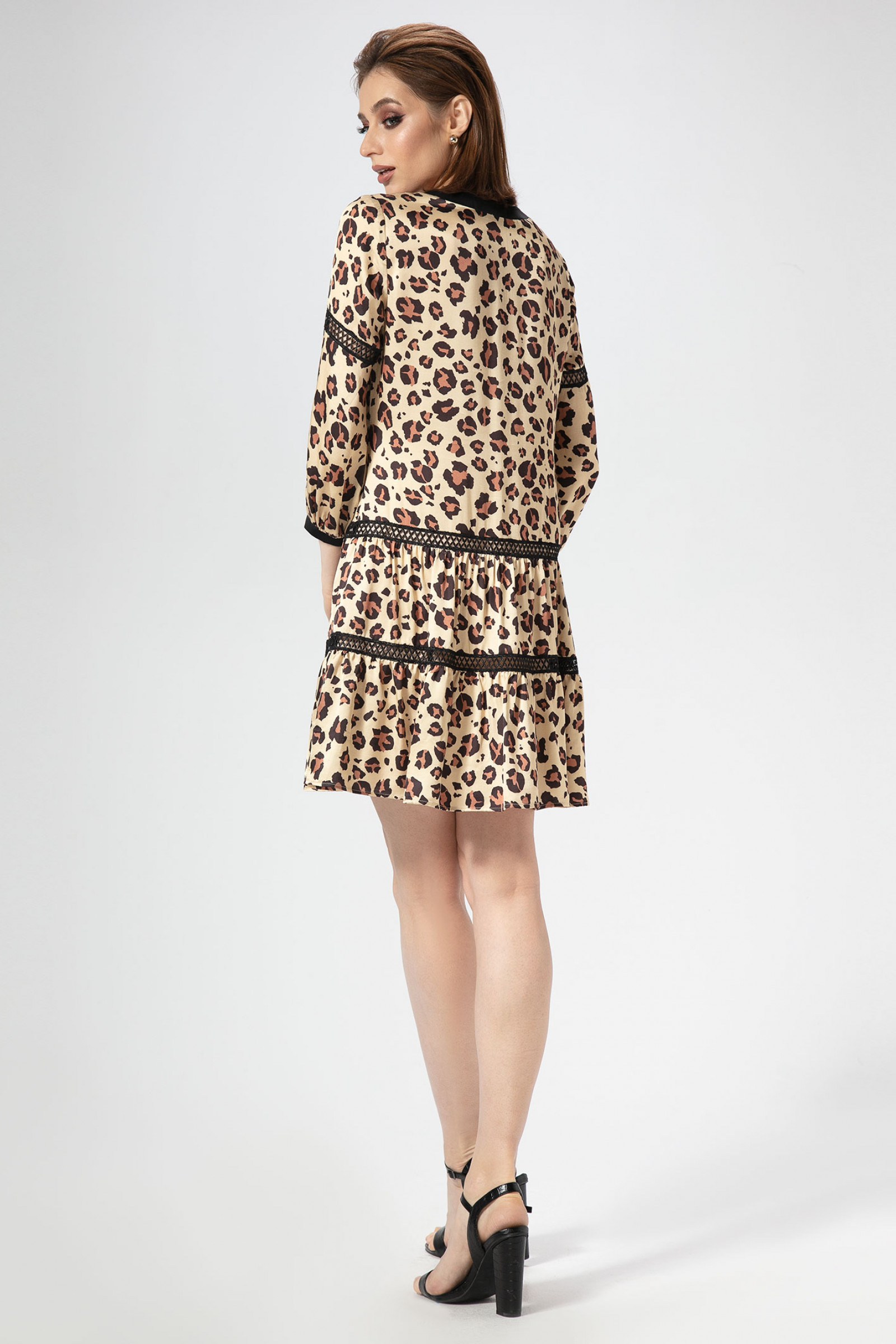 Леопардовая расцветка делает платье абсолютно самодостаточным. Платье из вискозы, свободного силуэта, горловина V-образной формы, по центру от планк шнурок. Деталь переда с наргудными вытачками, с двумя воланами и декоративной тесьмой - кружевом. Спинка с двумя воланами , декоративной тесьмой- кружевом. Рукава удлиненные, книзу расширенные на манжету. Это эффектное платье говорит само за себя.