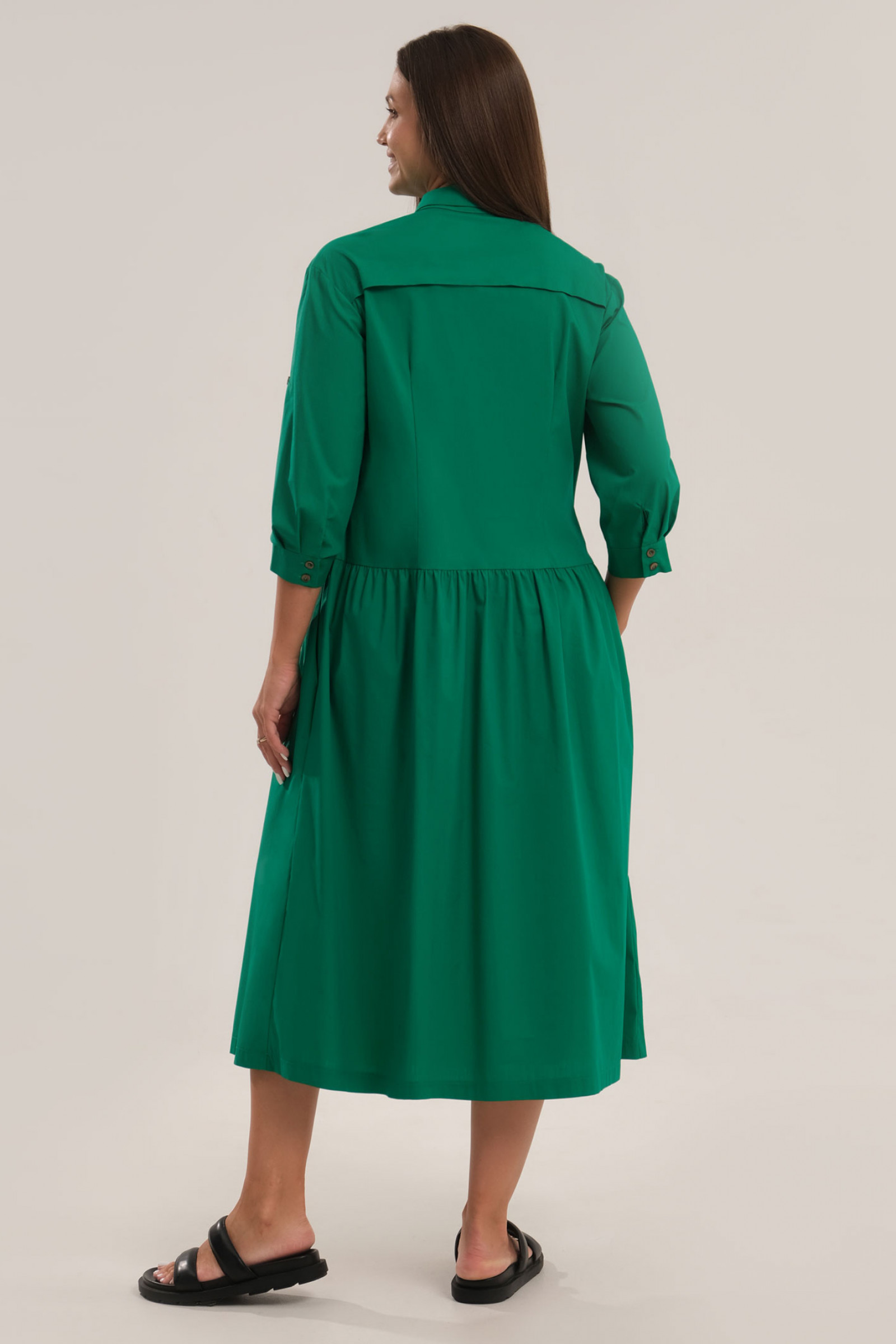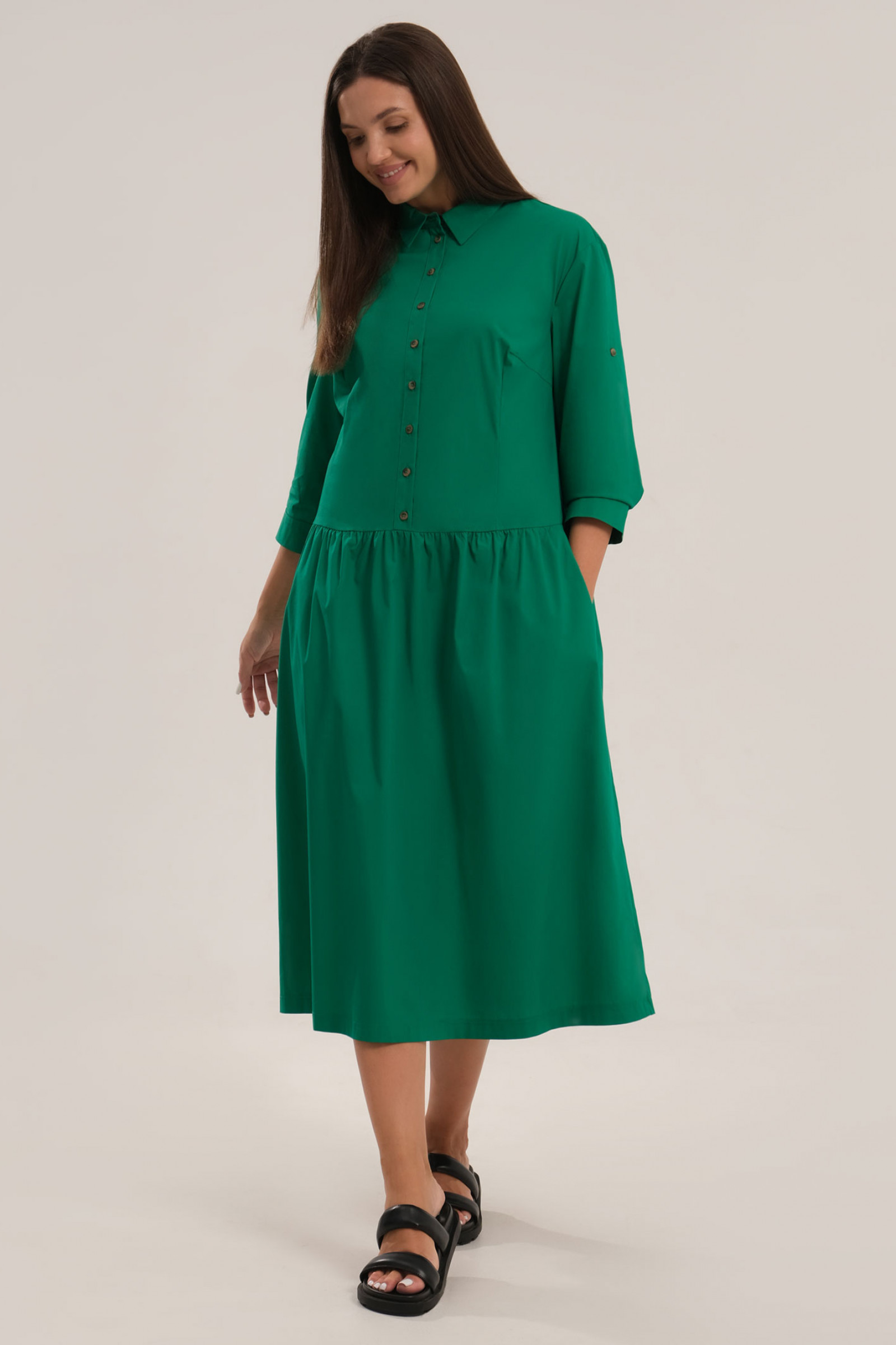 Нарядное платье оригинального кроя дополнит ваш летний рабочий или повседневный гардероб. Оно пошито с рукавом ¾, с манжетами и патами, воротником рубашечного типа, карманами в боковых швах. Благодаря крою трапеция, женское платье для полных идеально садится по фигуре, скрывая бедра и живот. Модель подойдет беременным девушкам. Платье большого размера из хлопковой ткани отлично пропускает воздух, не вызывает раздражения кожи. Вы можете купить женское платье миди для комфорта в жаркие дни. Оно хорошо сочетается с обувью на каблуке, танкетке или низком ходу.
