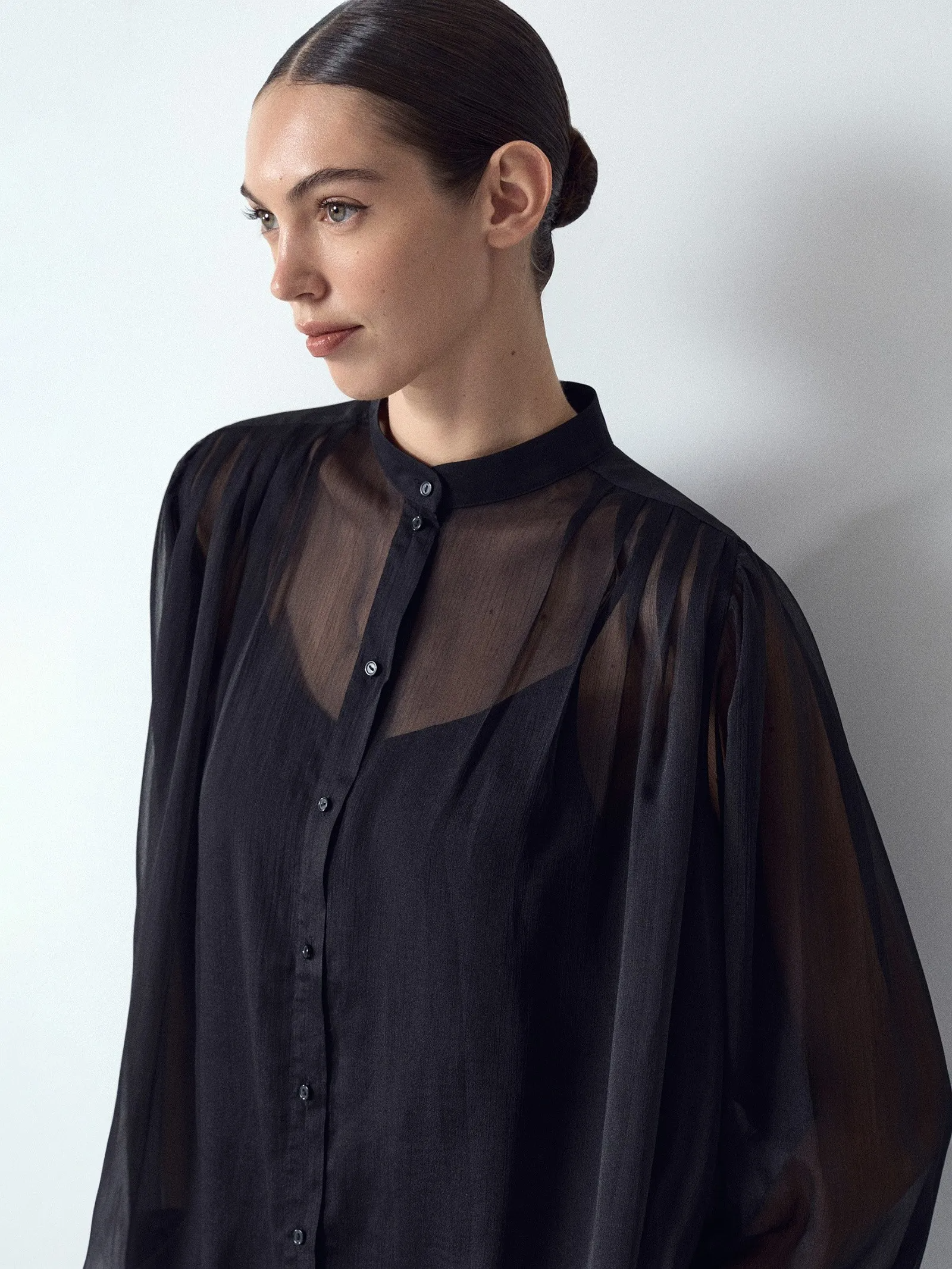 Рубашка из тонкого шифона создаст богемный образ для непринужденной обстановки. Эта вещь соединяет в себе чувственность и лаконичность. За чувственность отвечает приятный на ощупь, мягкий шифон с жатым эффектом. Он уложен в деликатную плиссировку, которая смотрится очень элегантно. В комплекте с рубашкой идёт чёрный топ из комфортной вискозы. Рубашка поддерживает долгоиграющий тренд на прозрачность, позволяя играть с балансом сдержанности и соблазна. За счёт расцветки и материала с ней могут сочетаться самые различные варианты низа, от юбки с люрексом в близком оттенке до базовых джинсов. Идеальной парой будут расшитые брюки из шифона.