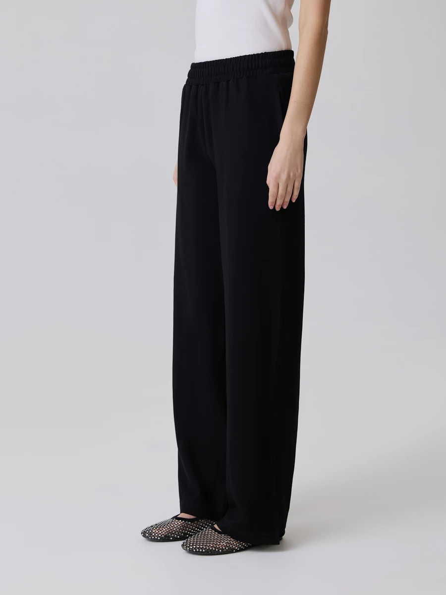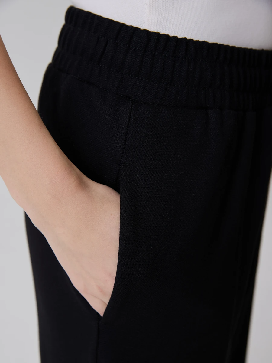 Черные трикотажные брюки в спортивном стиле - актуальная практичная единица повседневного гардероба. Универсальная средняя посадка с широким поясом на резинке обеспечивает комфортную носку на протяжении всего дня и исключает проблемы с подбором размера в талии. Модель имеет интересные акценты в виде простроченных по всей длине вертикальных стрелок и аккуратных разрезов по низу в боковых швах. Спереди имеются вместительные функциональные карманы.