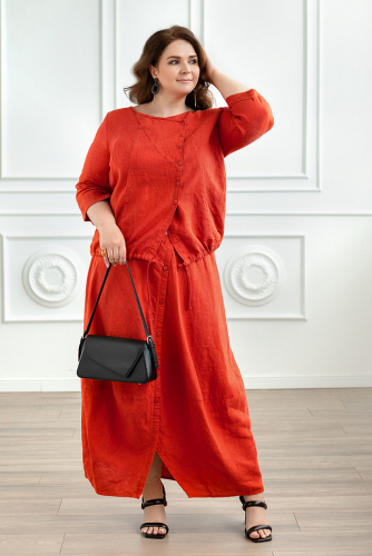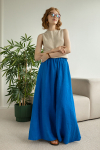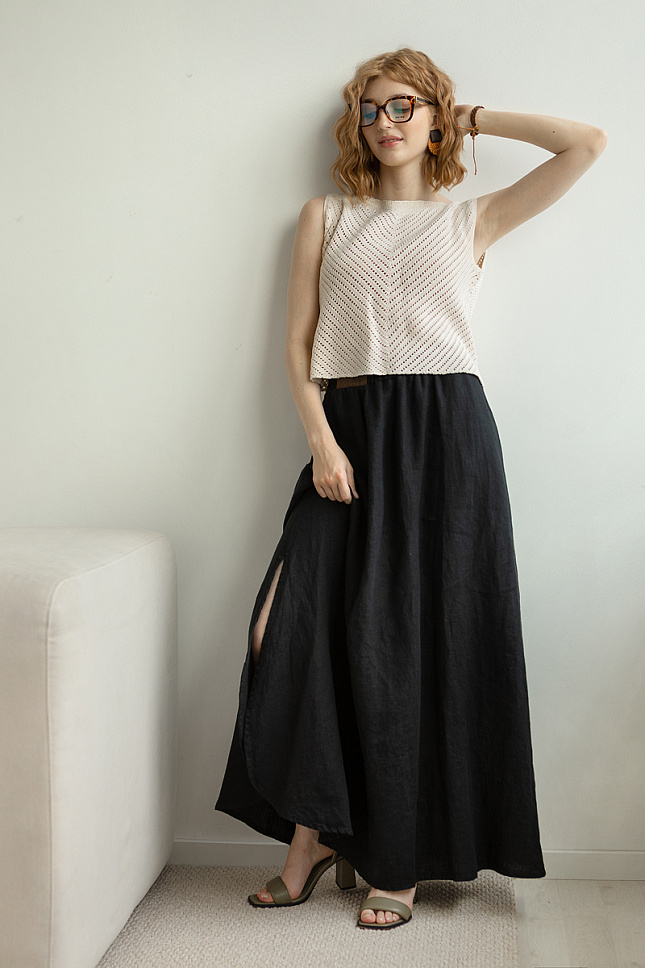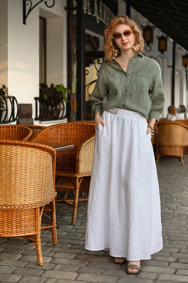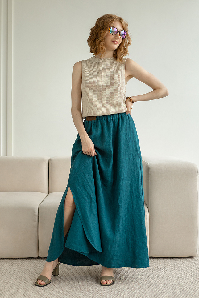 Юбка - как олицетворение женственности. Ей должна обладать каждая уважающая себя женщина и девушка. Этот элемент гардероба способен передать характер своей обладательницы. От нежного и романтичного, до вздорного и решительного. Представленная модель юбки из натурального льна остепенит любую порывистую натуру. Её длина макси придаст женскому силуэту стати и грациозности. Одновременно с этим, свободный силуэт трапеция не будет сковывать движений, обеспечив максимальный комфорт. Такой аргумент весом, когда речь идёт о летней модели юбки. Вспомните как некомфортно в обтягивающих моделях, изготовленных из синтетических волокон. В отличии от них, натуральный лён хорошо пропускает воздух и прекрасно отводит влагу. Не стоит тревожиться о жатой текстуре и быстрой сминаемости – естественность — это тренд последнего времени. Эластичный пояс удобно снимать и надевать, он не сдавливает тело, не вызывает неприятных ощущений на коже. Карманы в боковых швах приятный и стильный акцент этой модели. Глубокий разрез по боку привносит пикантности внешнему виду, позволяя продемонстрировать красивые женские ножки.