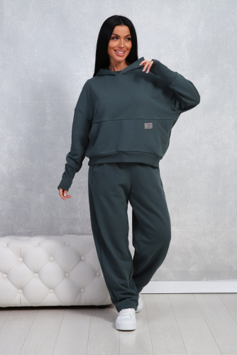 Костюм женский трикотажный: толстовка с капюшоном, карман Кенгуру, спинка немного длиннее полочки, спущенное плечо, трендовый высокий манжет у рукавов; брюки бананы на широком эластичном поясе, с боковыми карманами.