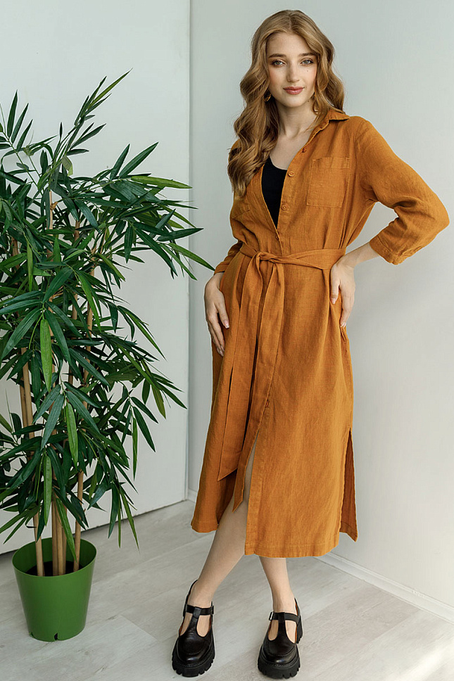Платье – халат не выходит из ассортимента магазинов женской одежды уже несколько сезонов подряд. Такое внимание вполне заслуженно. Простое и лаконичное в своём исполнении, оно весьма удобное и функциональное. Предлагаем обратить внимание на представленную модель подобного платья! Оно выполнено из натурального льна, что делает его на порядок комфортней относительно любых моделей с примесью синтетических волокон в своём составе. Прямой свободный крой не сковывает движений, даря свободу и удобство. Съёмный пояс – кушак элегантно подчёркивает линию талии. Центральная застёжка на пуговицы расположена по всей длине модели, создавая выгодную вертикаль, делая силуэт более стройным. Форма воротника, накладные карманы и манжеты на рукавах выказывают стиль casual, который «пропагандирует» комфорт и удобство в использовании. Встречная складка на спинке также призвана обеспечить максимальный комфорт, не сковывать движения. Представленная модель платья прослужит вам долгие годы, оставаясь актуальным и стильным.