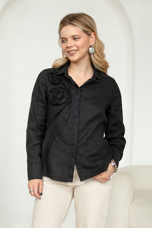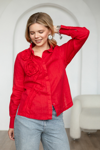 Деловые будни могут быть разными, не только скучными и рутинными. Многое зависит от вашего отношения к процессу и настроения. Дизайнеры марки Kayros сделали попытку скрасить вам серые будни и предлагают обратить внимание на представленную модель блузы. Про неё можно сказать – два в одном. Классический крой блузы – сорочки как основа для стильного и элегантного декора. Прямой полуприлегающий силуэт прост и лаконичен, его практичность не вызывает сомнений. Свободный крой стильно скроет проблемные зоны, не будет предательски их обтягивать. Длина до бёдер универсальна для любых брюк и юбок. Классический стояче-отложной воротник с центральной застёжкой на пуговицы и втачным рукавом с манжетой по низу – всё это характерно для стиля кэжуал, который «верховодит» в деловом гардеробе. Однако, всю эту практичность и привычность дополняет незаурядный цветочный декор. Жатая и рельефная текстура натурального льна позволила создать уникальный и стильный акцент, превращающий базовую модель в авторскую. Витиеватые линии мастерски закручены в соцветия пионов, которые способны поднять настроения и придать уверенности.