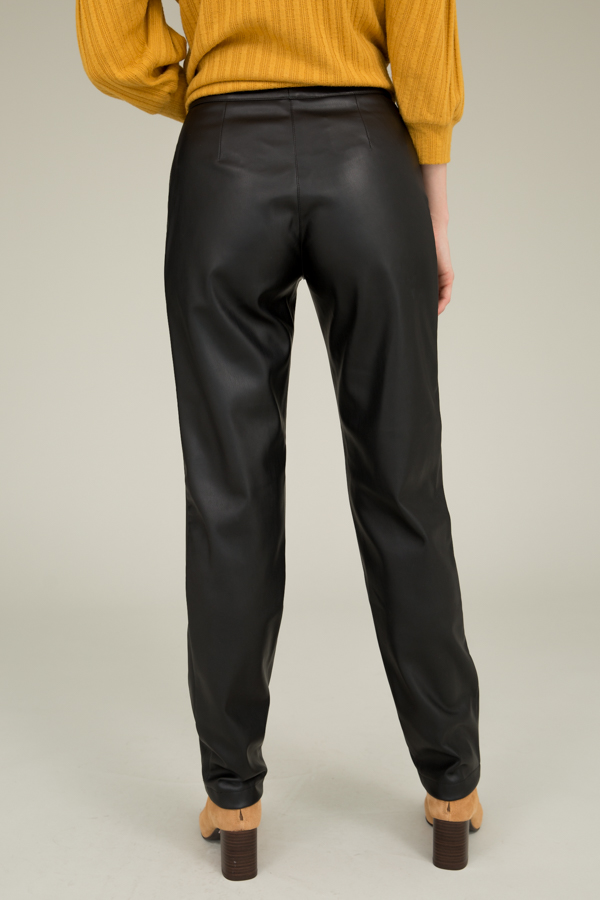 Брюки из эластичного полотна, с покрытием, имитирующим кожу, зауженные книзу. На передней части брюк карманы с подкройным бочком. Притачной пояс, застёжка на металлическую молнию-гульфик и кнопку.