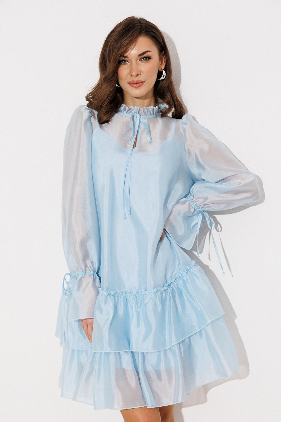 3226 77% вискоза, 23% ПЭ Платье 5200 42-52 170 голубой Платье А-силуэта, состоящее из 2-х слоев. Верхний слой: втачной длинный рукав со сборкой по окату и внизу на завязке, полочка и спинка с притачными слегка присборенным воланом с рюшей, воротник стойка-рюша и вырезом каплей по переду на завязке. Нижний слой: платье на бретелях с вытачками по переду на груди.