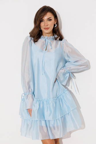 3226 77% вискоза, 23% ПЭ Платье 5200 42-52 170 пудра Платье А-силуэта, состоящее из 2-х слоев. Верхний слой: втачной длинный рукав со сборкой по окату и внизу на завязке, полочка и спинка с притачными слегка присборенным воланом с рюшей, воротник стойка-рюша и вырезом каплей по переду на завязке. Нижний слой: платье на бретелях с вытачками по переду на груди.