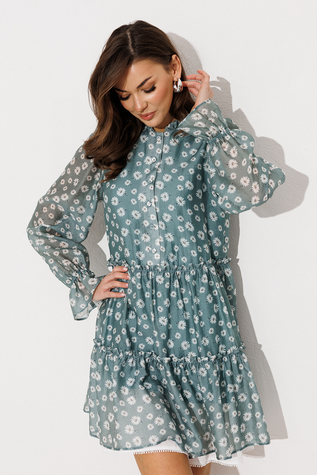 3263 100% ПЭ Платье 4400 42-48 170 полынь Платье шифоновое А-силуэта, отрезное по линии талии с рюшей. Втачной длинный рукав со сборкой по окату и внизу на резинке. По переду лиф с центральной застежкой на петли-пуговицы. Полочка и спинка с притачными слегка присборенным воланом с рюшей из основной ткани и воланом из отделочной ткани с пришитым к нему кружевом по низу платья. Воротник стойка с рюшей. Платье на подкладке.