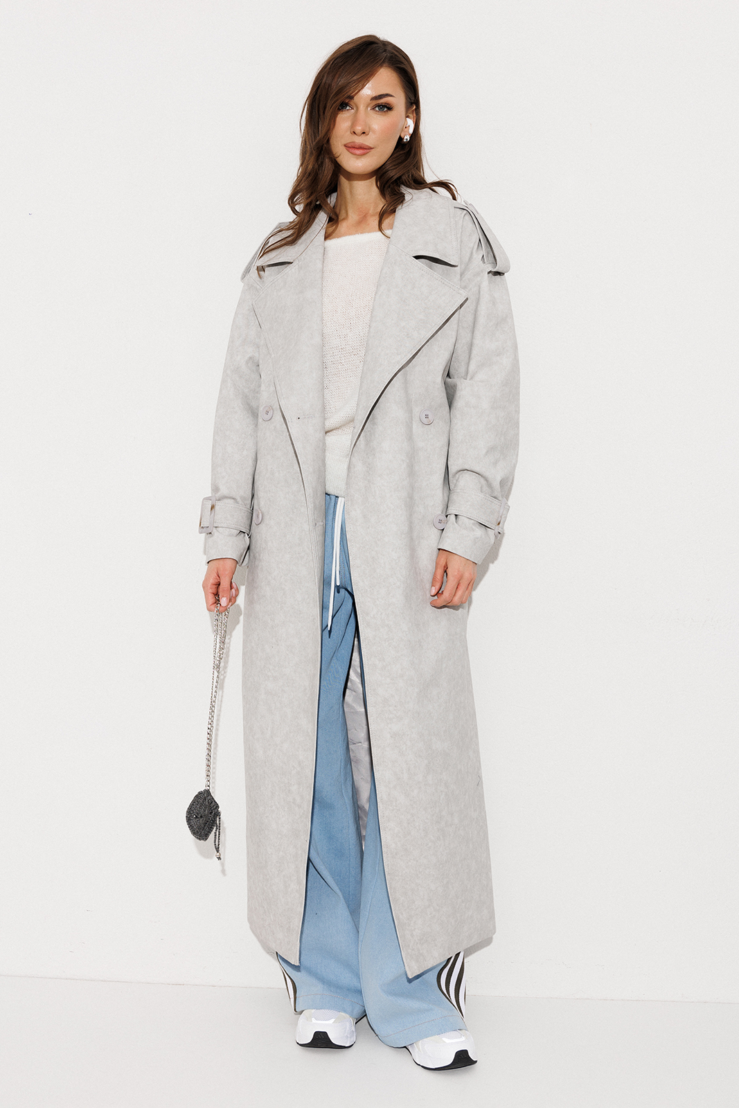 3270 100% хлопок Плащ 8900 42-54 170 светло-серый Плащ-тренчкот длинный прямого силуэта с двубортной застежкой на петли-пуговицы, втачным двух шовным рукавом и спущенной линией плеча, по низу рукавов паты с пряжкой. Воротник пиджачного типа - отложной с лацканом. Полочка с карманом-листочкой. Спинка со средним швом заканчивающимся шлицей и с отлетной кокеткой. По плечевому шву погон с застежкой на петлю-пуговицу. Тренчкот со съемным поясом с пряжкой. Плащ на подкладке.