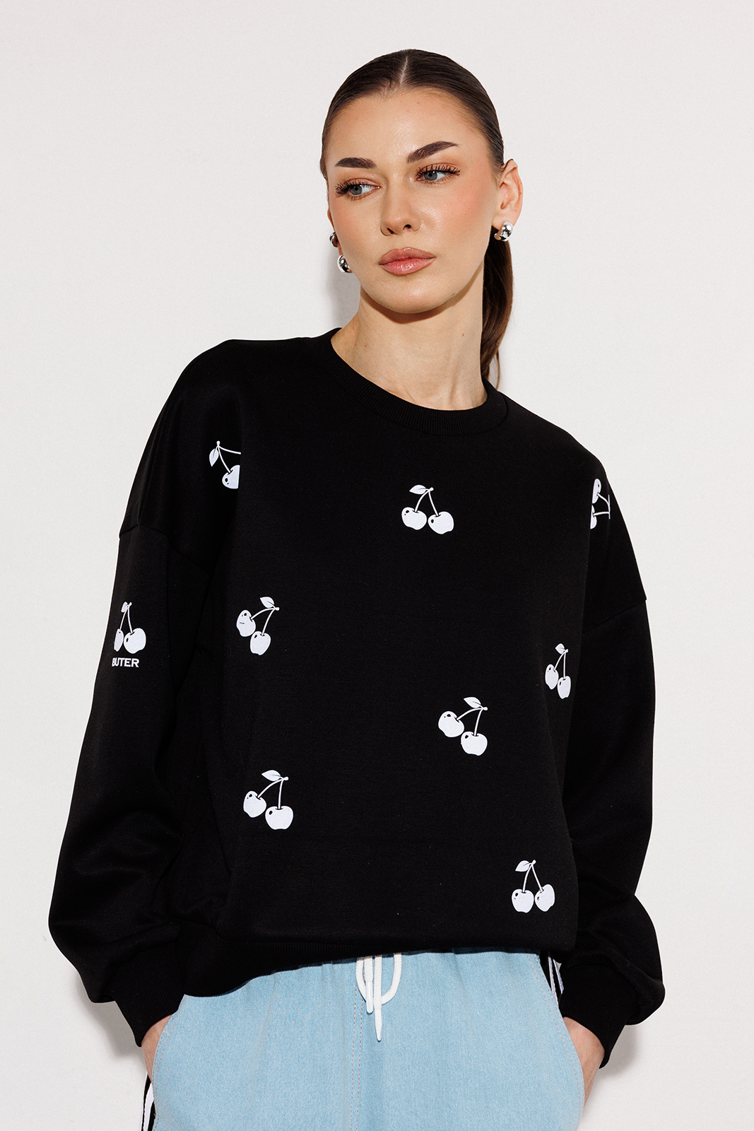 3281 54% ПЭ, 40% вискоза, 6% спандекс Джемпер 3700 42-54 170 черный Джемпер из технологичного трикотажного полотна с эффектом peach. Прямого силуэта с втачным рукавом и спущенной линией плеча, с манжетой из отделочной ткани по низу рукава. По переду и на рукаве печать "CHERRY". По горловине и низу изделия притачная планка из отделочной ткани.