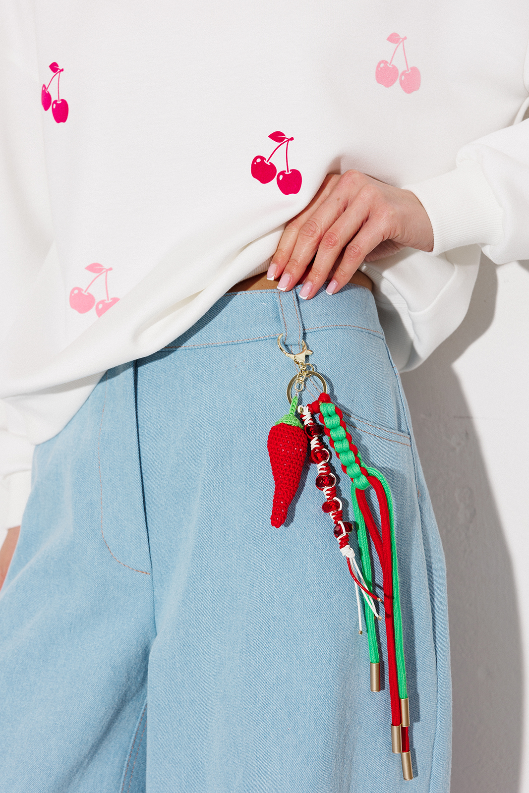 3294 Брелок перчик 2600 мультиколор Брелок на карабине с большим количеством элементов ручной работы. Вязанный перчик, сплетенная из ярких шнурков подвеска, а таже подвеска из бусин.
