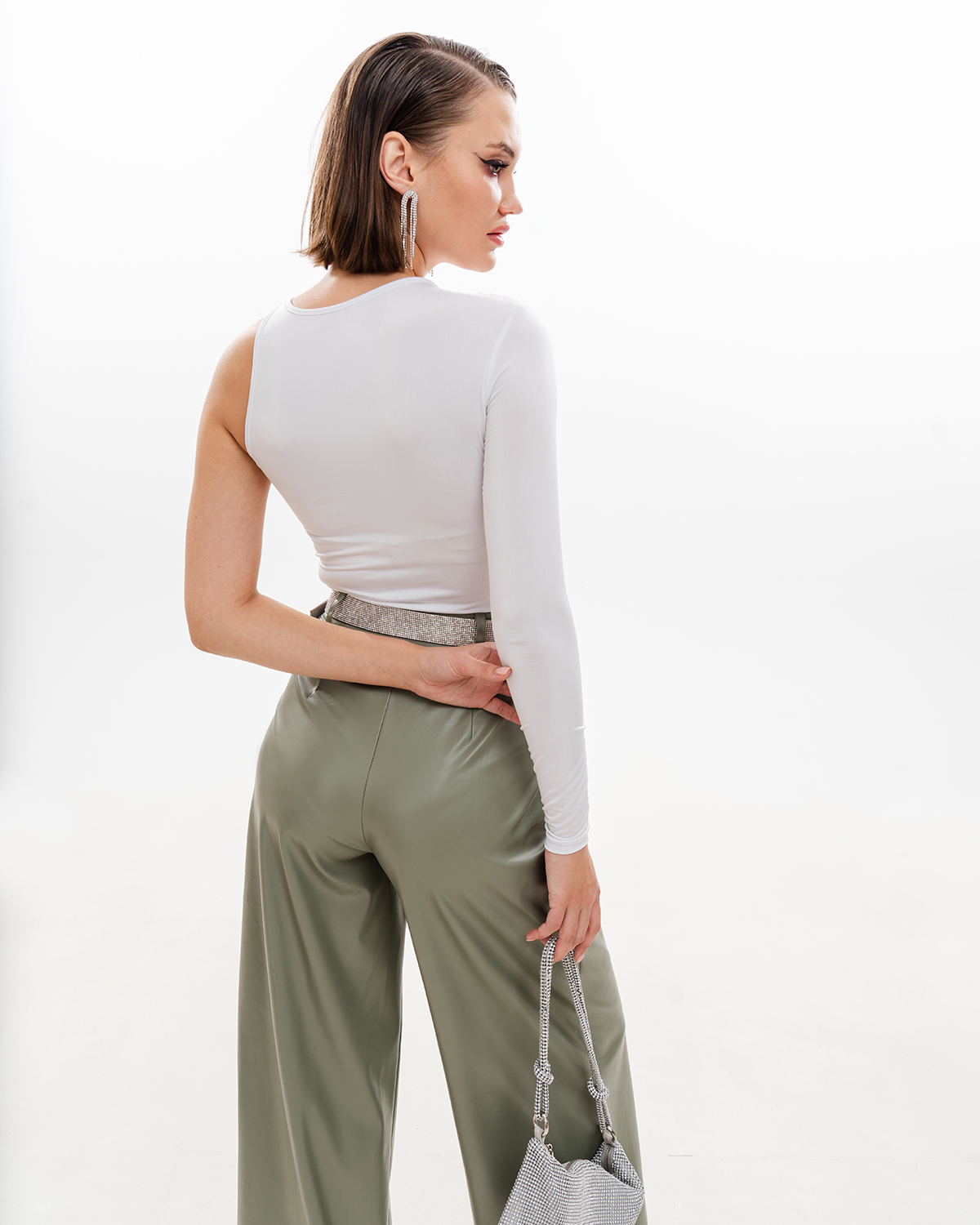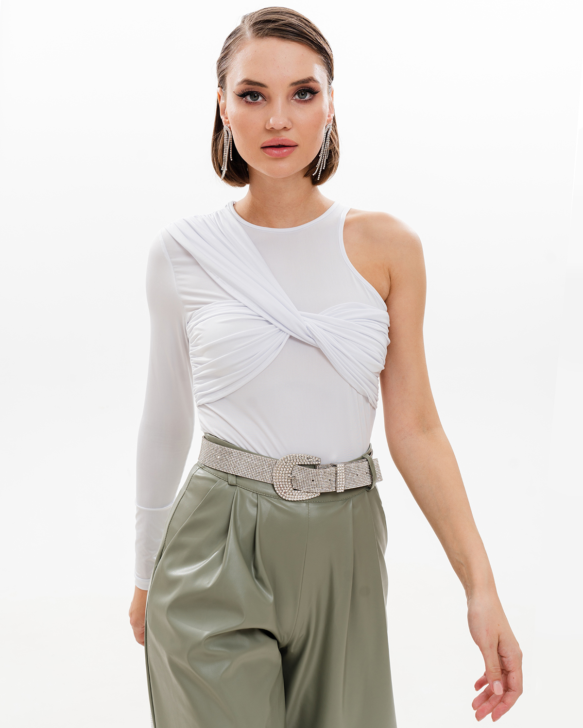 Креативное боди с уникальным дизайном. Это изделие объединило в себе несколько приемов, которые сразу выделят обладательницу из толпы. У него один длинный рукав, вторая сторона сделана как майка. Необычная драпировка спереди образует красивый лиф, который сидит хорошо на груди любого размера. Чтобы получился максимально красивый образ, оформите складки так, как это сделали мы на фото.