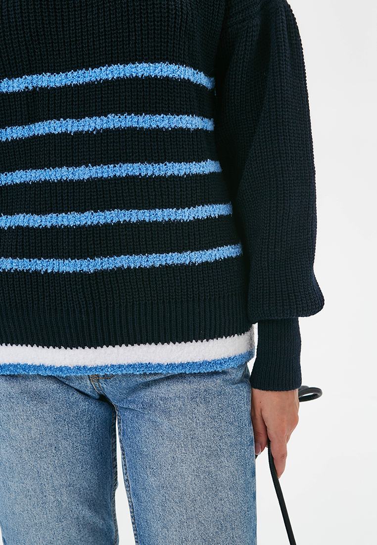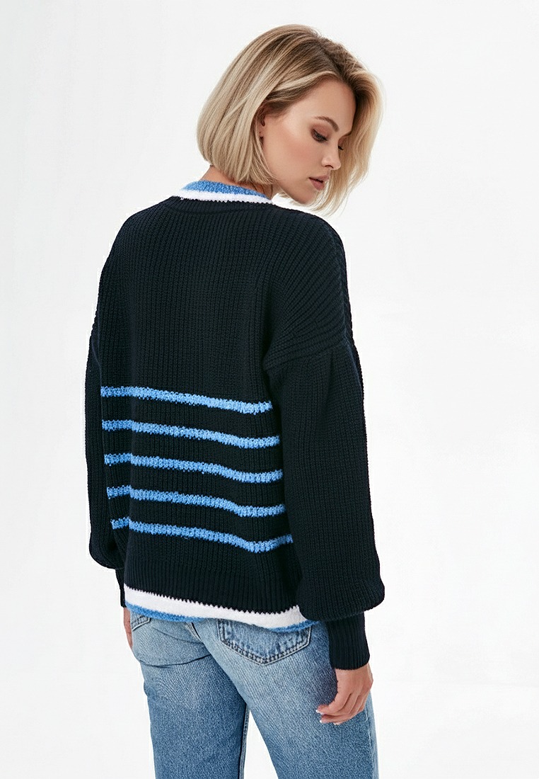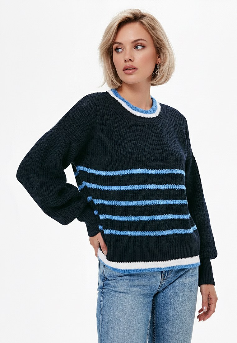 Вязаный джемпер из шерстяной пряжи с фактурными контрастными полосками, прямого свободного покроя немного оверсайз. Длина изделия до линии бедра.