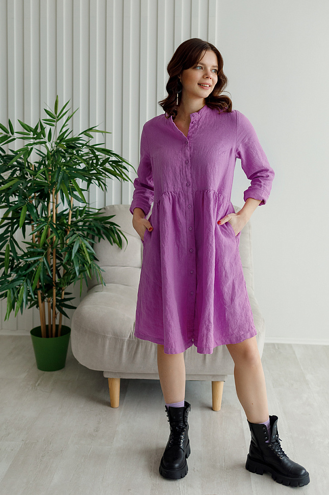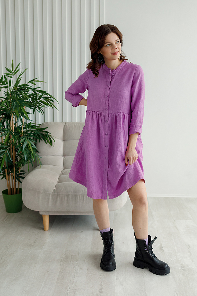 Платье в стиле бэби долл привлекают к себе внимание, благодаря своему очарованию, кокетству и женственности. В них нет вульгарности. Такой моделью платья можно прекрасно подчеркнуть изящную фигуру. Присмотритесь к представленной модели, возможно оно разработано именно для вас! Очарование укороченного силуэта позволит продемонстрировать красоту женских ножек «во всей красе». И обувь не останется без внимания. Это платье позволяет самые разнообразные сочетания. Благодаря завышенной линии талии вы с лёгкостью замаскируете все несовершенства фигуры. Мелкая присборенность по шву соединения лифа и юбки и создаёт тот самый кукольный образ. Этой задумке подчинён и укороченный рукав. Весьма мило выглядит планка – застёжка на череду пуговиц и воротник- стойка. В этом платье вы сможете комфортно себя чувствовать в любых ситуациях и обстоятельствах. Стильный внешний вид обеспечен жатой текстурой натурального льна, которую невозможно спутать ни с чем другим.