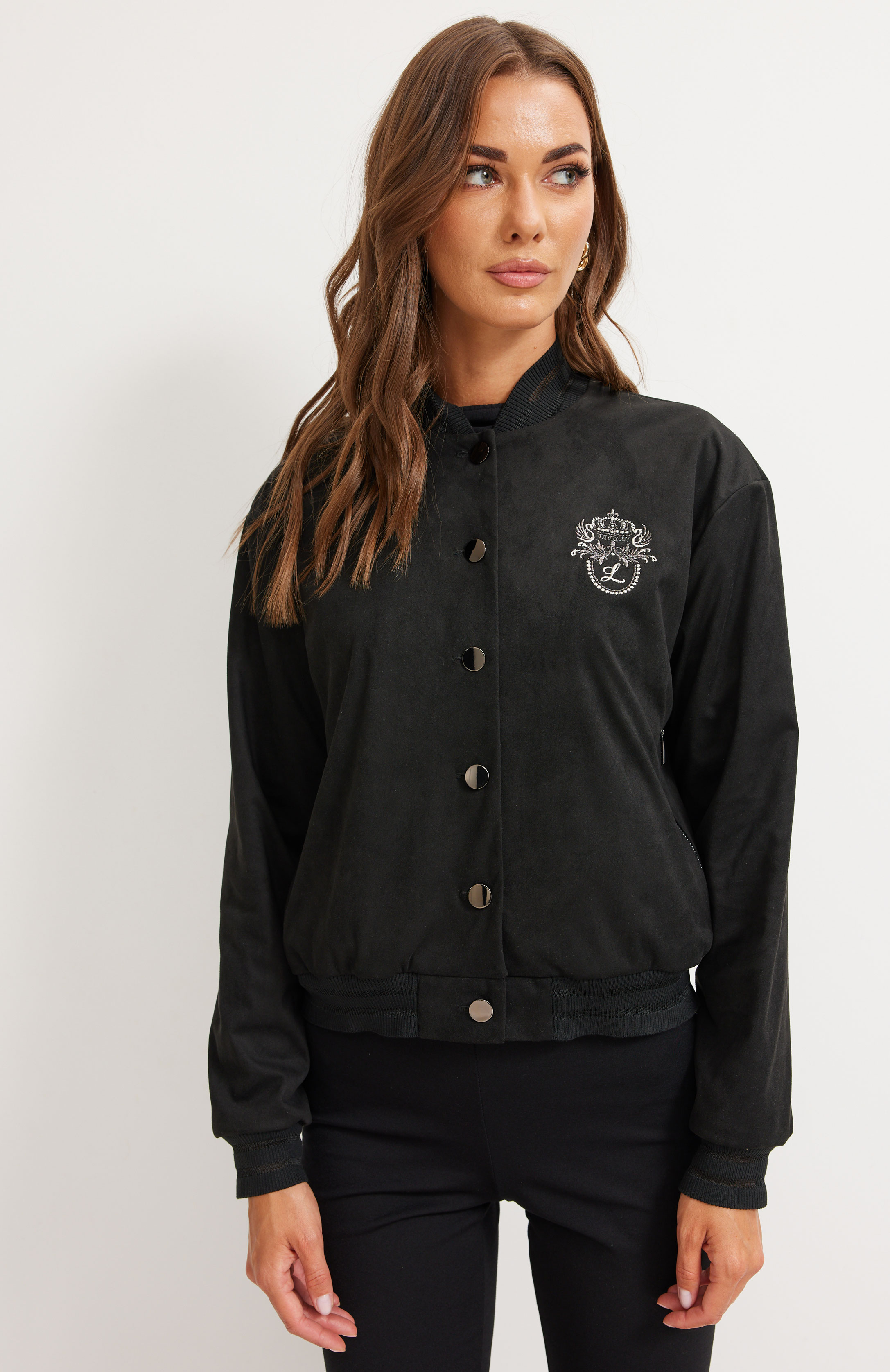 Жакет 4169 3740 44-54 Бомбер прямого силуэта из экозамши. Горловина-стойка, по центру застежка на петли и пуговицы. Рукав втачной длинный по низу манжета. По низу бомбера притачной пояс. На левой стороне полочки дизайнерская вышивка. Обращаем ваше внимание, что фурнитура может отличаться от фото. "Длина бомбера (44-48р – 52см),(50-54р - 55см)