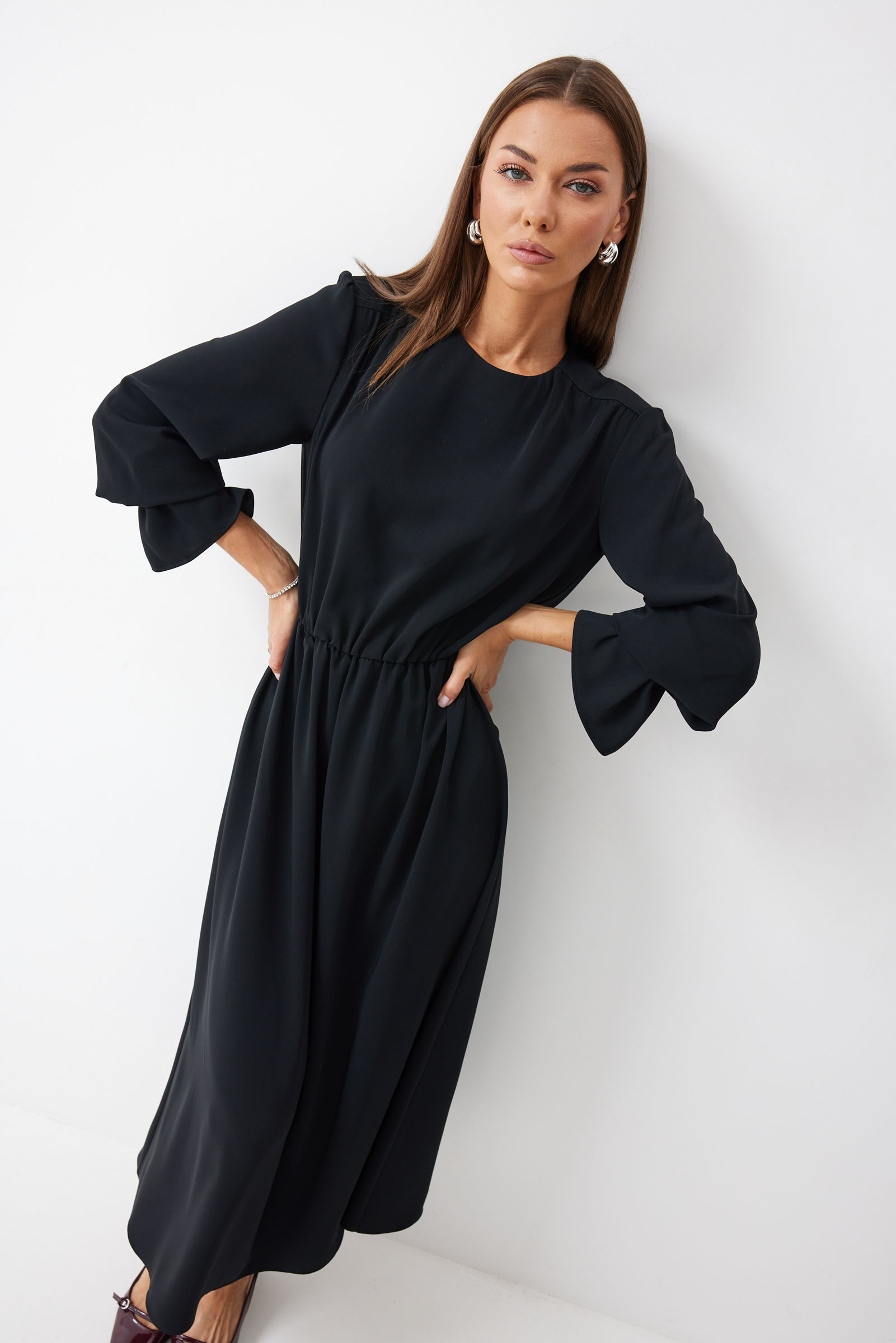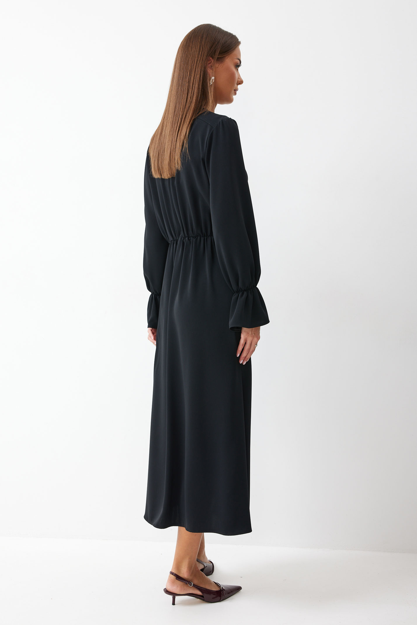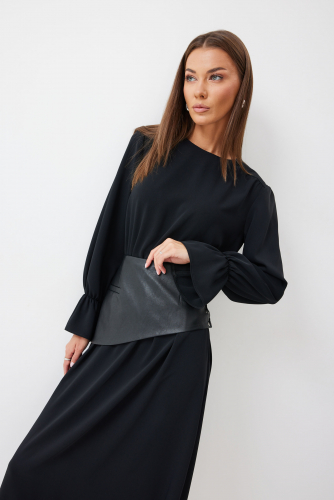 Платье 4178 (черный) 3825 44-54 Платье полуприлегающего силуэта из струящейся ткани. В области талии расположен подрез, с эластичной тесьмой. Рукав втачной, со сборкой по плечу, по низу волан, собранный на резинку. Юбка А-силуэта. Платье дополняет съёмная деталь в виде баски из эко кожи, с шнуровкой в боковом шве. "Длина (в 44-48 р. – 125 см) (в 50 -54 р. – 126 см)