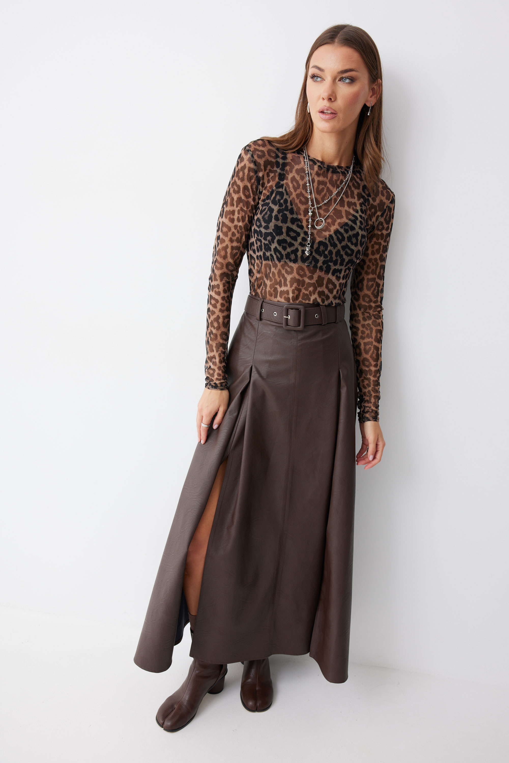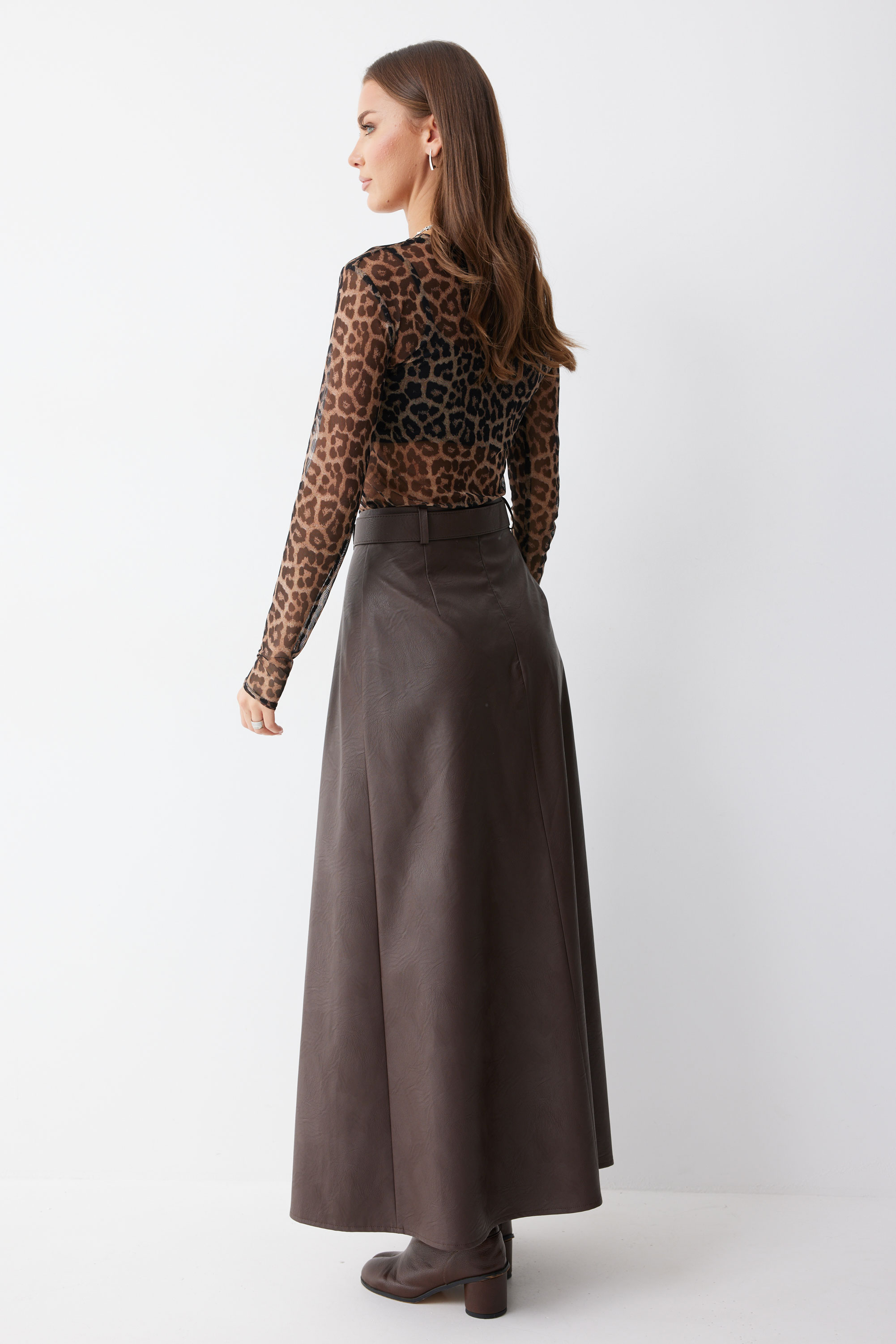 Юбка 4187 (коричневый) 2805 44-54 Стильная юбка А-силуэта из экокожи длины макси. По верху юбки притачной пояс со шлевками для ремня. На передних половинках расположены вытачки со встречной складкой и разрезами по низу. На задних половинках расположены талиевые вытачки. На спинке по центру потайная молния. В комплект входит ремень. Длина юбки (99 см + 4,5 см пояс)