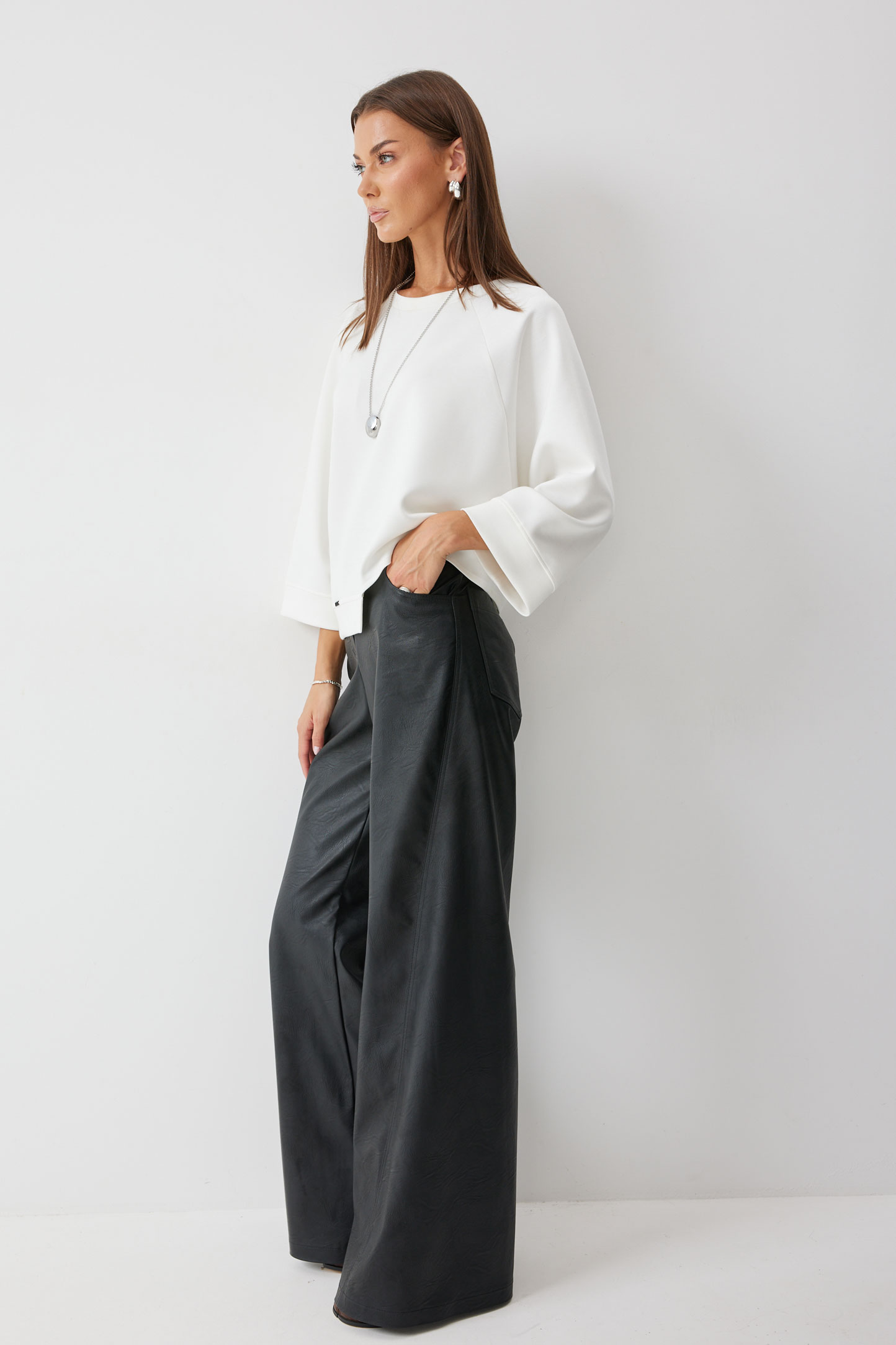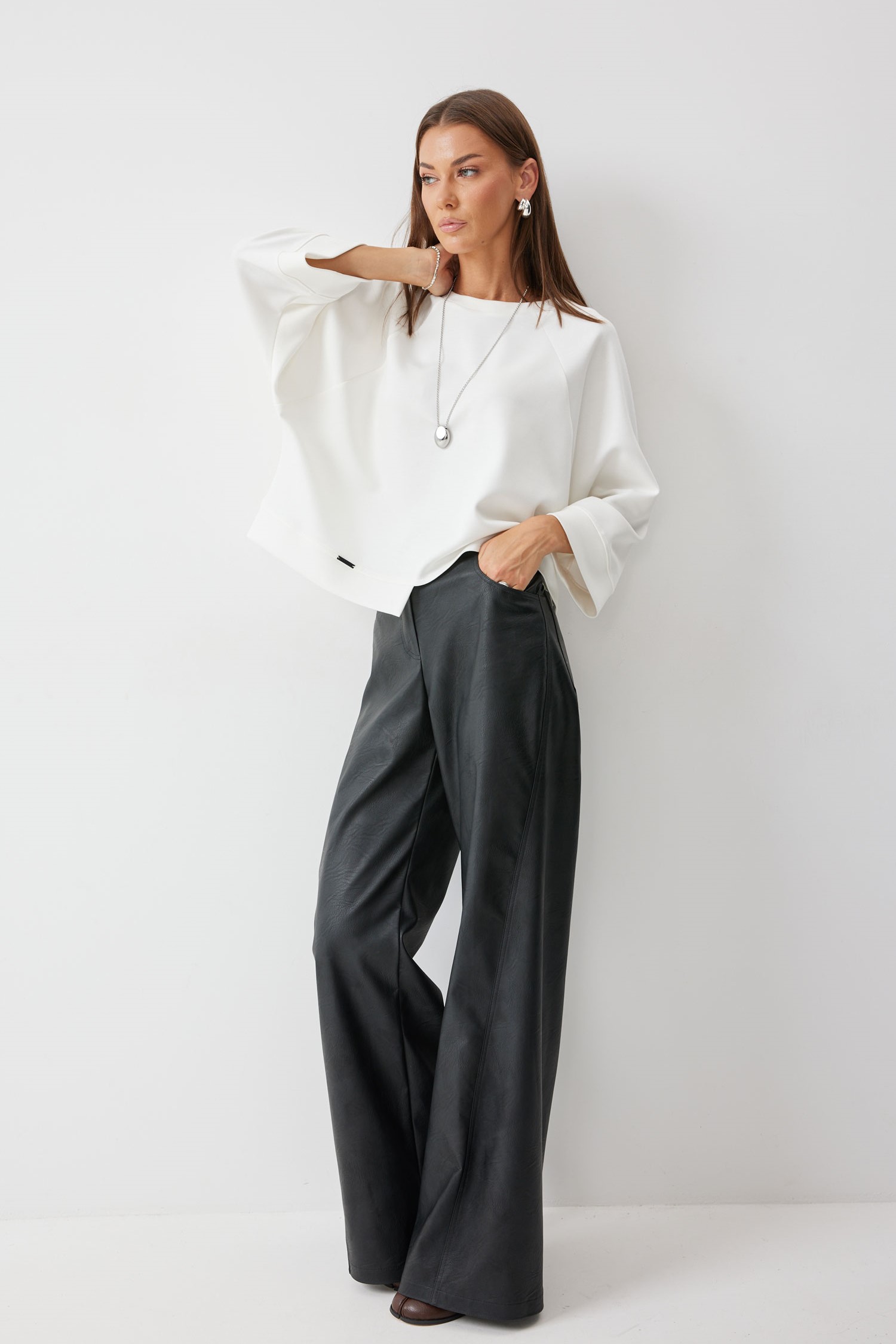 Джемпер 4205 1955 44-58 Ассиметричный джемпер прямого силуэта из трикотажного полотна. Горловина-лодочка. Рукав цельнокроеный с декоративным подрезом. По низу джемпера декоративный пояс с пришивным декором. "Длина рукава (44-50р – 54см),(52-58р - 58см)