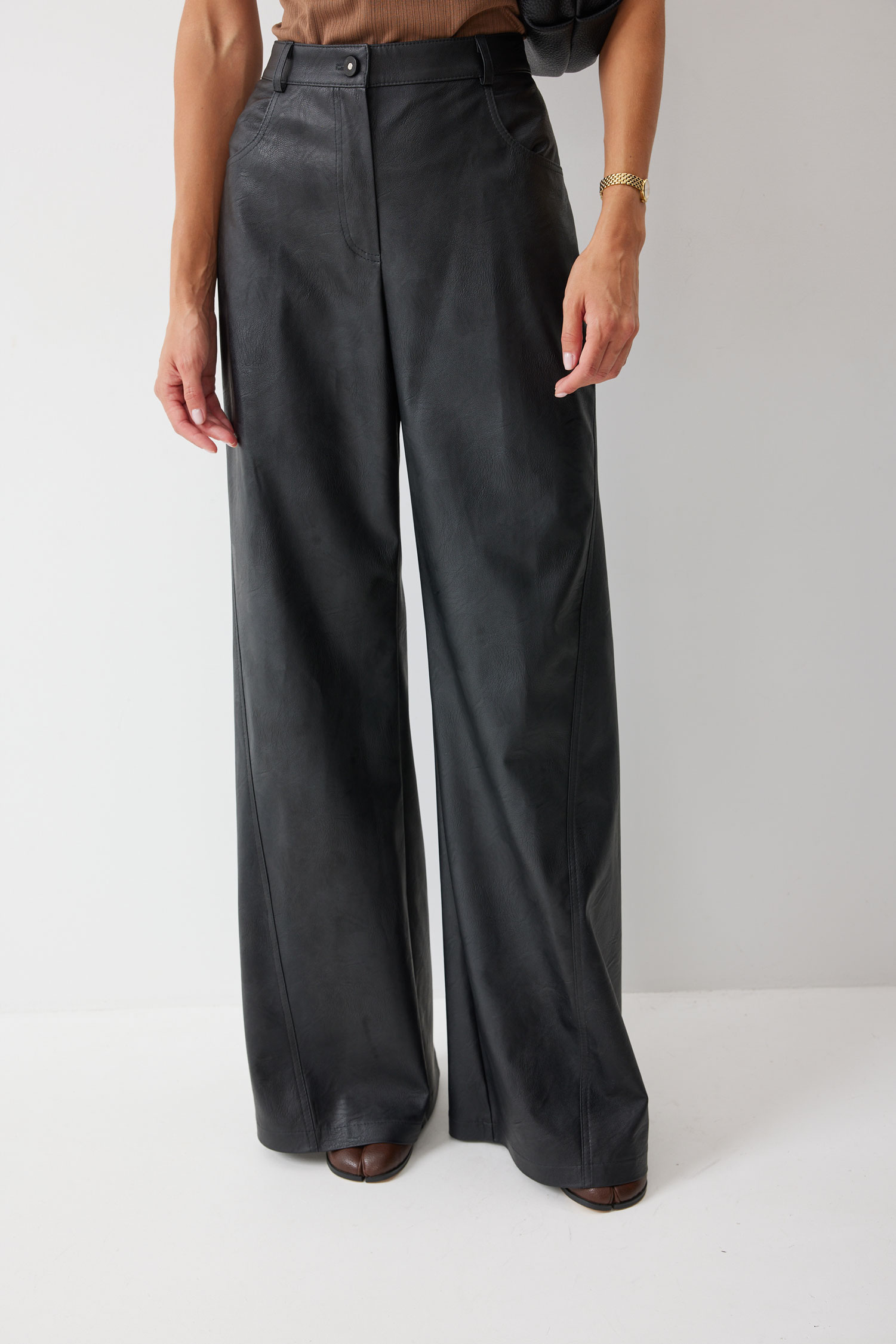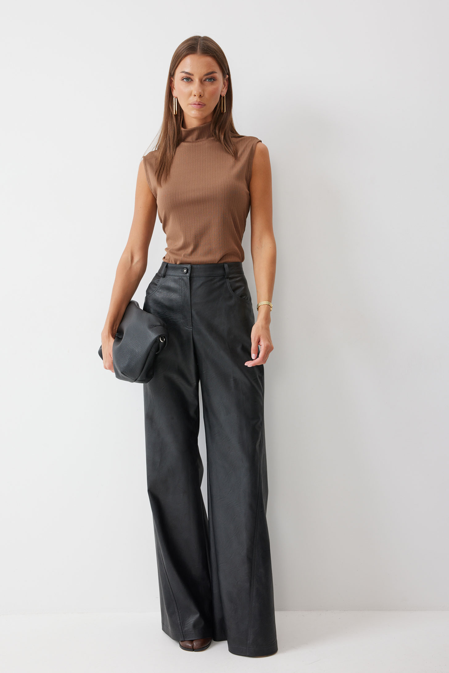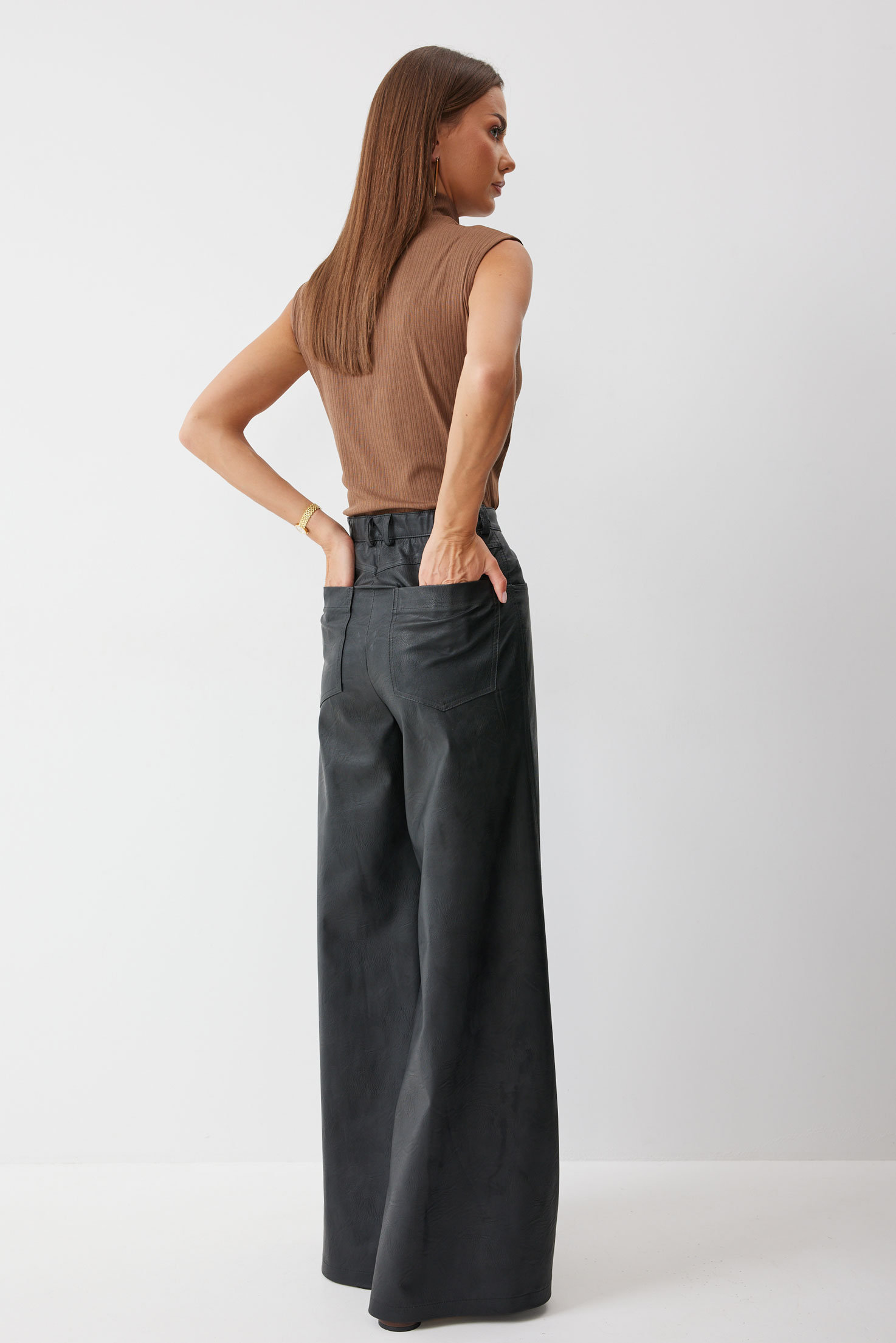 Брюки 4207 (черный) 2805 44-54 Брюки прямого силуэта расширенные книзу из экокожи. По верху притачной пояс с застежкой на петлю и пуговицу и шлевками для ремня. На передних половинках обработаны карманы и застежка молния в среднем шве. На задних половинках кокетка и накладные карманы. На кармане дизайнерская вышивка. По поясу задних половинок брюк резинка. Обращаем ваше внимание, что фурнитура может отличаться от фото. Длина брюк (110+3,5см пояс)