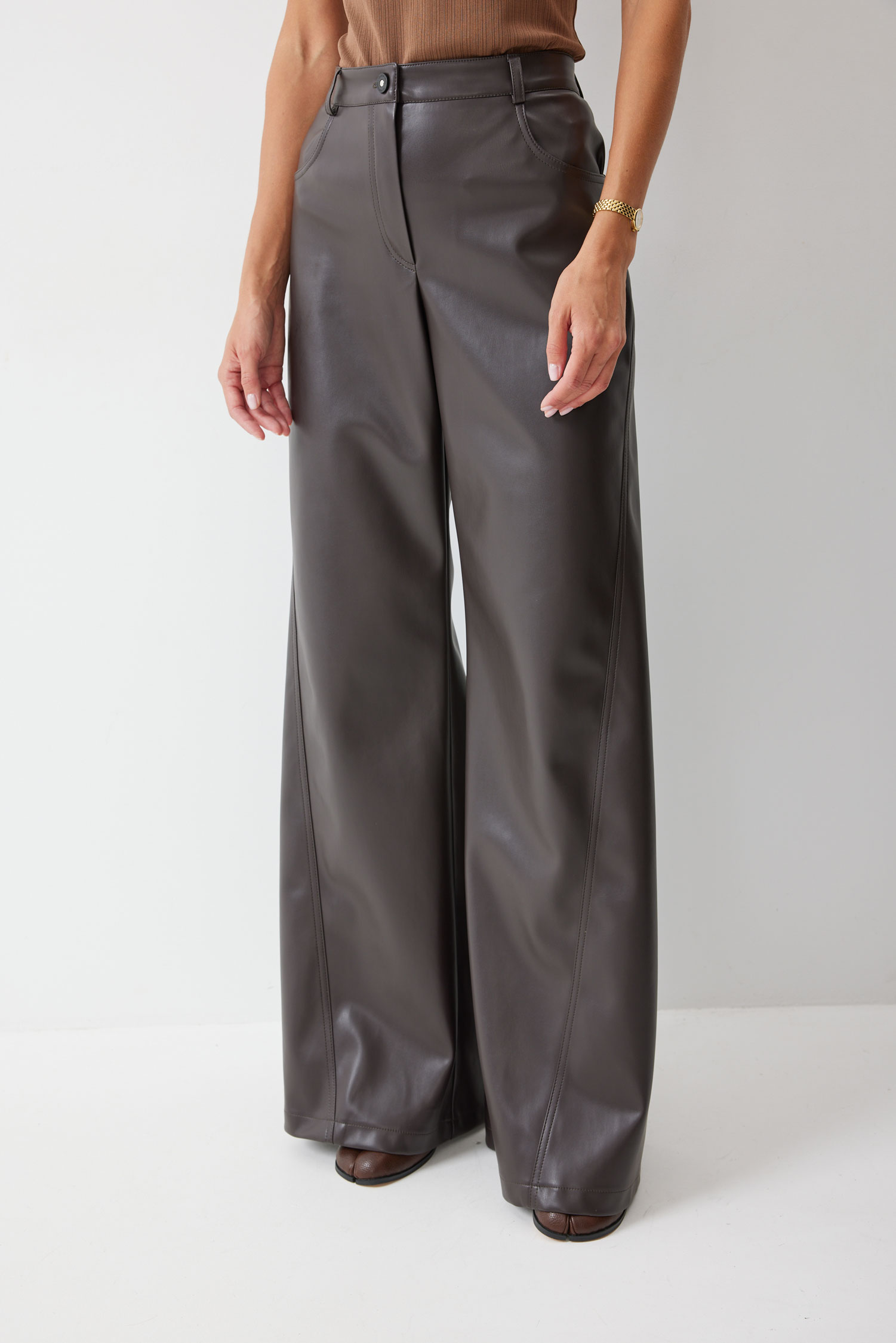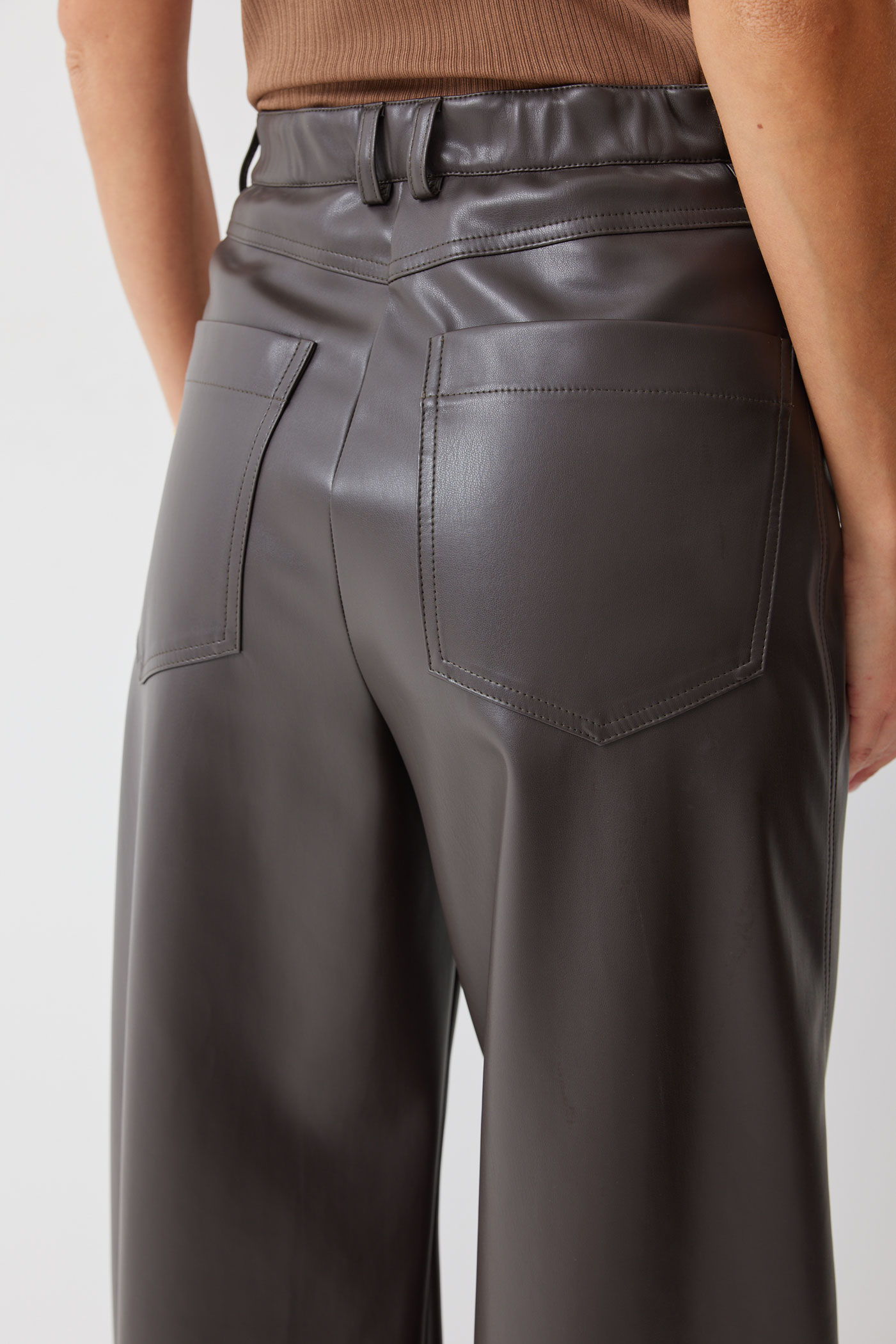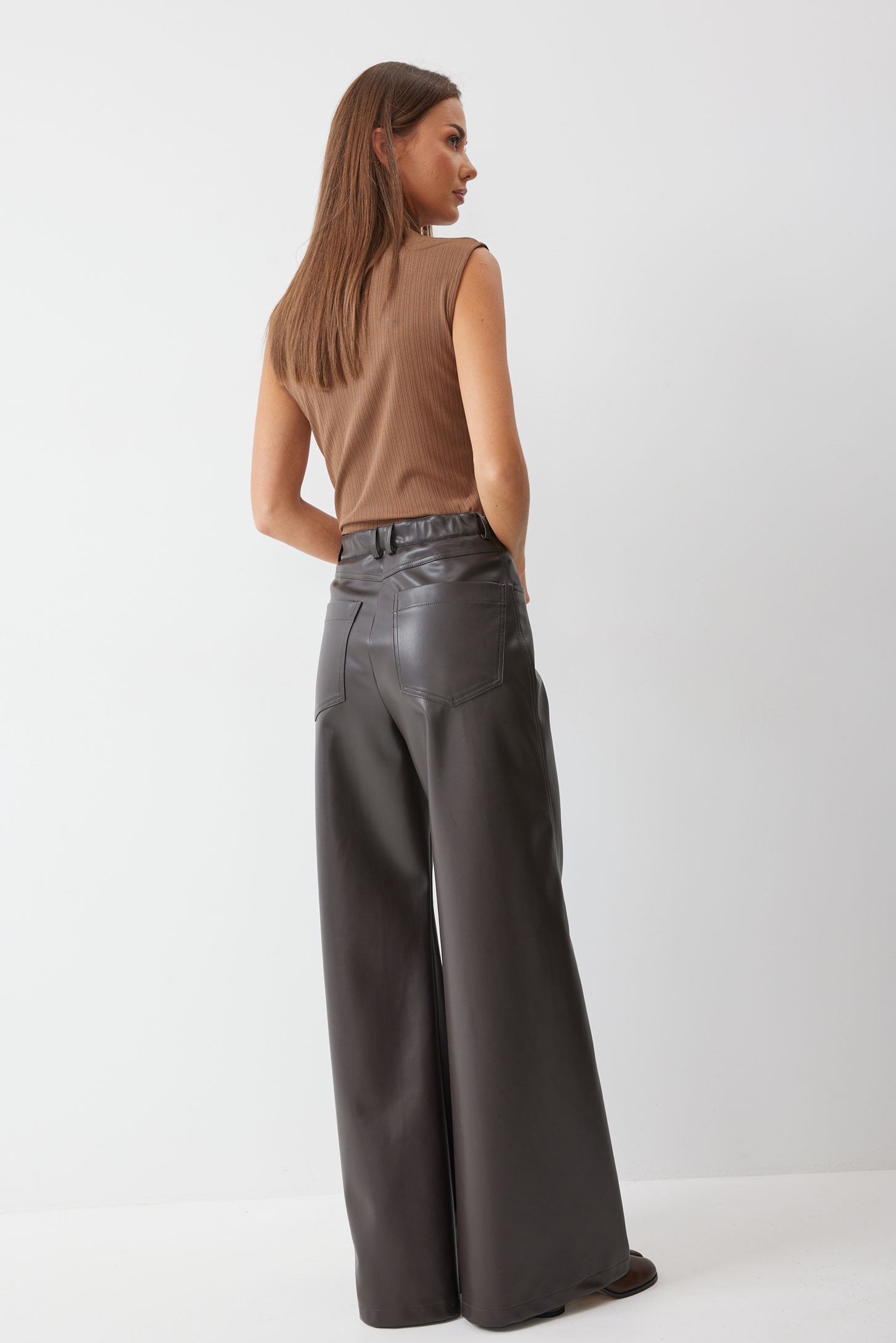 Брюки 4207 (шоколад) 2805 44-54 Брюки прямого силуэта расширенные книзу из экокожи. По верху притачной пояс с застежкой на петлю и пуговицу и шлевками для ремня. На передних половинках обработаны карманы и застежка молния в среднем шве. На задних половинках кокетка и накладные карманы. На кармане дизайнерская вышивка. По поясу задних половинок брюк резинка. Обращаем ваше внимание, что фурнитура может отличаться от фото. Длина брюк (110+3,5см пояс)