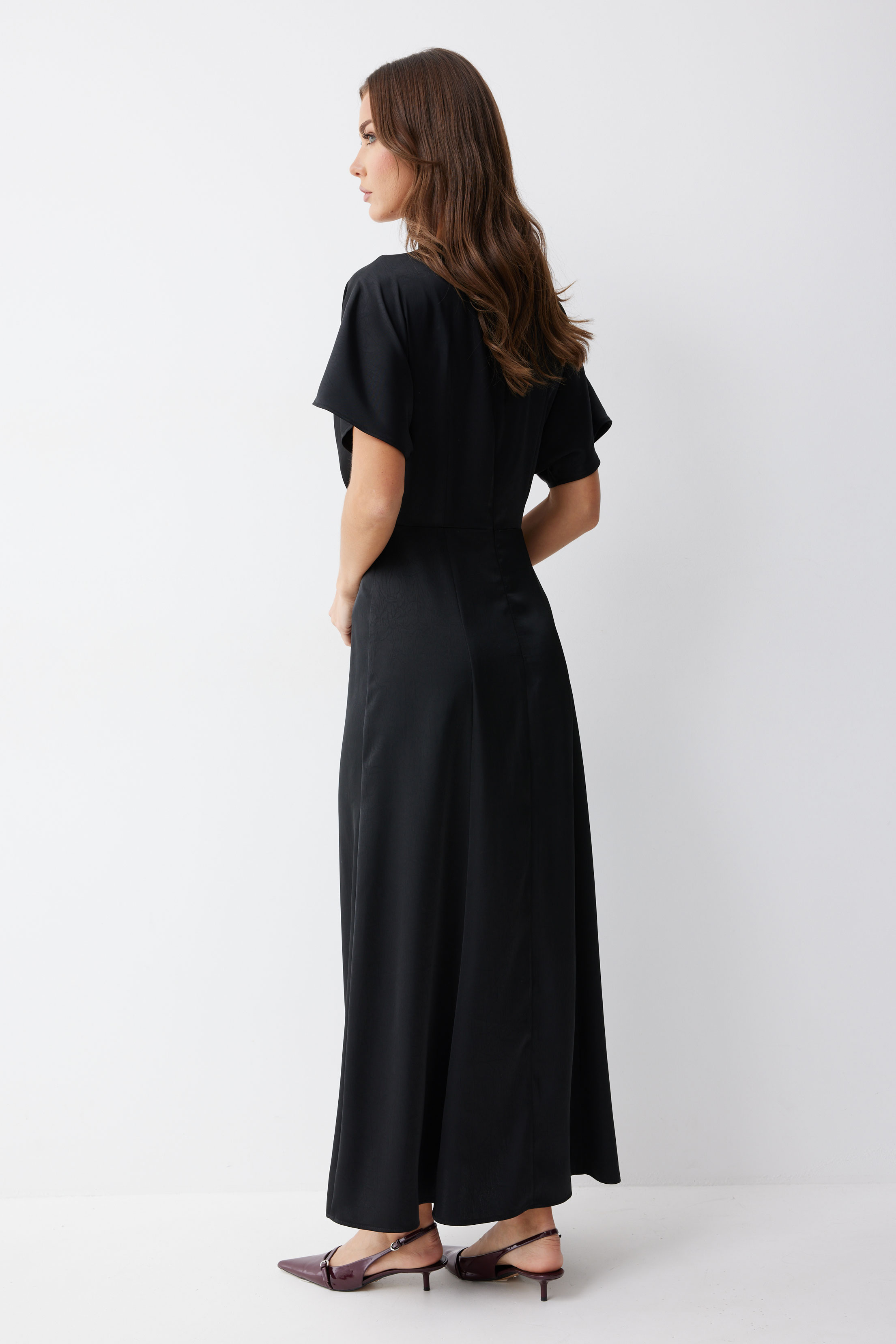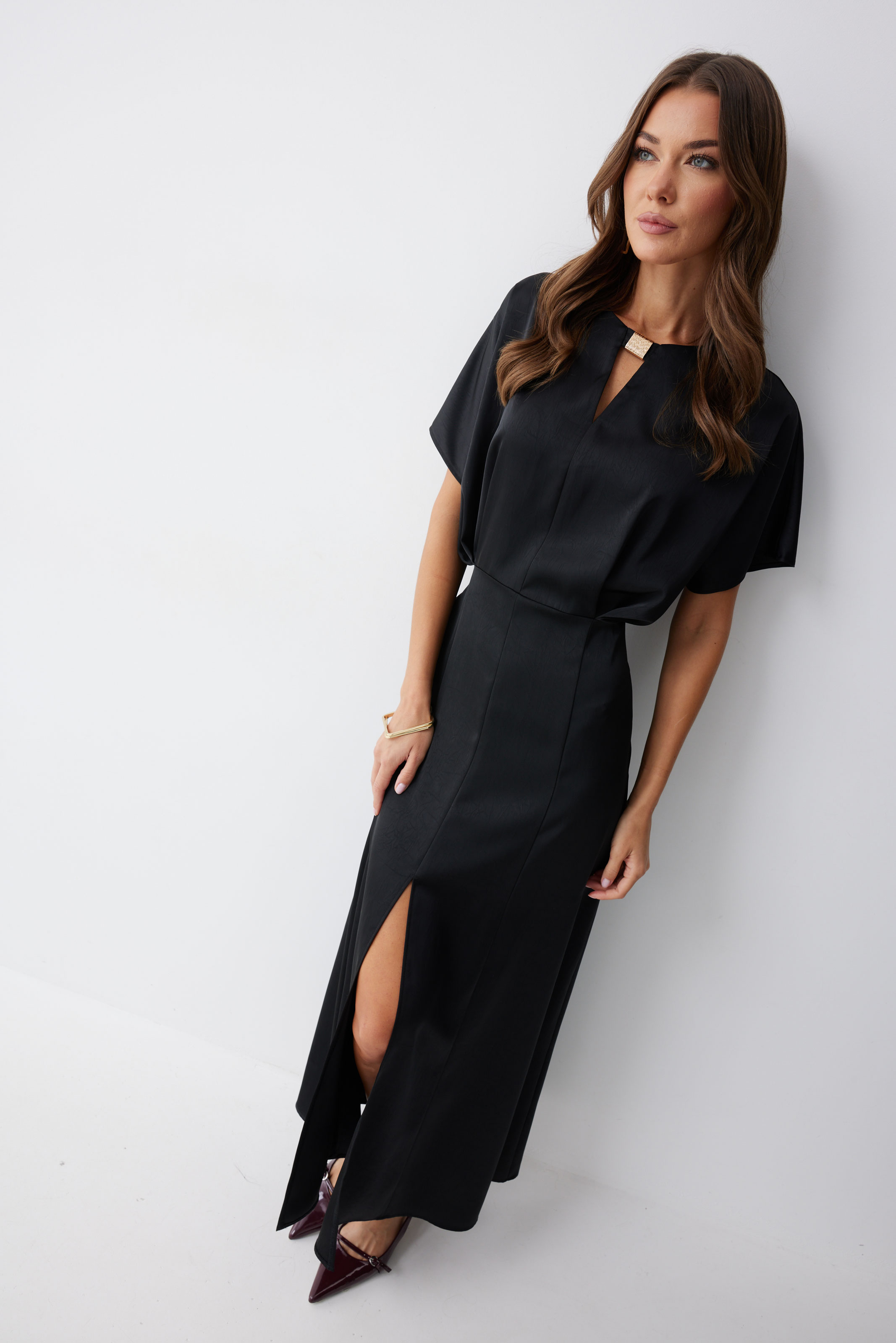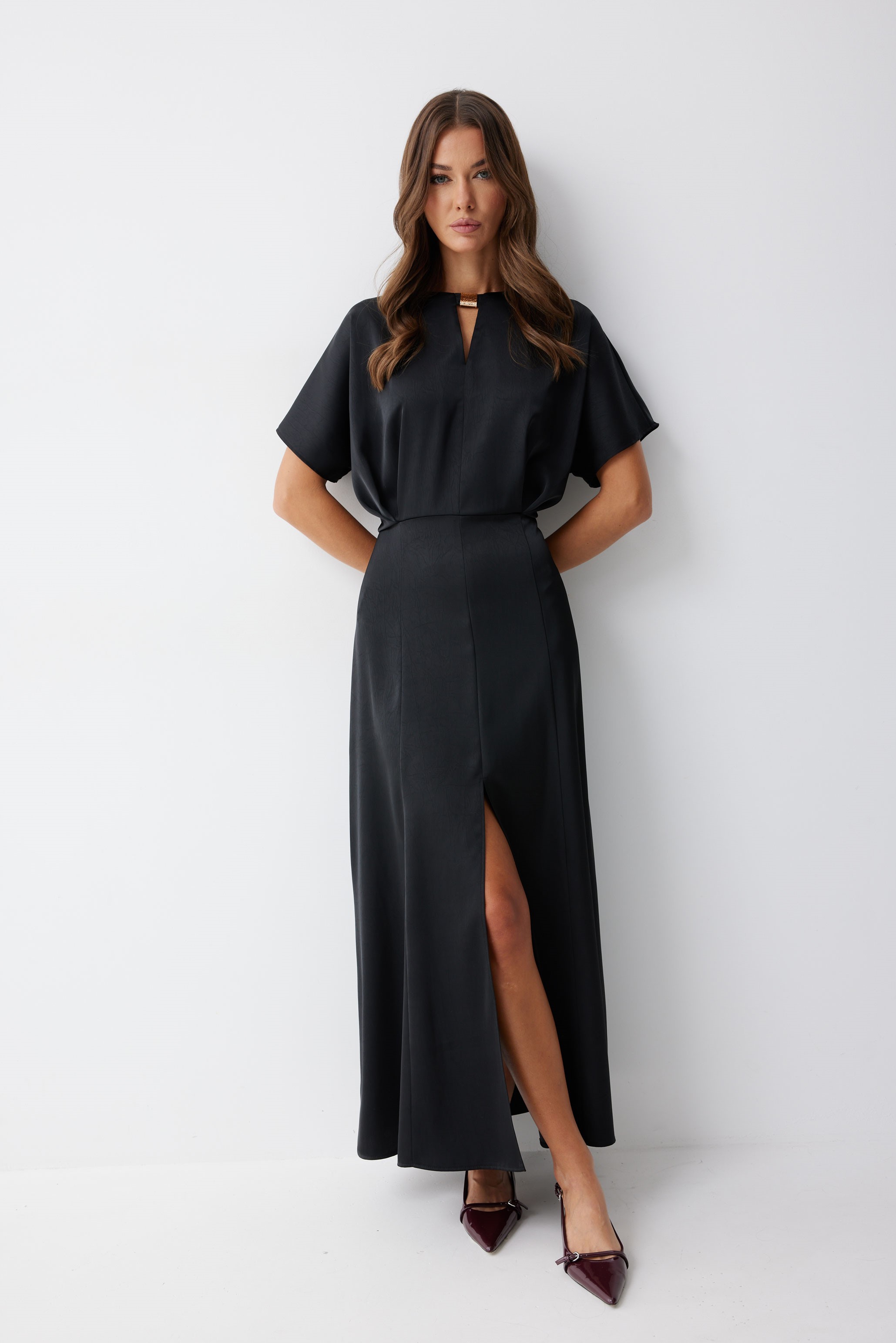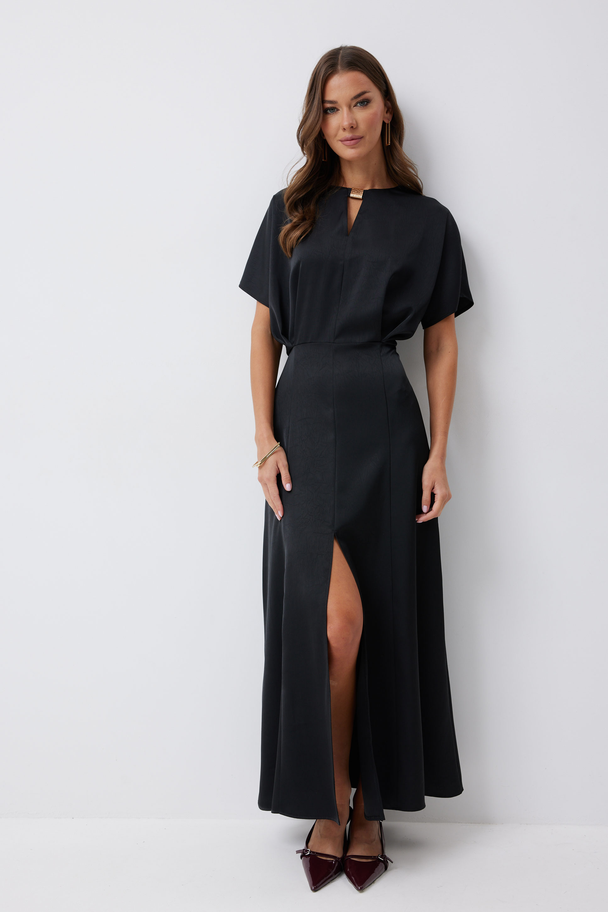 Платье 4210 (черный) 2805 44-54 Нарядное платье из струящейся ткани длины макси. Рукав цельнокроеный. Платье отрезное по линии талии, на полочке заложены складки. Горловина округлая, с декоративно протяжкой по центру. По спинке средний шов с застежкой на потайную молнию. Юбка расширенна книзу от бедра. Обращаем ваше внимание, что фурнитура может незначительно отличаться от фото. "Длина платья 137см