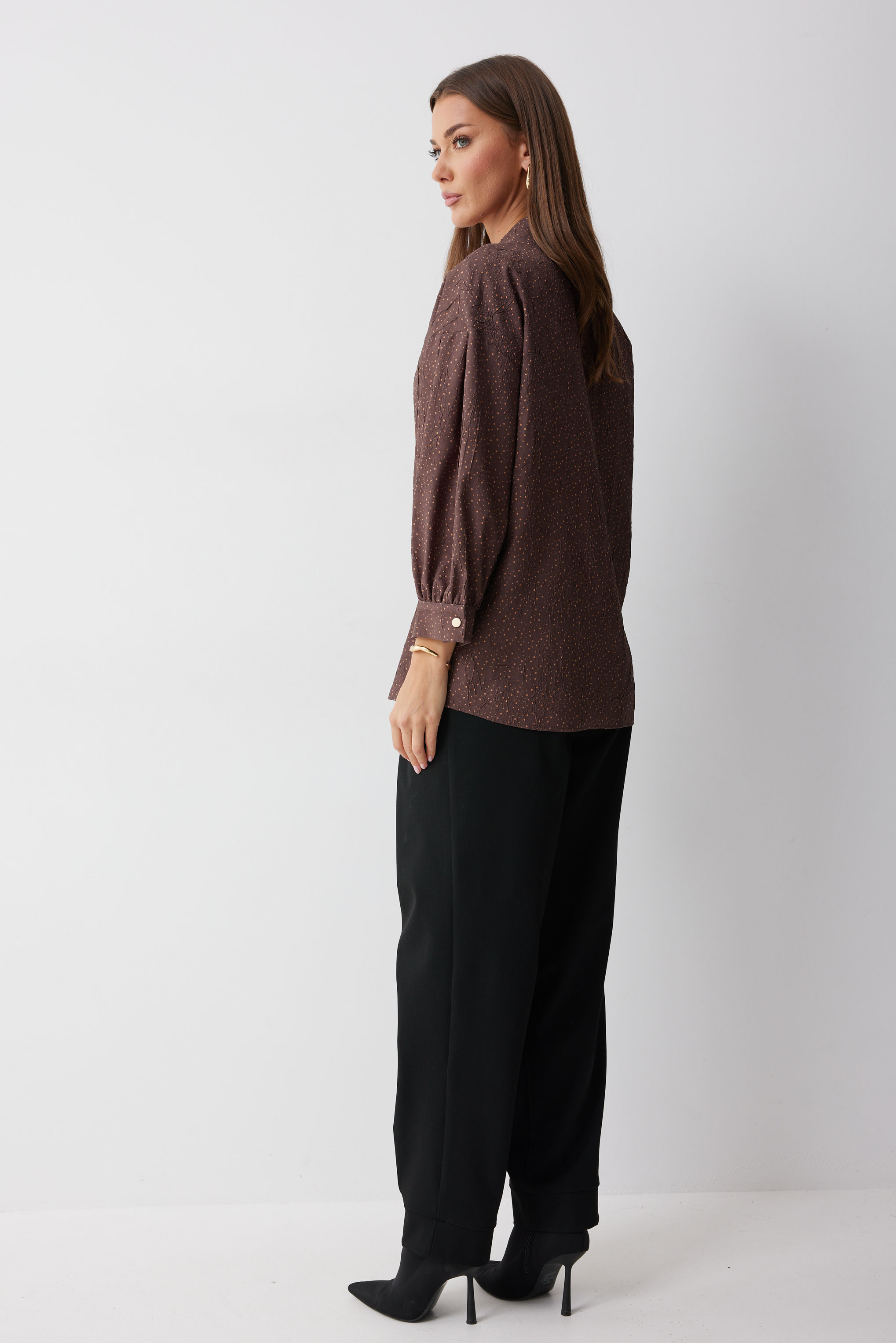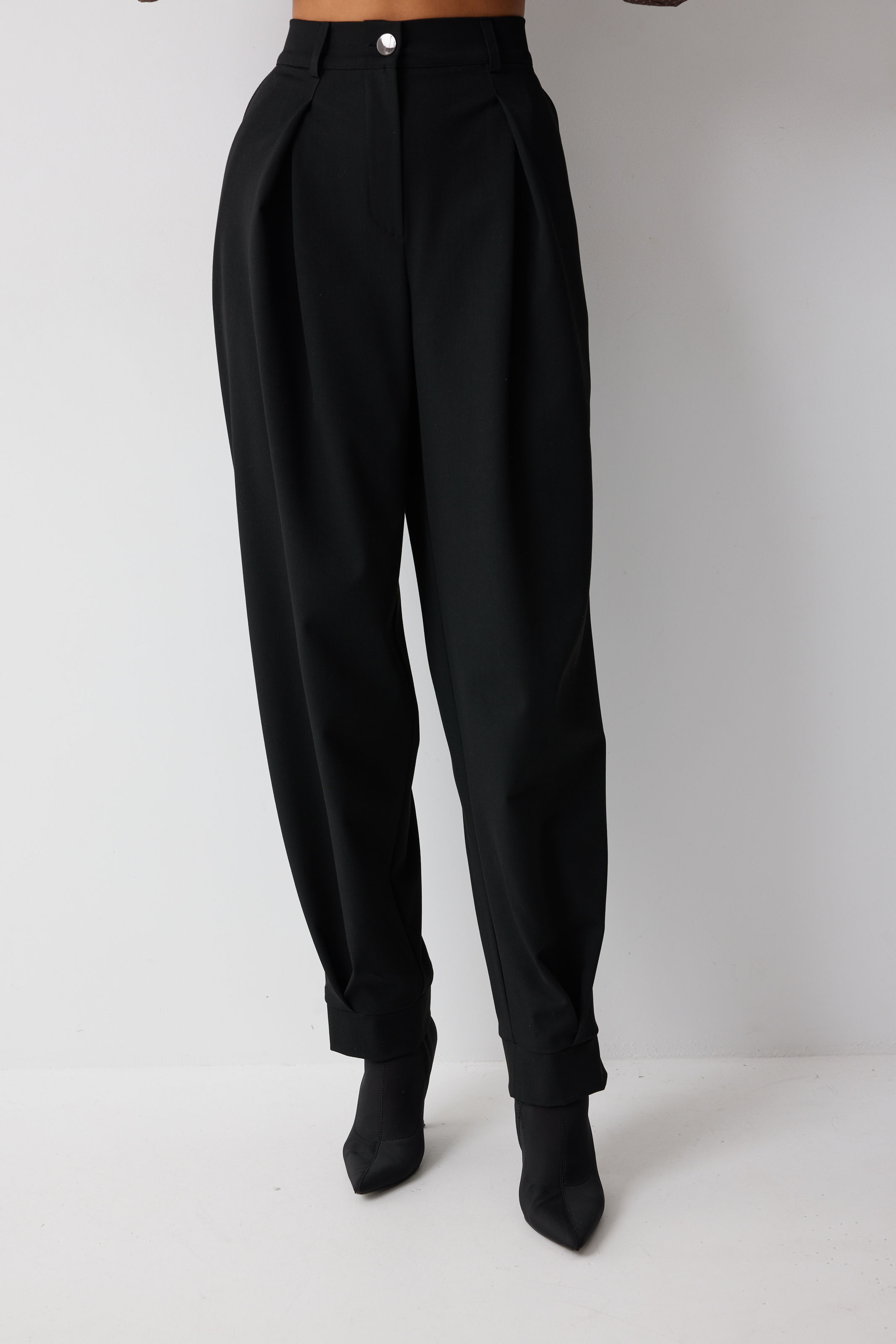 Брюки 4218 (черный) 2720 44-54 Брюки из костюмной ткани, зауженные книзу. По верху брюк притачной пояс с застежкой на петлю и пуговицу и шлевками для ремня. По поясу задних половинок брюк резинка. На передних половинках обработаны боковые карманы и застежка молния в среднем шве. По верху и низу брюк расположены встречные складки. По низу брюк – манжеты. На задних половинках накладные карманы. Длина брюк 103+4,5см пояс