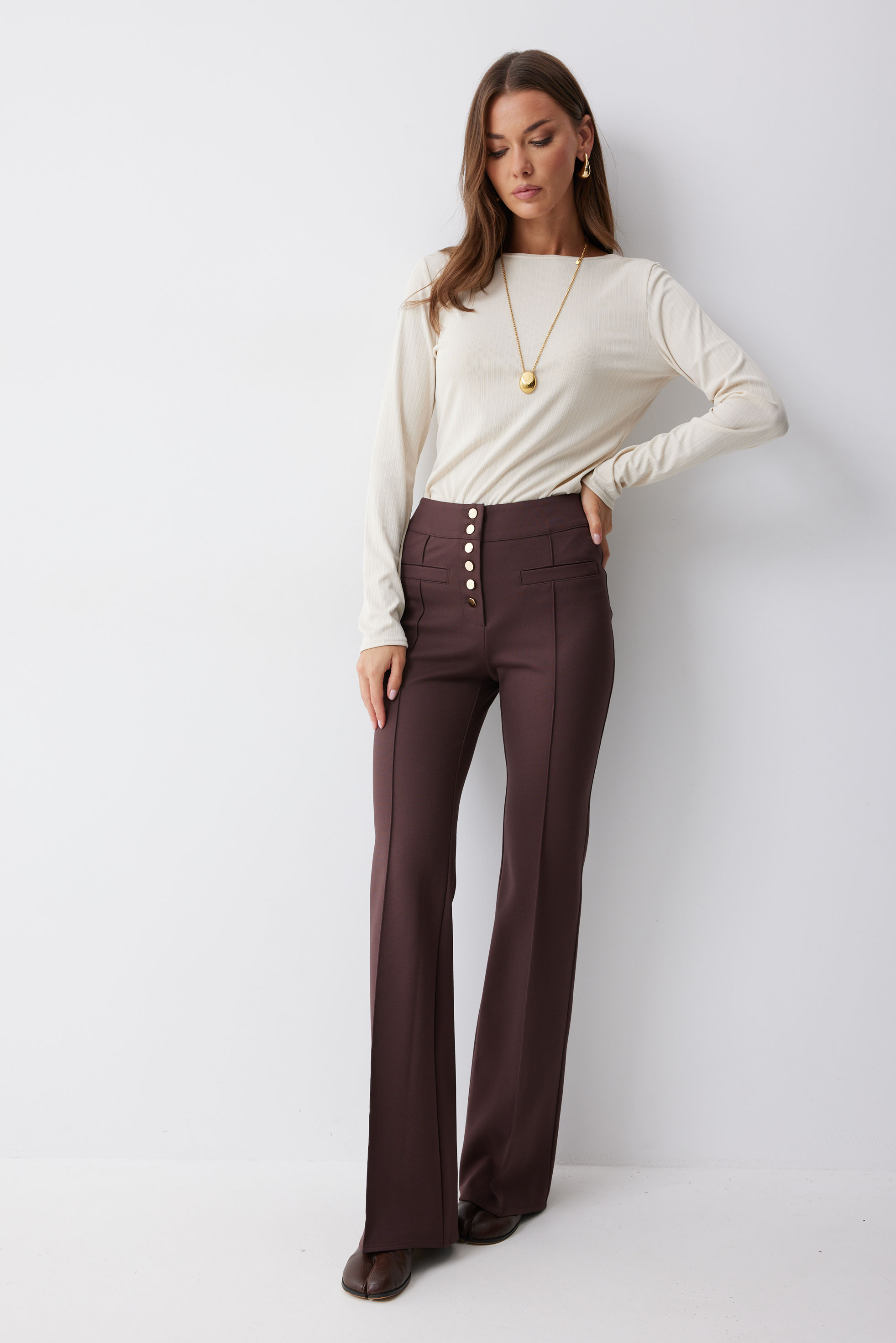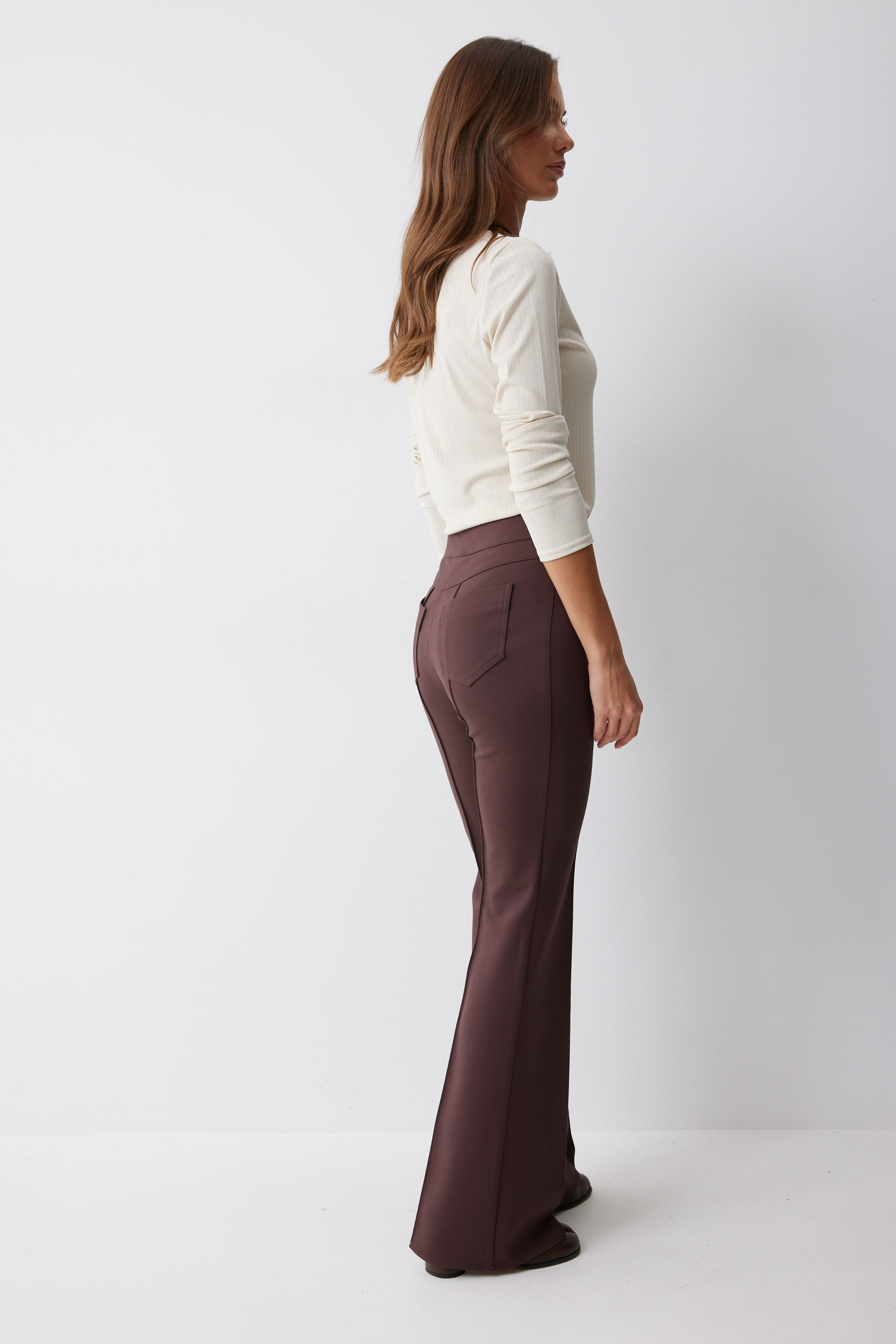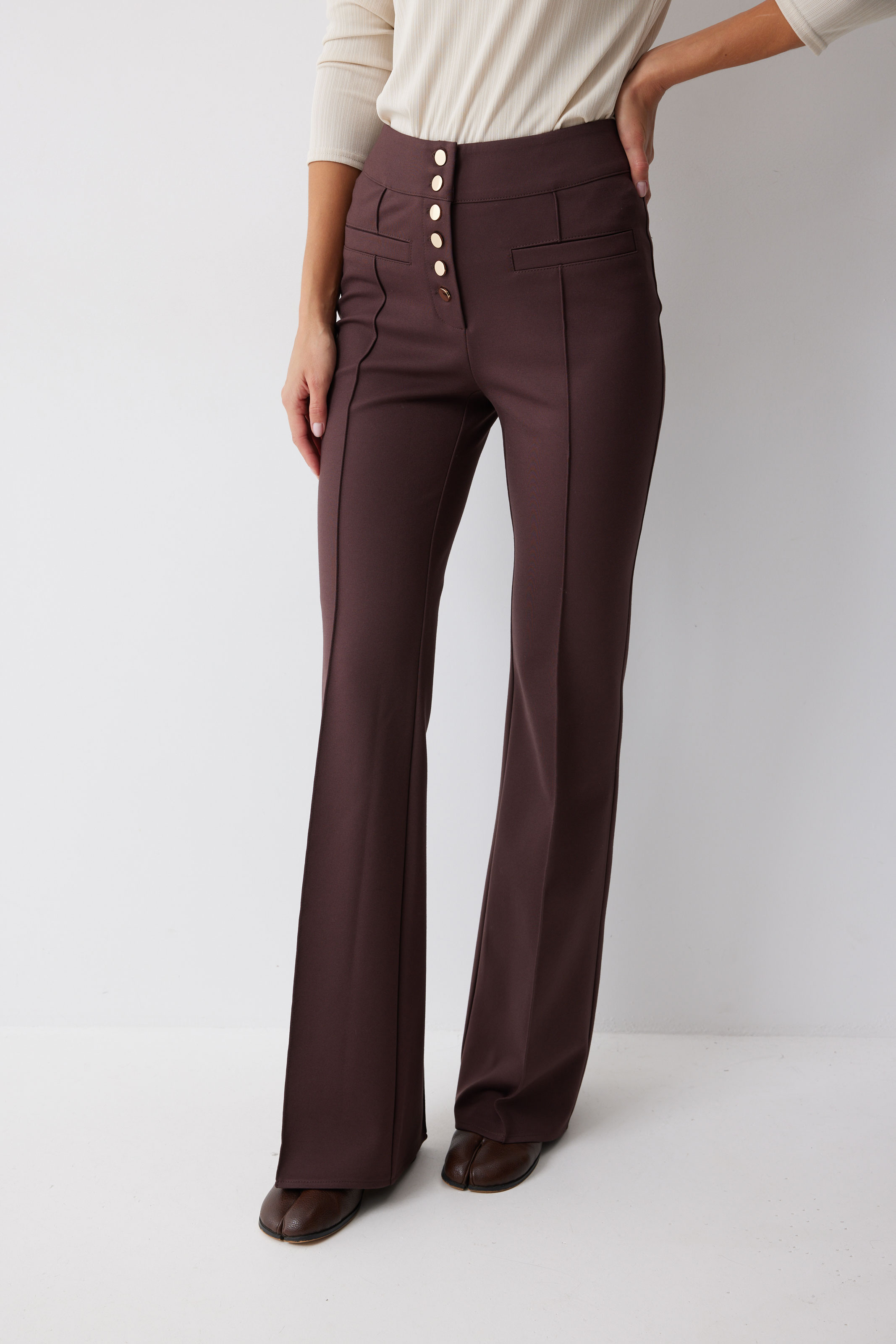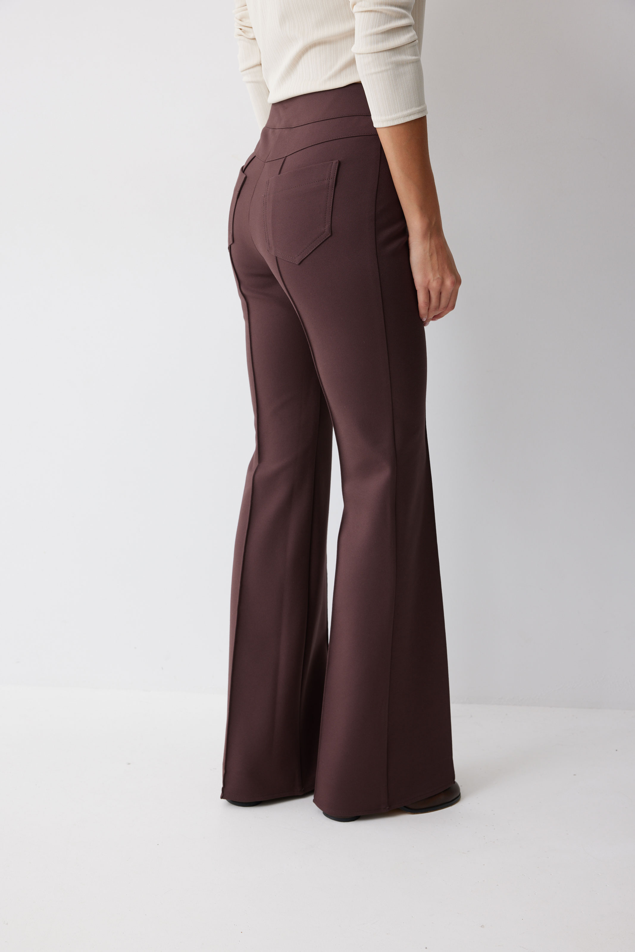 Брюки 4222 (коричневый) 2550 42-52 Брюки прямого силуэта с защипами из трикотажного полотна. По верху брюк притачной пояс и центральная застежка на петли и пуговицы. На передних половинках защипы и декоративные листочки. На задних половинках брюк накладные карманы. Обращаем ваше внимание, что фурнитура может отличаться от фото. Длина брюк (44-48р - 112 с поясом)(50-54р - 113см с поясом)