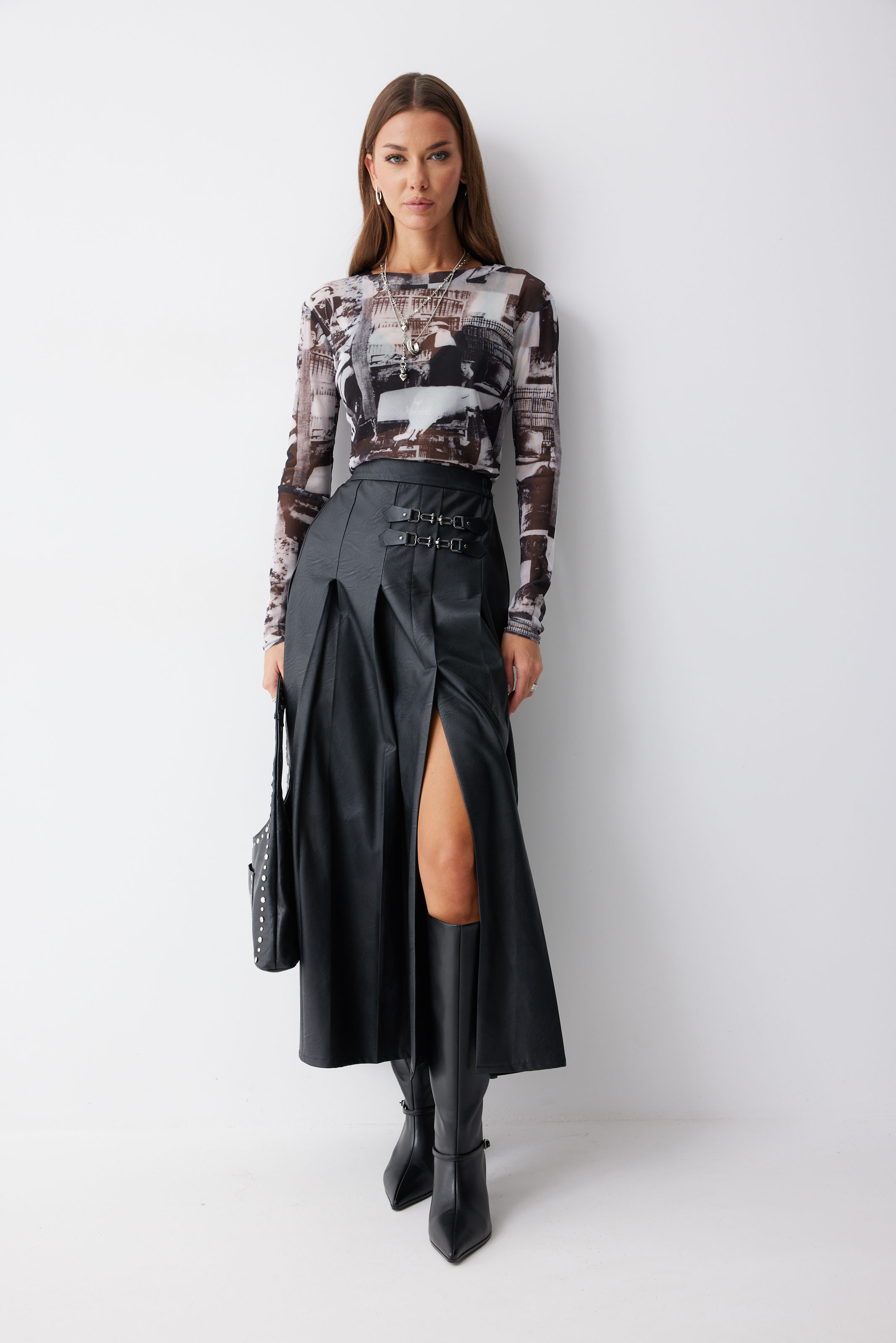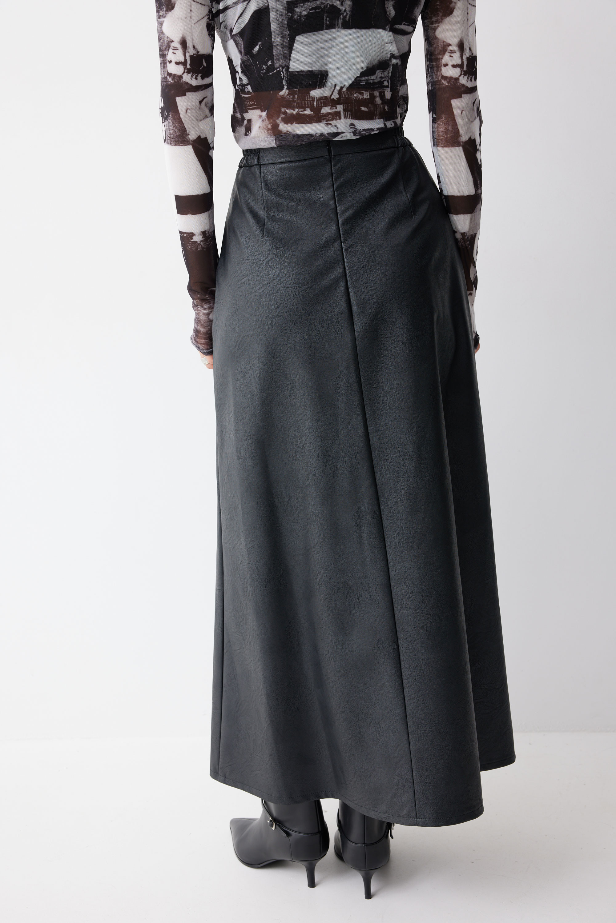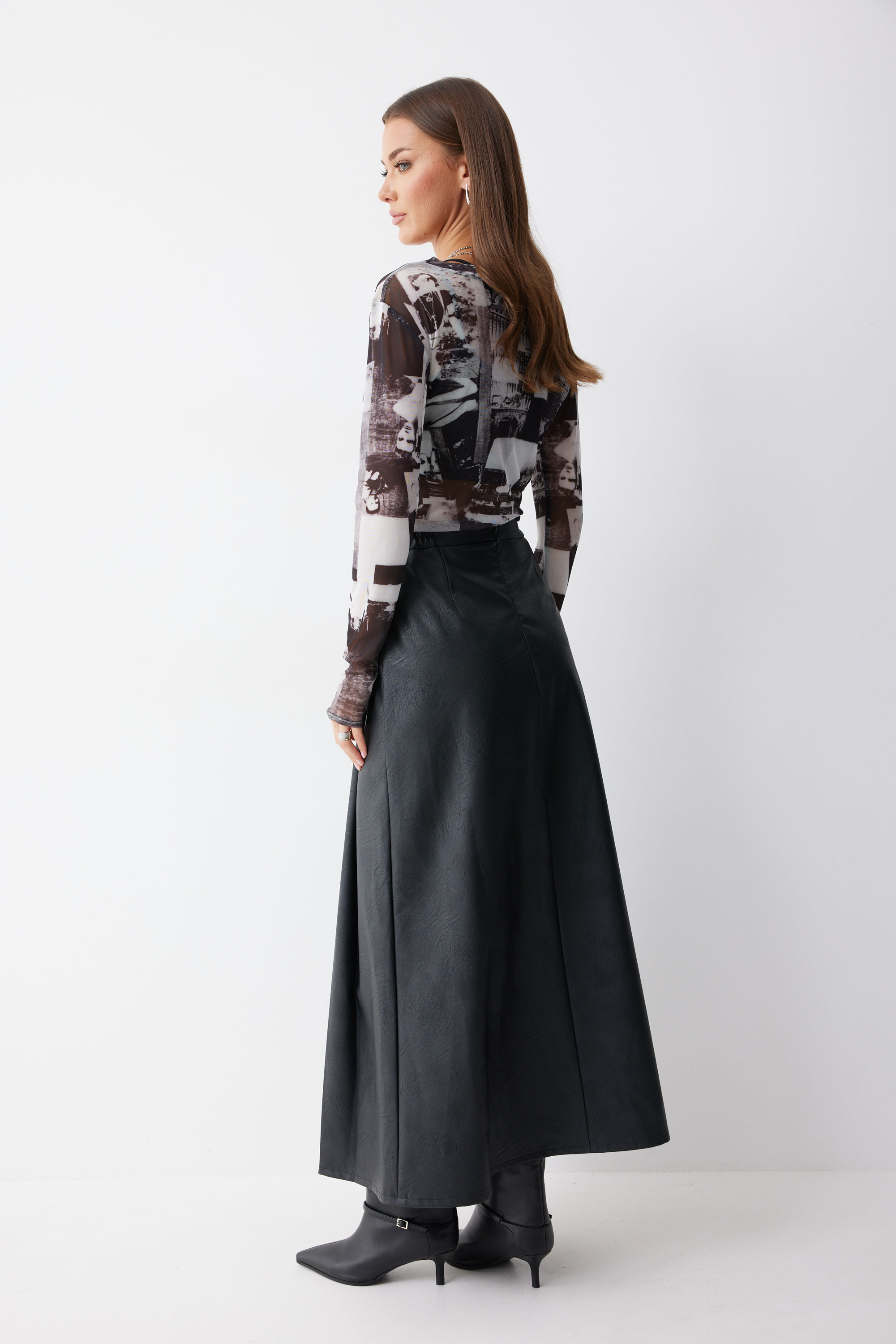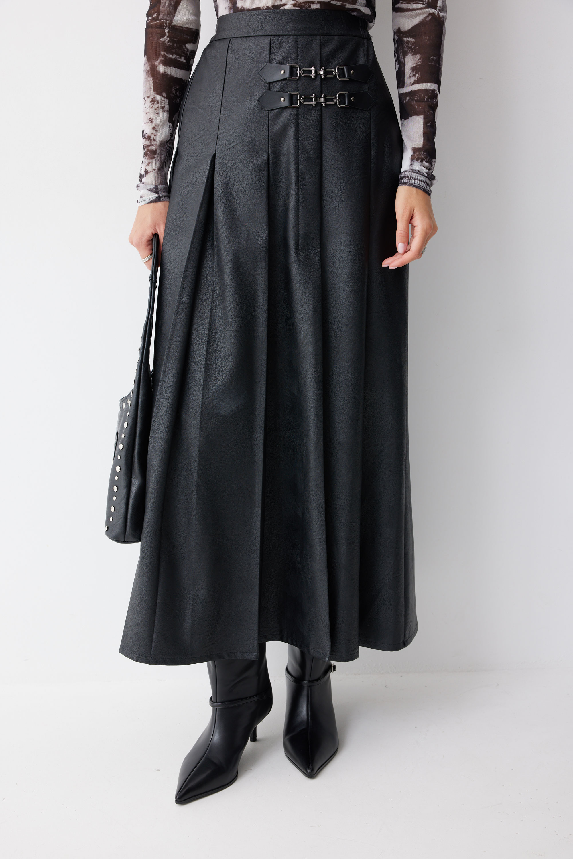Юбка 4223 (черный) 2805 44-54 Юбка А-силуэта из экокожи на хлопковой основе длины макси. По верху юбки притачной пояс со шлевками для ремня. Переднее полотнище юбки со складками и шлицей и декоративной фурнитурой. На задних половинках расположены талиевые вытачки. На спинке в центральном шве потайная молния. По бокам в поясе вставлена резинка от складки до вытачки. Длина юбки (94+3,5см пояс)
