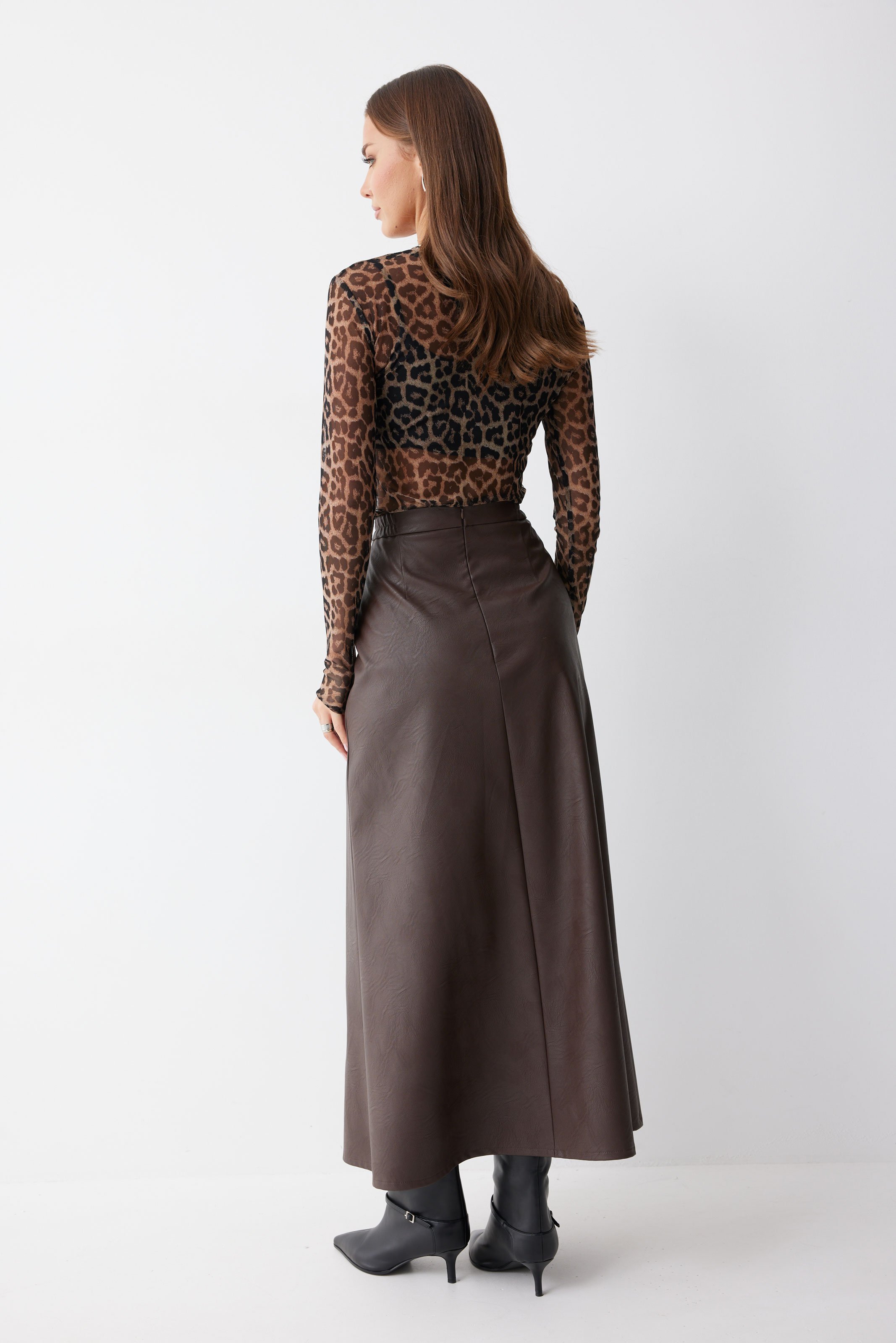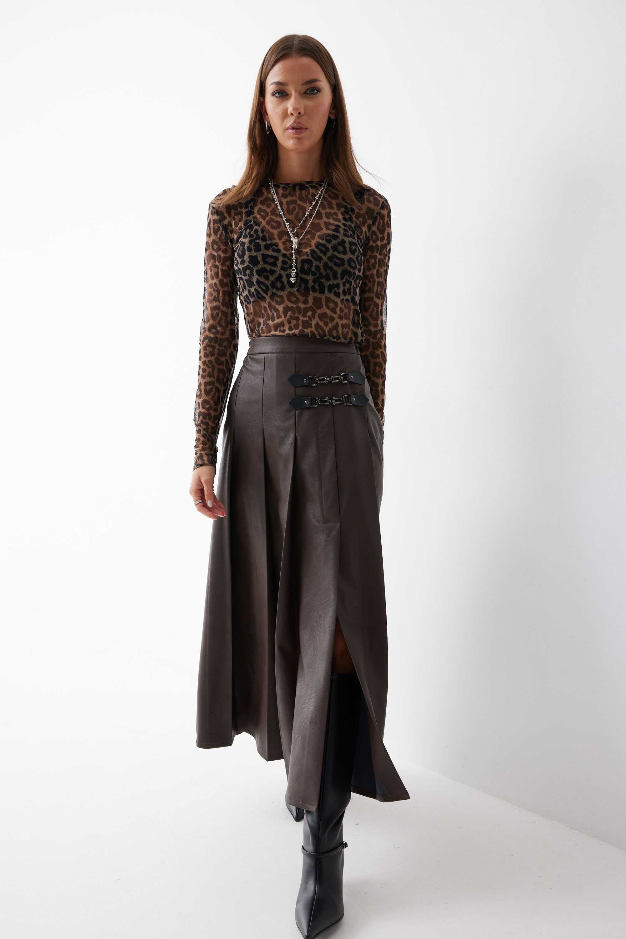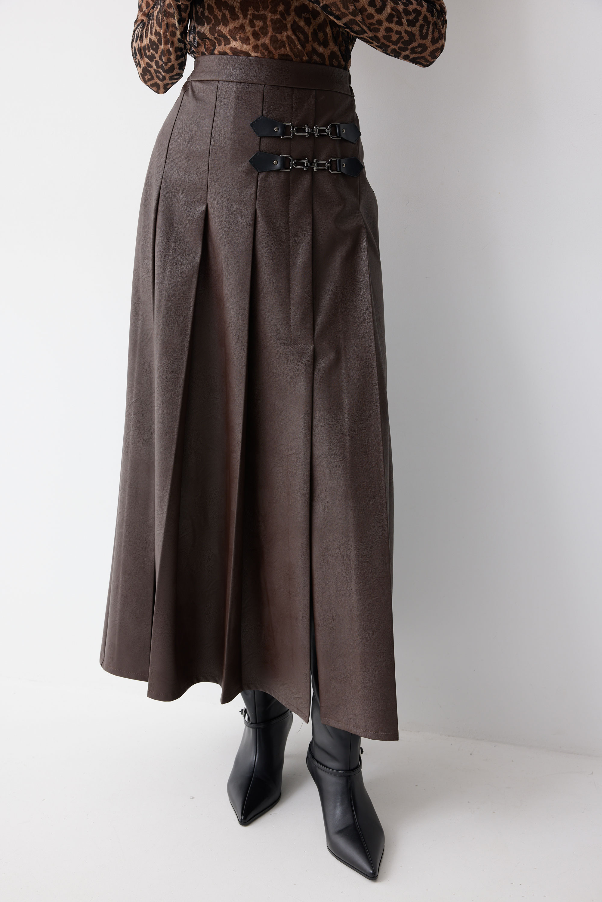 Юбка 4223 (коричневый) 2805 44-54 Юбка А-силуэта из экокожи на хлопковой основе длины макси. По верху юбки притачной пояс со шлевками для ремня. Переднее полотнище юбки со складками и шлицей и декоративной фурнитурой. На задних половинках расположены талиевые вытачки. На спинке в центральном шве потайная молния. По бокам в поясе вставлена резинка от складки до вытачки. Длина юбки (94+3,5см пояс)