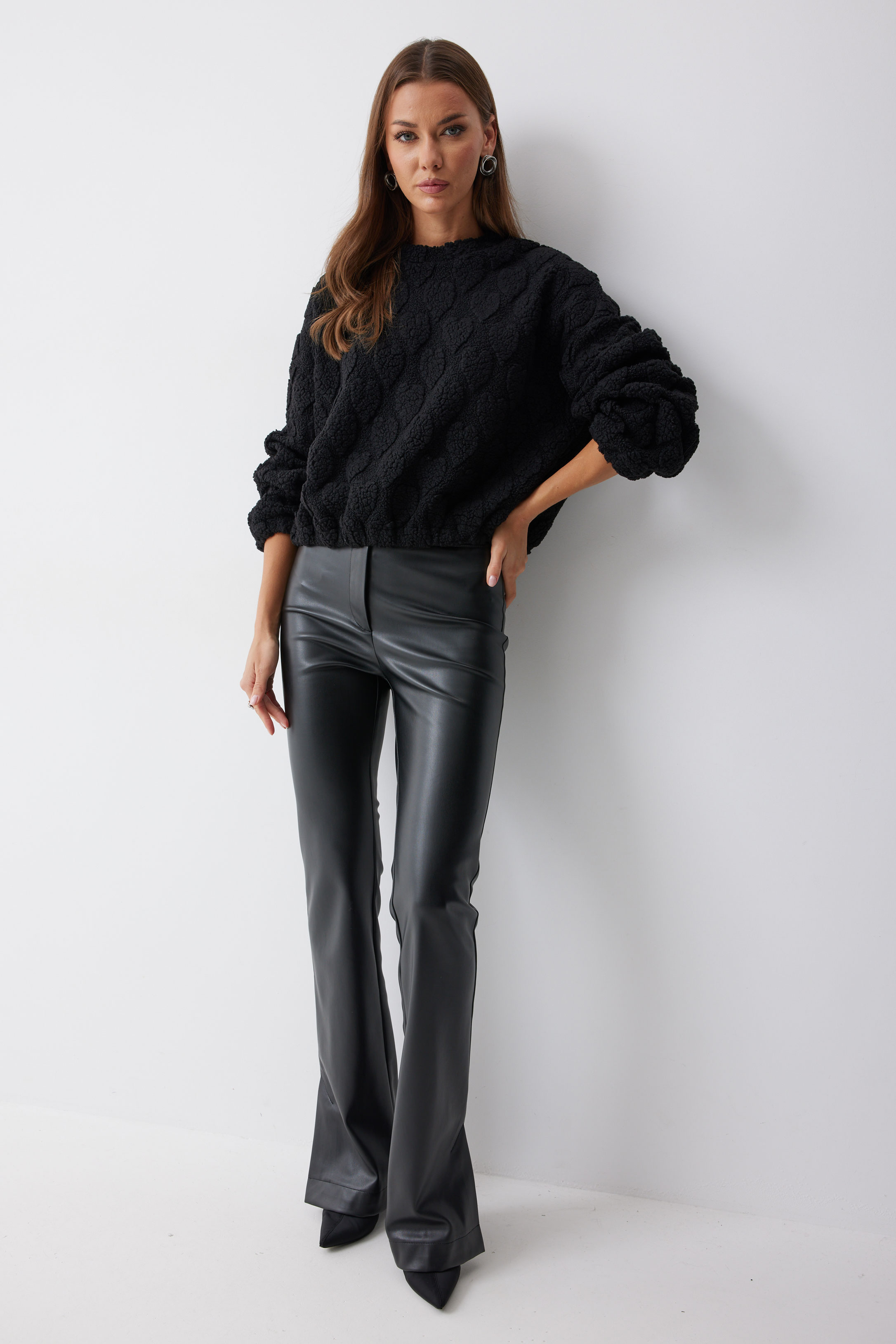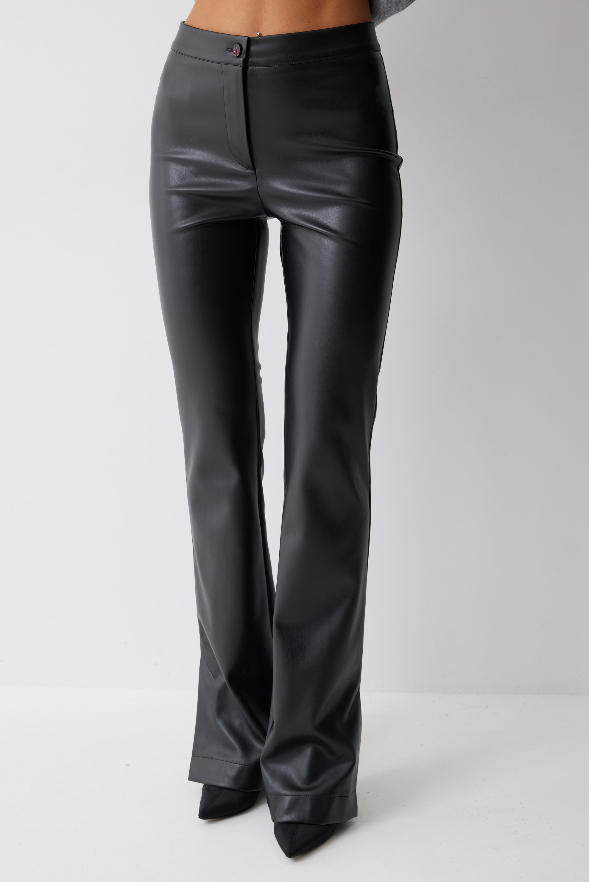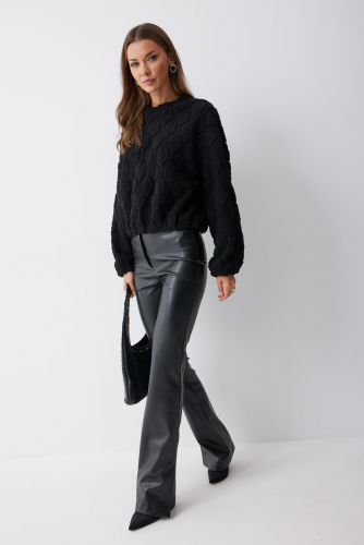 Брюки 4235 (черный) 2550 44-54 Брюки прилегающего силуэта расширенные книзу из экокожи. По верху притачной пояс с застежкой на петлю и пуговицу. На передних половинках обработана застежка молния в среднем шве. По низу брюк в боковом шве шлица.Обращаем ваше внимание, что фурнитура может отличаться от фото. Длина брюк (44-48р – 112+4см пояс)(50-54р - 113+4см пояс)