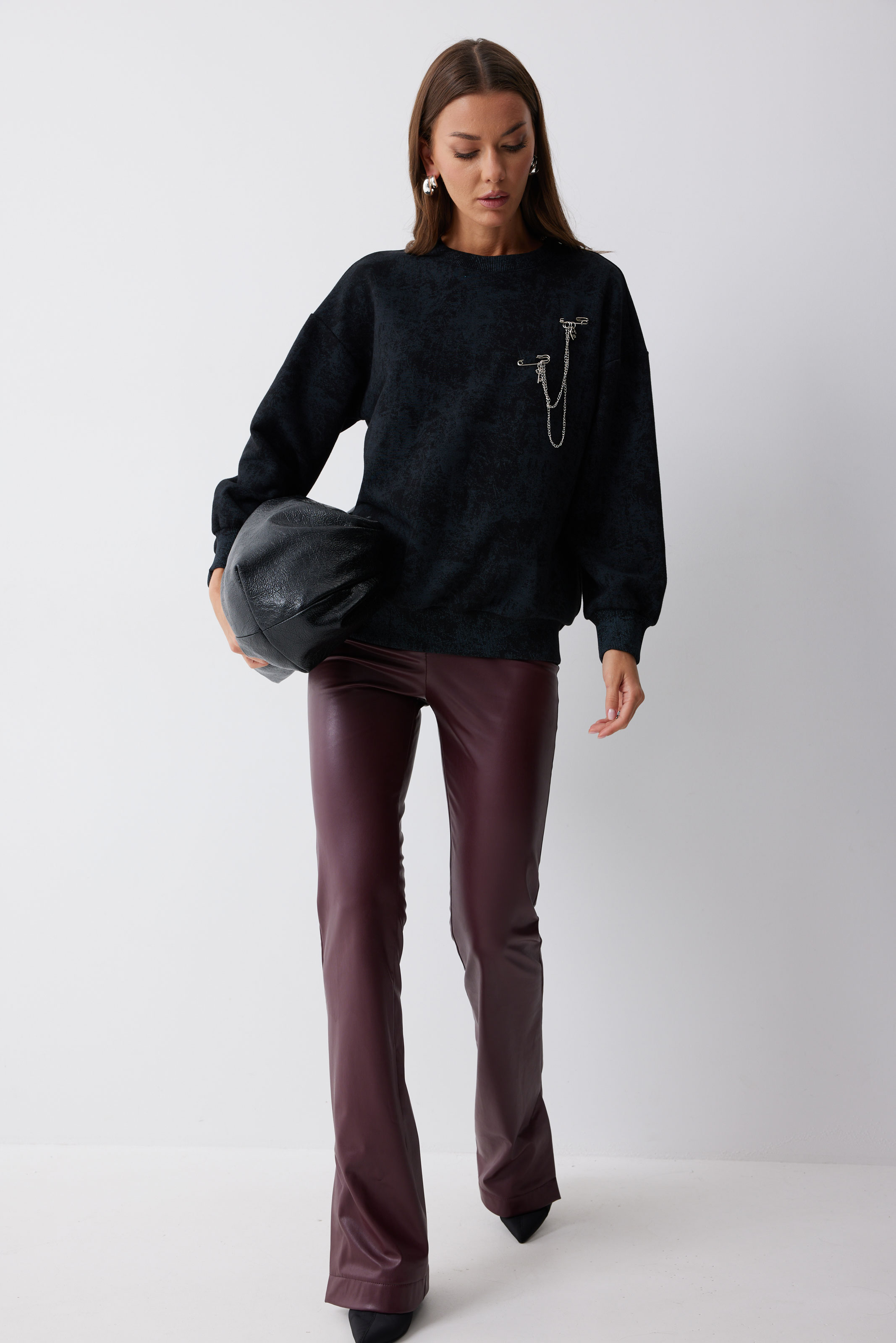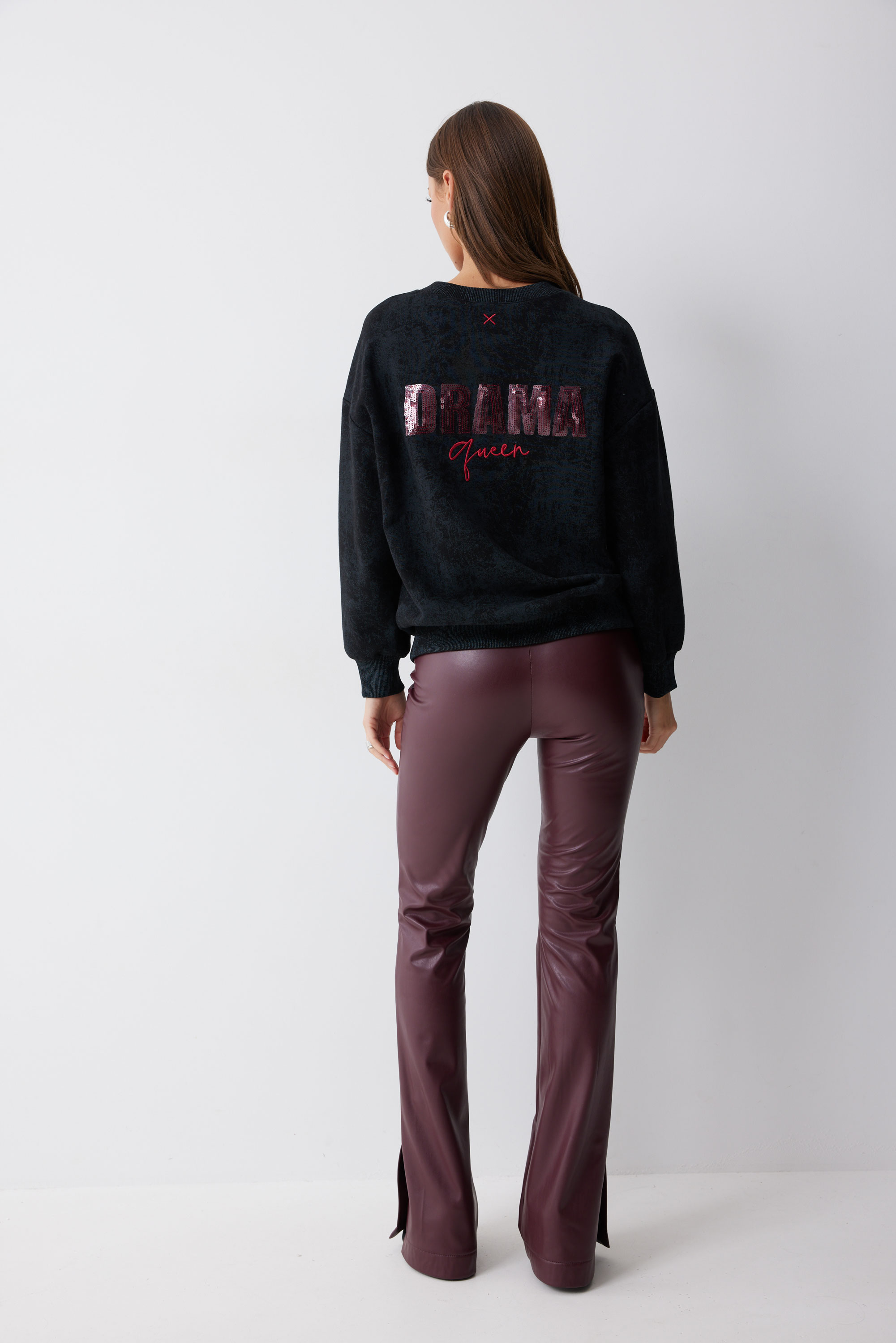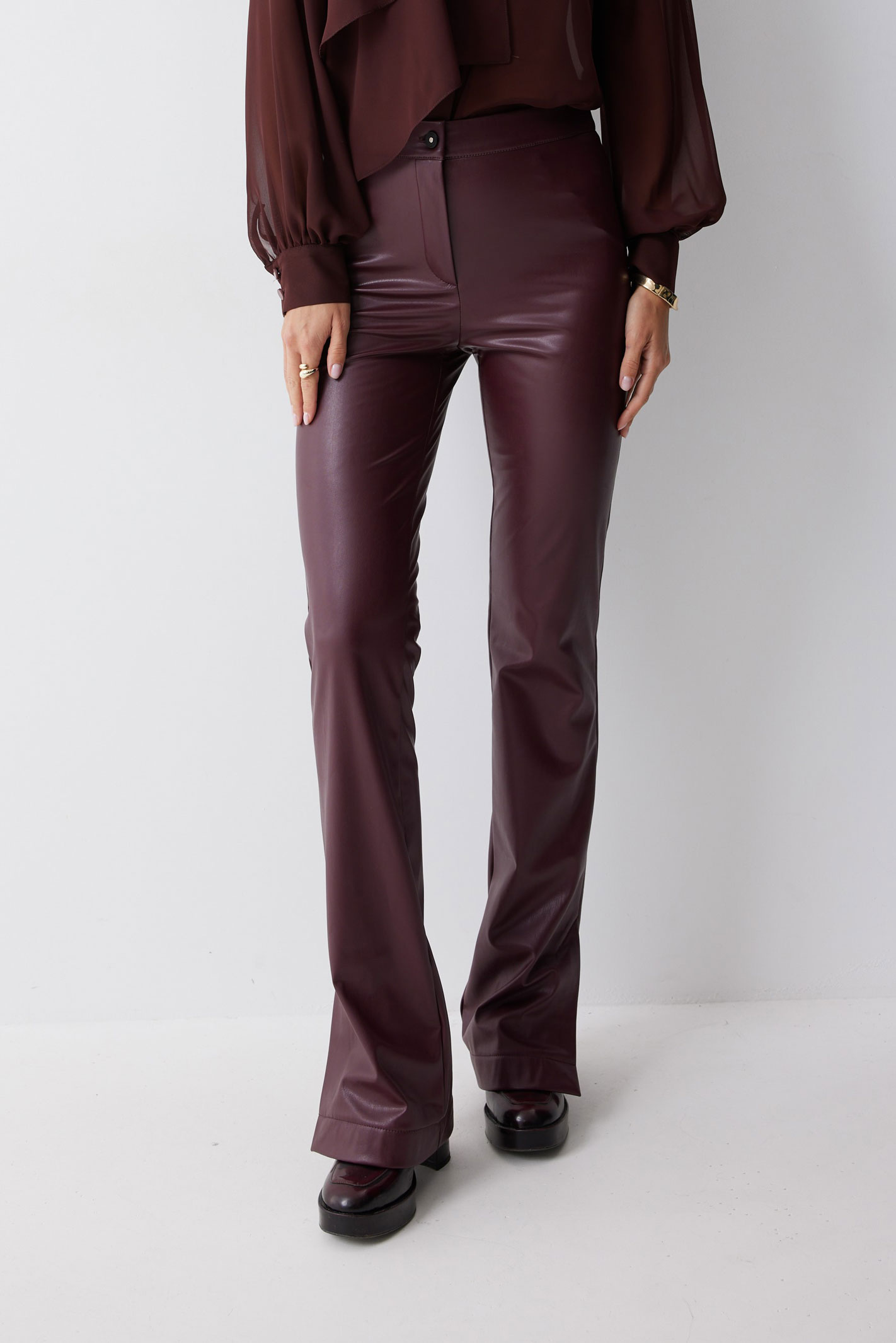 Брюки 4235 (бордо) 2550 44-54 Брюки прилегающего силуэта расширенные книзу из экокожи. По верху притачной пояс с застежкой на петлю и пуговицу. На передних половинках обработана застежка молния в среднем шве. По низу брюк в боковом шве шлица.Обращаем ваше внимание, что фурнитура может отличаться от фото. Длина брюк (44-48р – 112+4см пояс)(50-54р - 113+4см пояс)