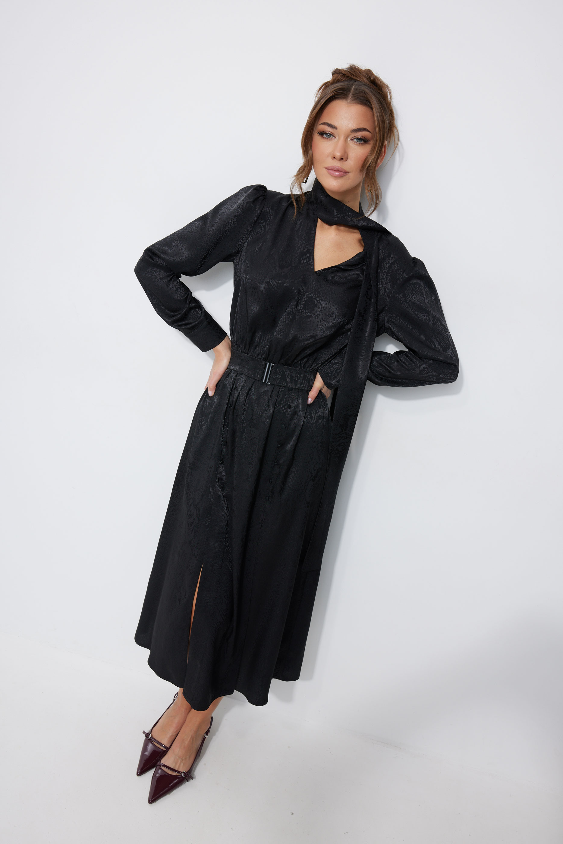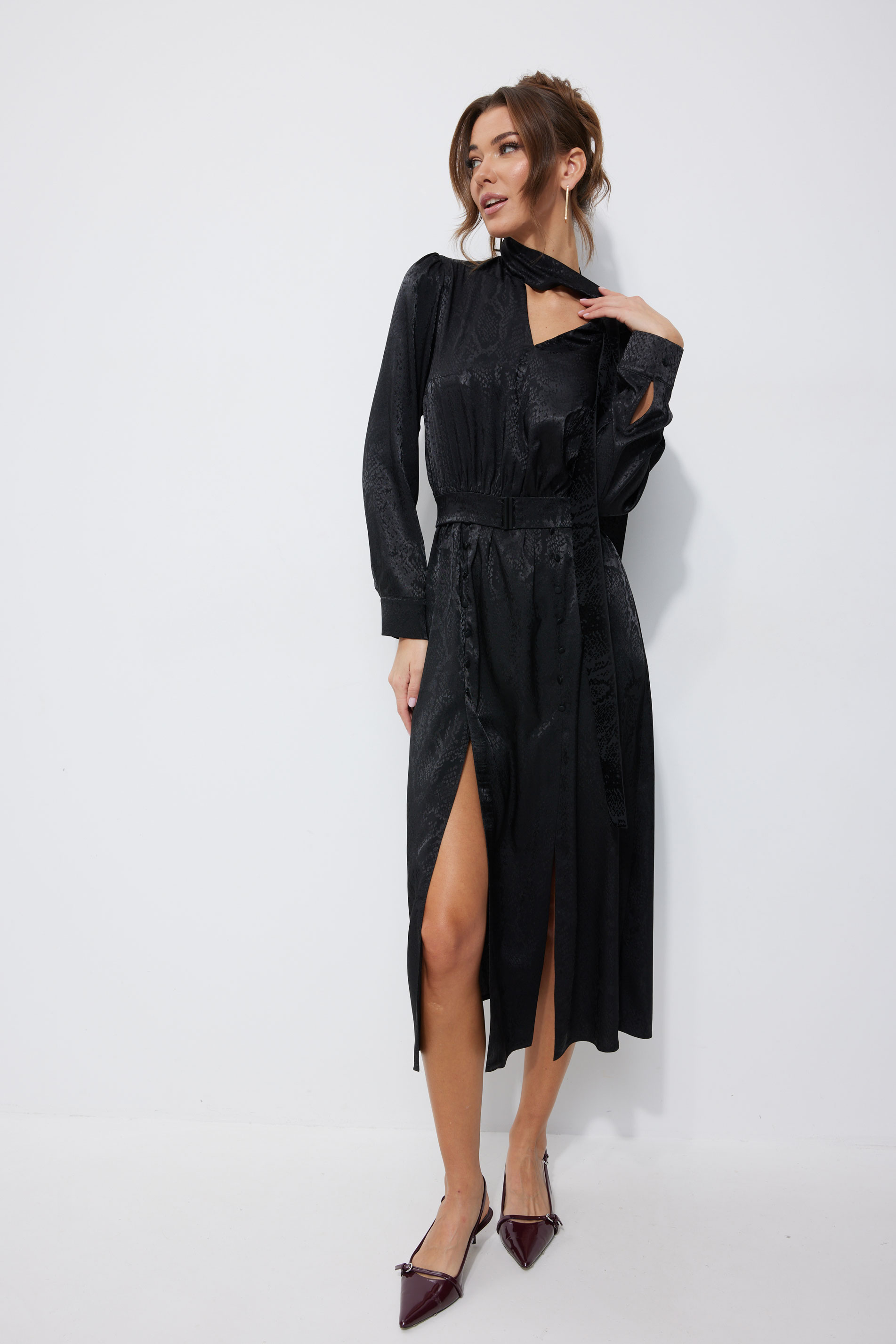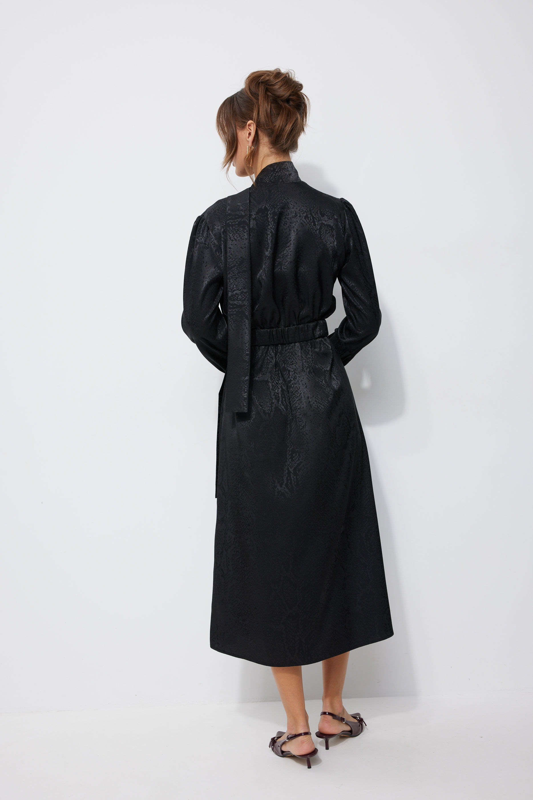 Платье 4248 (черный) 3230 44-54 Нарядное платье из жаккардового атласа с анималистичным дизайном. Платье свободного кроя. Отрезное по талии, с резинкой. Рукав длинный, с манжетой с застежкой на петлю с пуговицей. Платье с мягким воротником-стойкой, переходящим в бант-завязки по переду. По переду V-образный вырез по горловине. По переднему полотнищу юбки шлицы в рельефах, рельефы от талии до шлиц декорированы пуговицами. Платье дополняется съемным поясом из основной ткани, с пряжкой. В среднюю часть пояса вставлена резинка. Обращаем Ваше внимание, что фурнитура может незначительно отличаться от фото. "Длина платья 130 см во всех размерах.